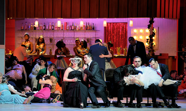 The staging was imported from the Berlin Staatsoper and was the work of the team of Jossi Wieler & Sergio Morabito. It was updated to 1960s USA and the single set was a ballroom, with a bar on one side occupied by serving ladies and a stage on the other. Despite the updated setting the storytelling was actually incredibly conventional. It followed the plot closely with only the second act where Amelia refers to the ‘orrido campo’ not quite making sense. Otherwise it was just a straightforward framework for the action. It brought no new insights but neither was it offensive. I longed for the theatrical dynamism of a Bieito or even the originality of a Tcherniakov.