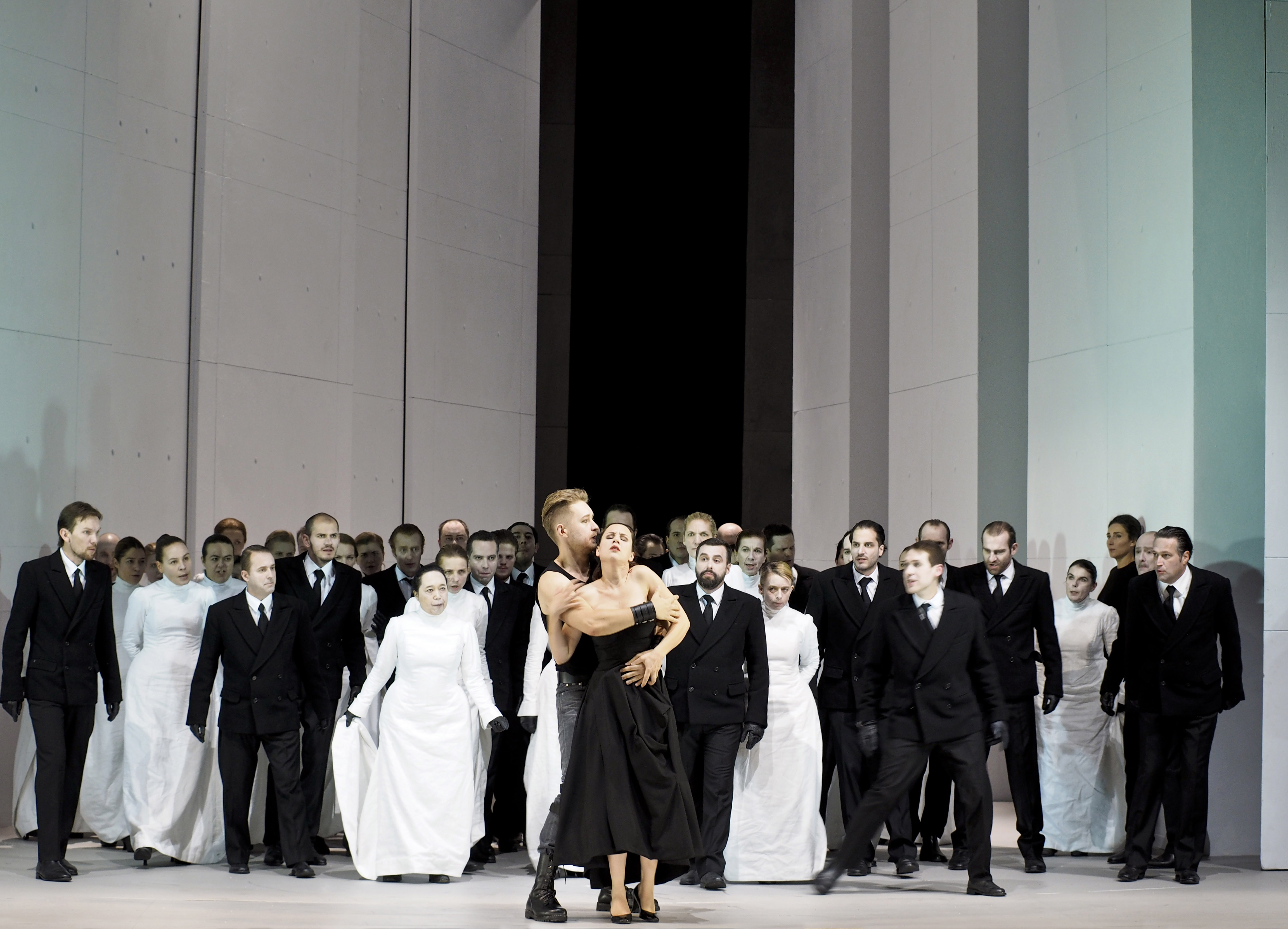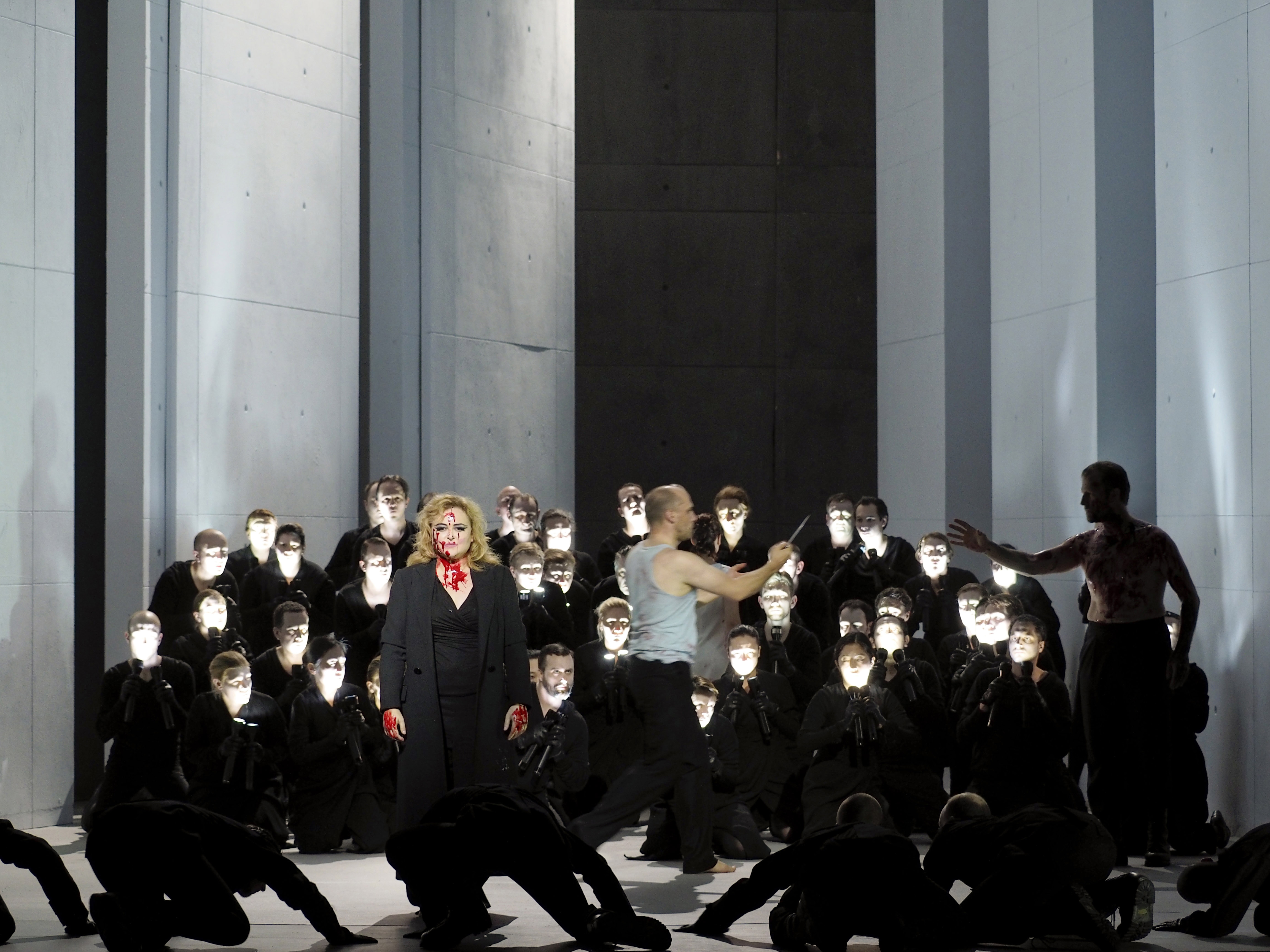 Tonight’s performance precisely encapsulated that spirit of innovation and of creating something new.  It was a highly original and creative take on an ancient story performed at the very highest level by a superb cast.  Naturally, I was intrigued as to how they would combine the two operas.  Effectively what we got was a truncated version of Aulide which led seamlessly into Tauride.  Torsten Fischer’s staging showed great originality and logic.  During Aulide, Diane was a constant presence on the stage, watching and reacting to the events unfolding.  As we were moved to Tauride, Diane became Iphigénie and in the final scene the Aulide Iphigénie reappeared but this time as Diane.  Likewise, Aulide ended in the brutal throat-slitting of Iphigénie.  During Tauride, the ghost of Clytemnestre was ever present, observing the scene.  There was a simplicity to the visuals with characters almost exclusively wearing black or white.  Vasilis Triantafillopoulos’ set design was ingenious.  A revolving structure, it continuously gave us new angles on the action and characters and was designed in a way that the stage pictures were constantly changing.  It had a fluidity that was totally captivating and gripping to watch.  Likewise, Fischer gained exceptional performances from a highly accomplished group of singing actors.  The juxtaposition of these two works led to a real sense of the events of the former, feeding into the latter.  The only small downside was musical – not so much for Tauride which was performed almost in its entirety – but due to a number of cuts, Aulide felt somewhat bitty.  Make no mistake however, this is an outstanding piece of theatre.