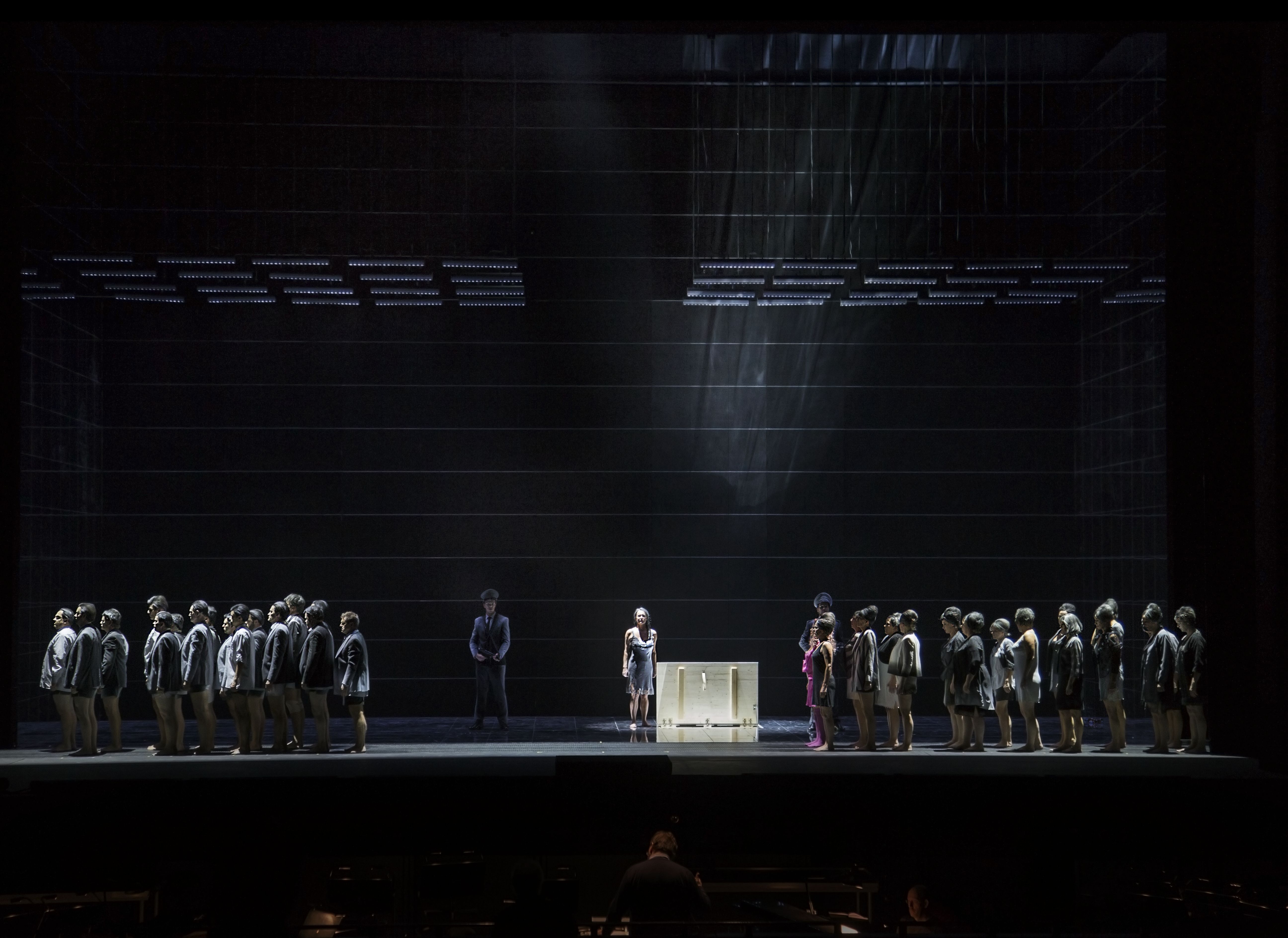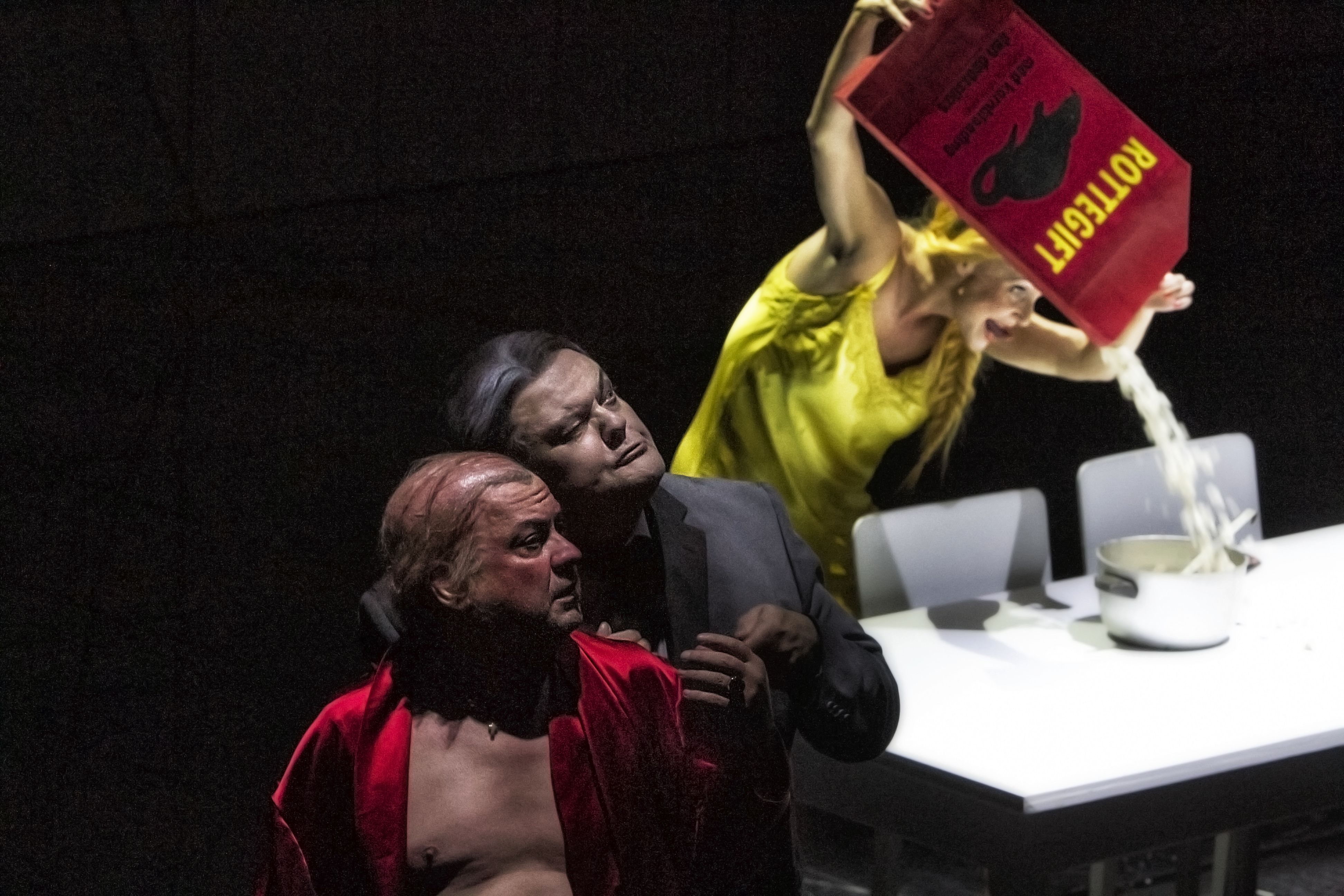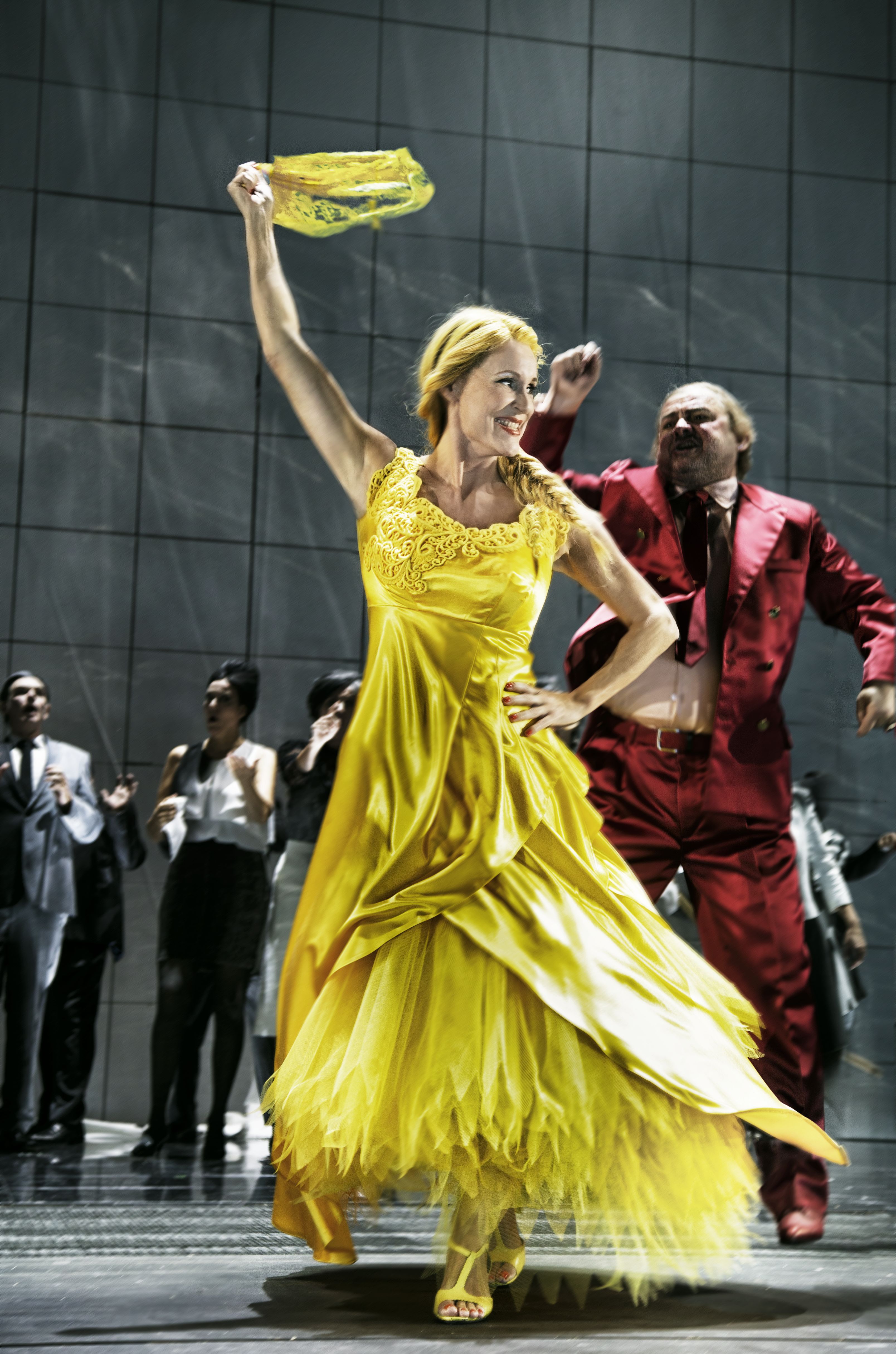 Peter Konwitschny is known a fascinating director – one who can thrill and frustrate in equal measure and this version of Lady Macbeth of Mtsensk was never less than interesting. If I felt that it really only hit its stride in the final scene, this is in no way a reflection of the outstanding dedication of this vast cast or the excellence of the singing. The action almost completely takes place in a white tiled room. The chorus is dressed in grey and black, while the principals are dressed in bright colours – yellow for Katerina, red for Boris, blue for Sergei. The stage curtain drops during the interludes and its colour changes to match the colour of the character who is the focus of the previous scene. The main issue in this for me was that the bright colours gave the performance more of a cartoon quality than was absolutely necessary as if unwilling to take the work seriously. In the sex scene with its salaciously filthy orchestration, this approach worked well. However, in the opening scene, with Katerina goose-stepping around the stage like a petulant teenager, we didn’t really get a full impression of the complicated combination of boredom, petulance, calculation and vulnerability of Leskov’s character.
