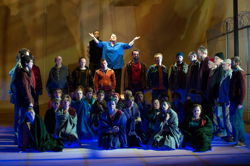 Peter Sellars’ libretto had some unfortunate moments and there were times when it made as if to keep the audience at arm’s length rather than bringing it closer. There was an awkwardness to some of the text that was less than convincing and I couldn’t help but thinking that it could have benefitted from having someone rewrite some of the passages. The staging however was captivating. Set in what appeared to be a prison camp surrounded by barbed wire and overlooked by CCTV, there was a sparseness that put the attention entirely on the singers and fine dancers. Shamefully, ENO did not publish the biographies of the dancers – Banks, Stephanie Berge, Ingrid Mackinnon and Parinay Mehra in the program – this really should have been rectified, perhaps through a loose insert. The choreography was mesmerizing with movement of dazzling rhythmic complexity and ability. There were some real coups de théâtre – as Lazarus was resurrected, one of the dancers slid under the surface of the stage. The scenes of police brutality were extremely difficult to watch and despite, or perhaps because of, the signature Sellars hand-movements, the Personenregie felt absolutely connected with the abstract nature of the work.