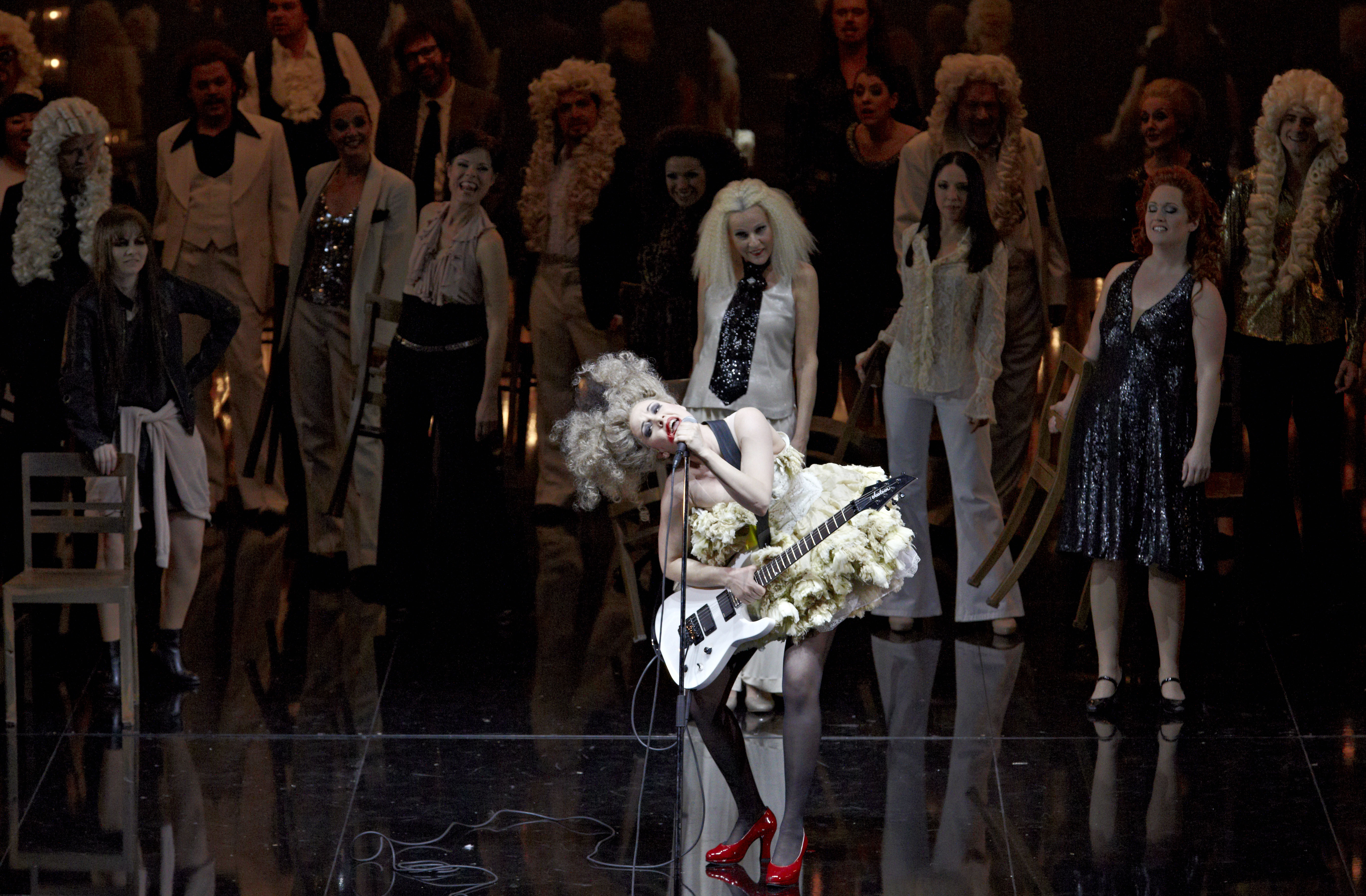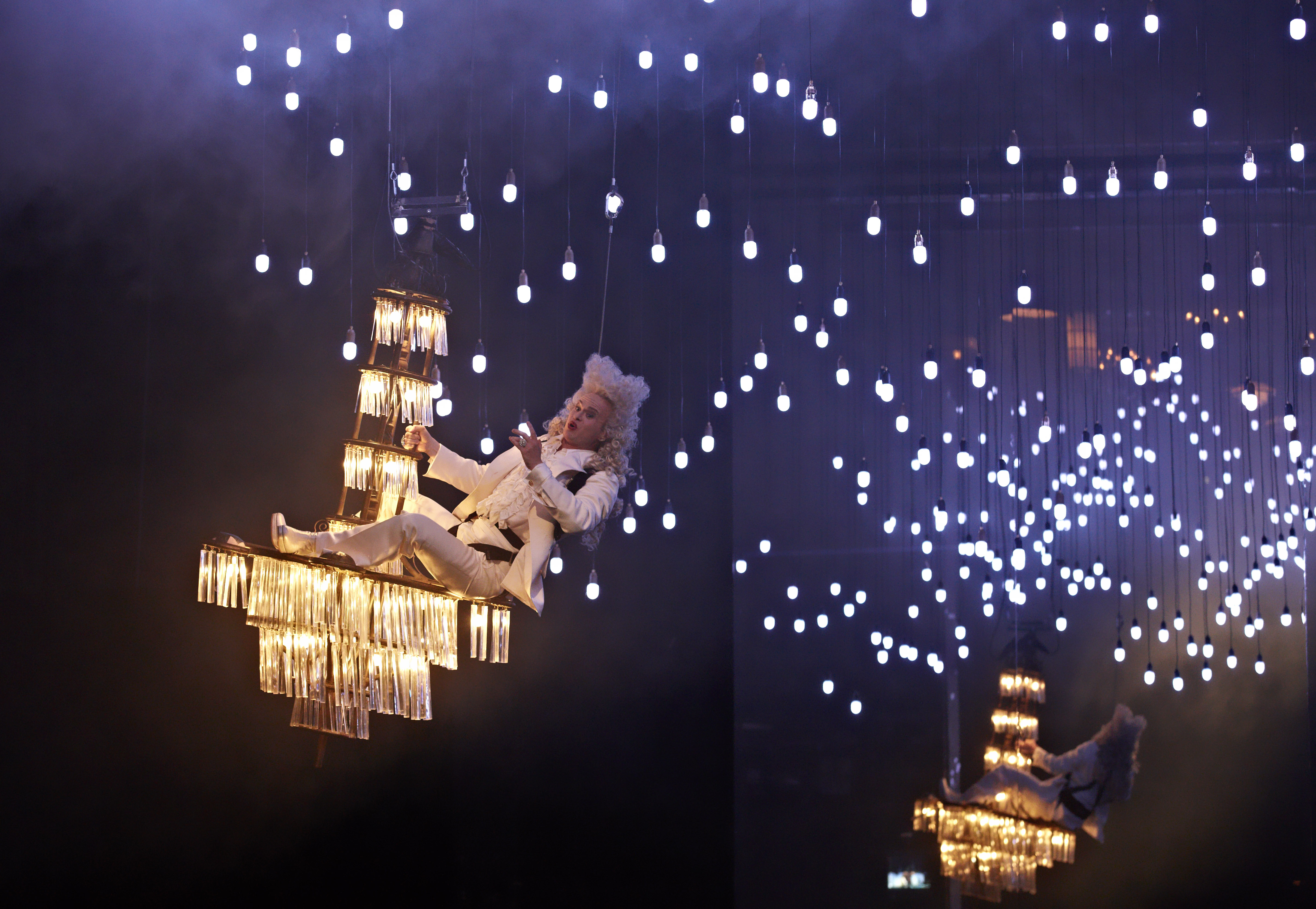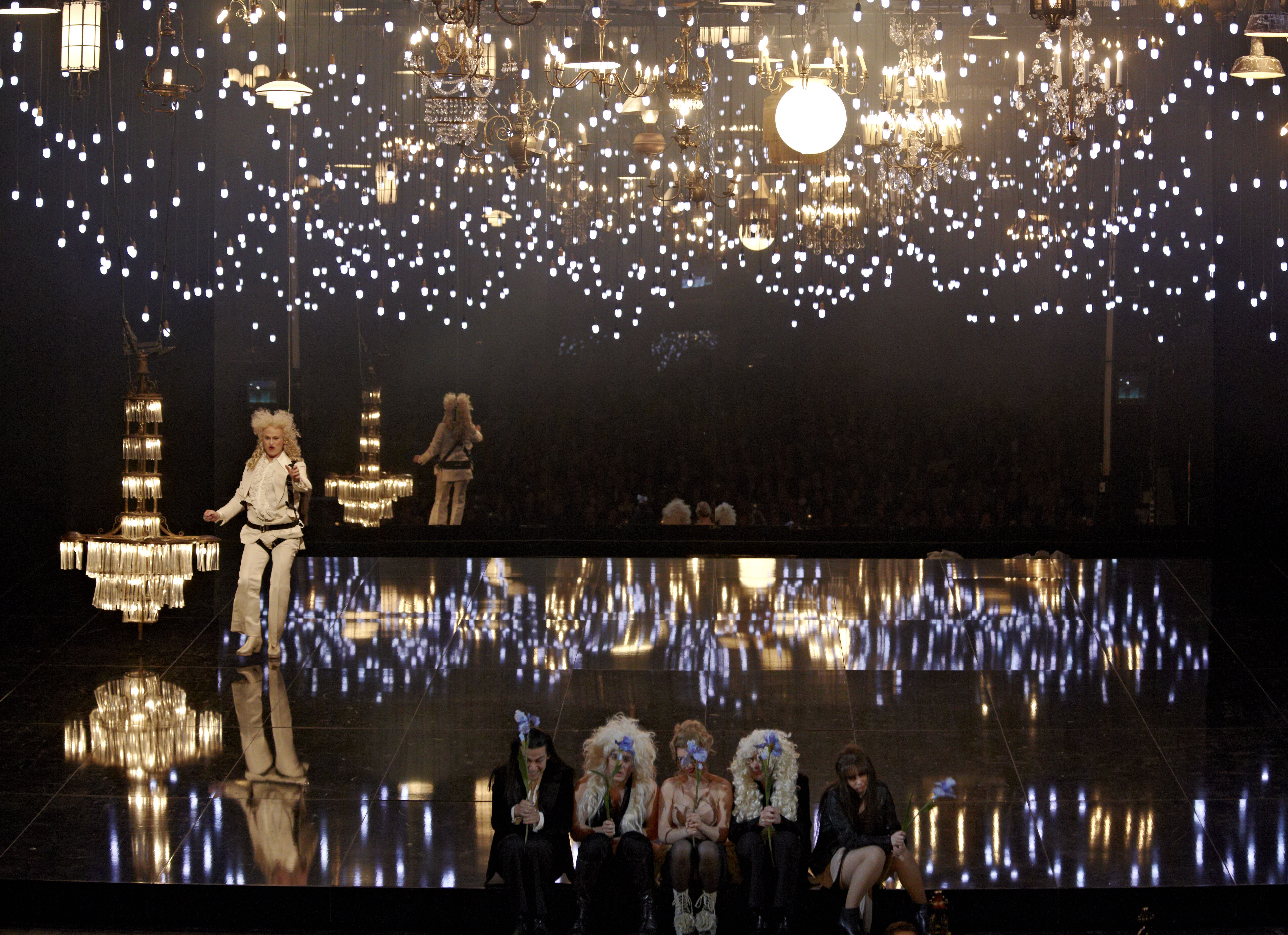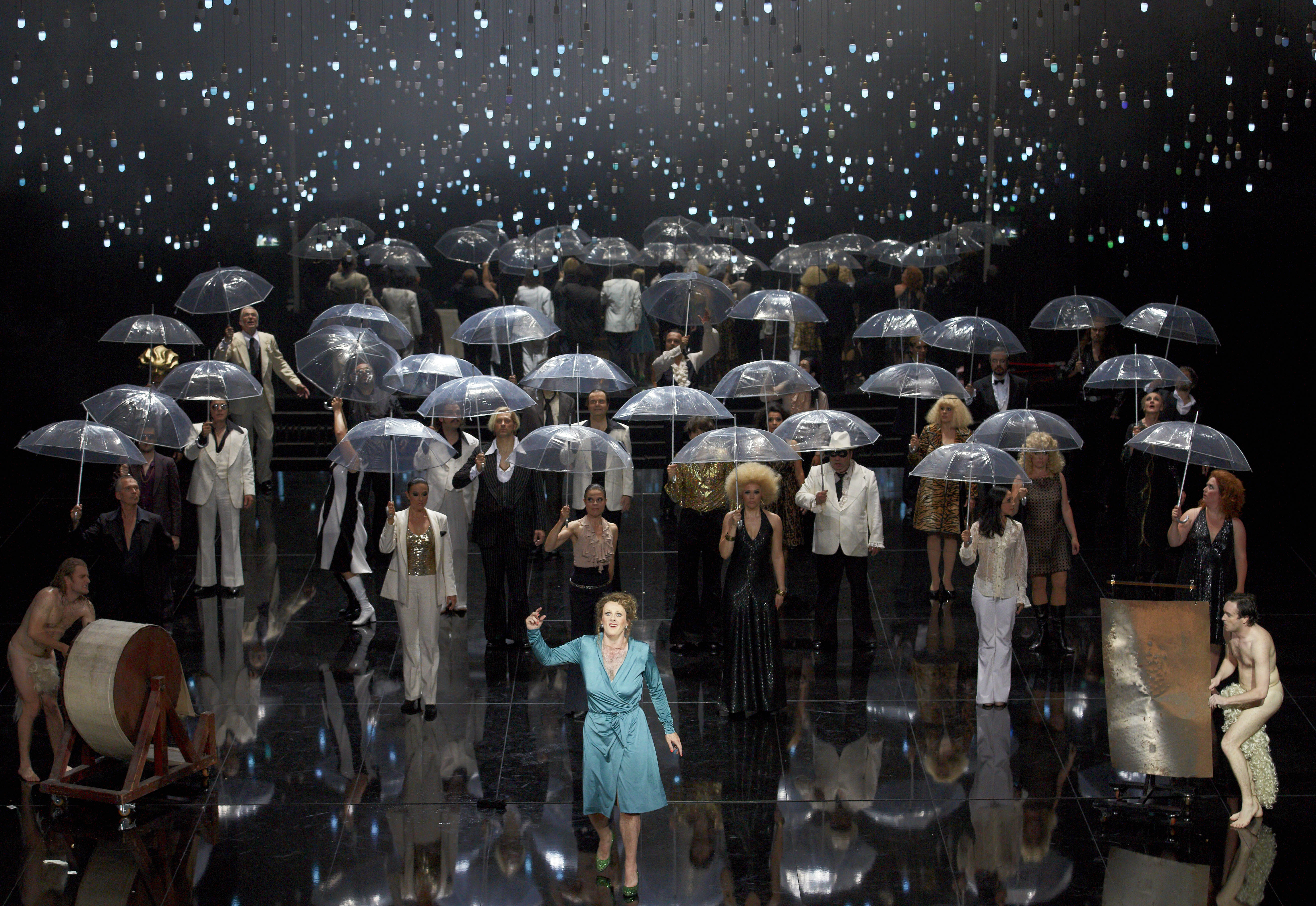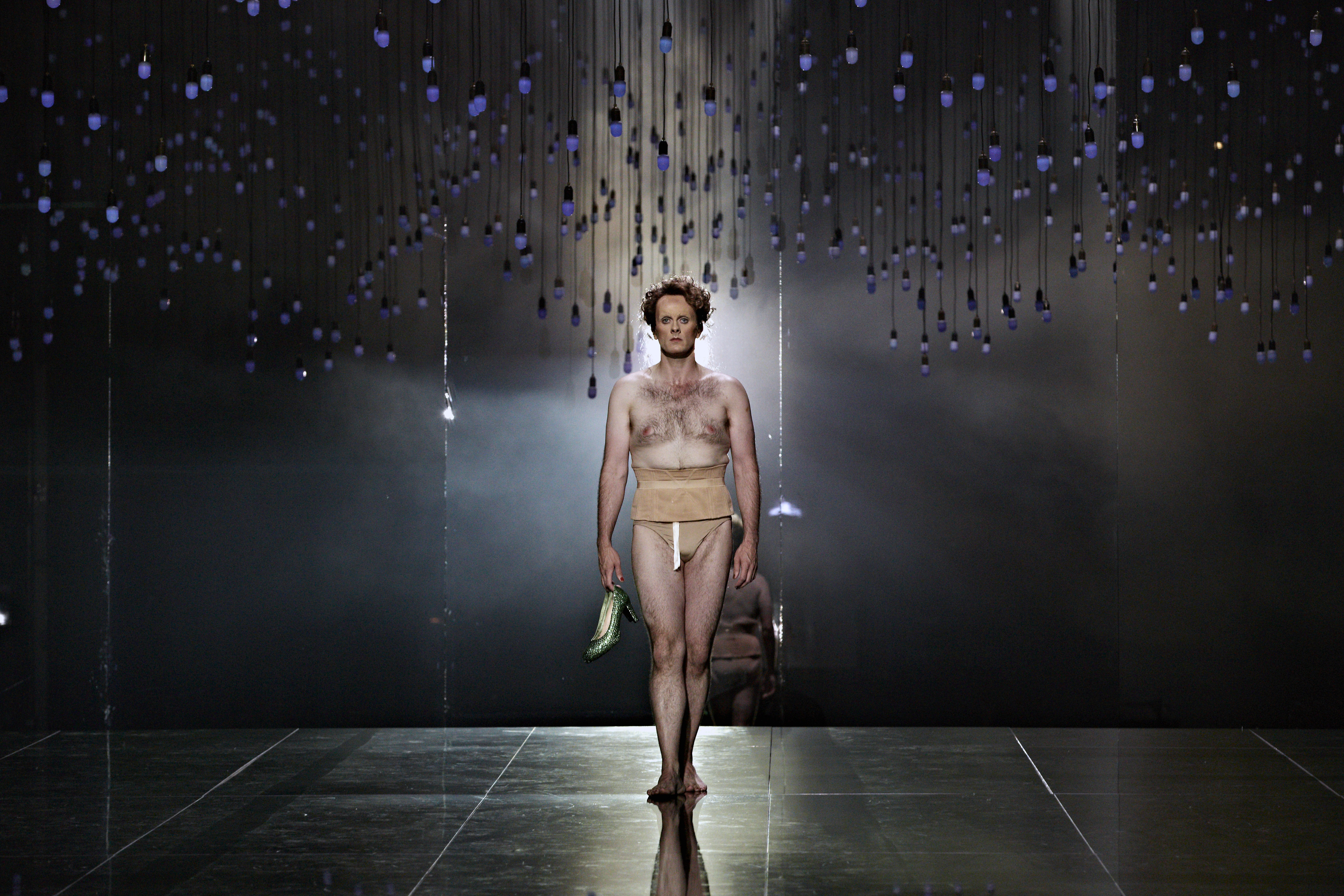 In a way, tonight’s staging had a similar impact. For Bieito, Platée is a work about finding the beauty in everything and how conventional society frowns on anything that is considered different. As a result you have a semi-naked plus-sized lady devouring a giant Jell-O penis as Bacchus, la Folie as a bipolar, drugged-up rock chick and of course Platée herself. We are introduced to Platée as very much a man. Gradually he transforms into fully assuming her identity as a woman. The way that he portrays Platée’s journey from acceptance of herself in her feminine state and her ultimate rejection by Jupiter is absolutely devastating yet not missing the comedy as part of the journey. The show ends with Platée alone on stage, the male nakedness predominating, crying out. In many ways, this explores a common theme in many of his shows, that sense of the individual pitted against conventional society, the way masses impose conventional views on others. Yet even these masses seek approval from others in a similar, though different, way to Platée. In the prologue, set in a well-lubricated party, the ensemble is faced with a large mirror at the back of the stage. As the lights go up, they are forced to confront their true images and they’re not happy with what they see. Their excess is a way of escaping their own reality whereas for Bieito, those who are true to themselves perhaps ultimately have a better chance of happiness. Lit with great imaginativeness by Reinhard Traub, there were so many ravishing stage pictures that were quite wonderful to look at.