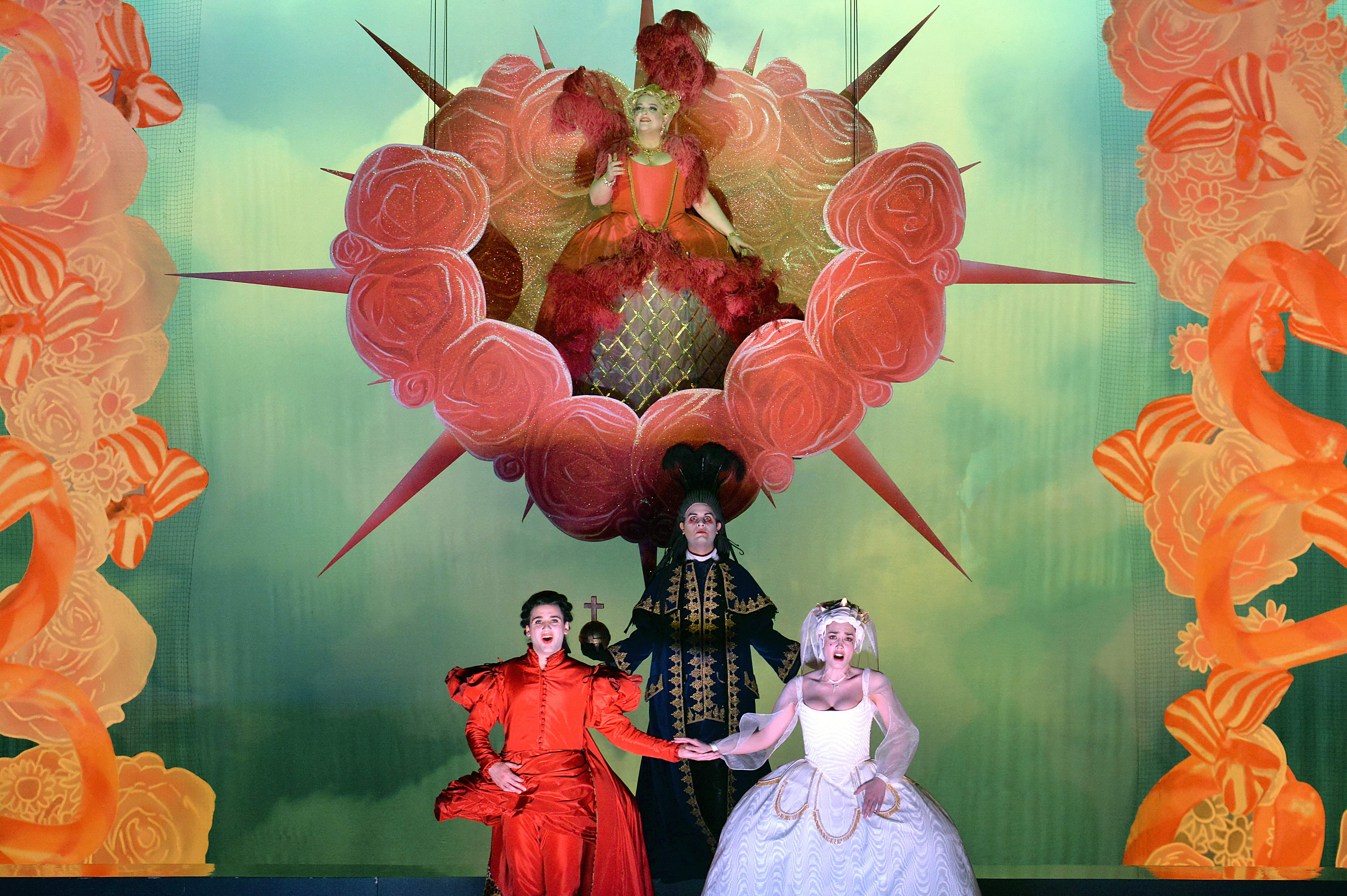 The production itself was interesting. Visually ravishing, the stage reflected the beauty of the auditorium with the chorus mainly singing from boxes that matched those in the house itself. The action took place in the centre of the stage with characters emerging to the front as necessary. The most striking entrance came from Karina Gauvin’s Vénus who in act 4 descended from the flies on an enormous rosebush, wearing a shocking pink dress and a huge feather headdress. She looked like she loved every moment of it.