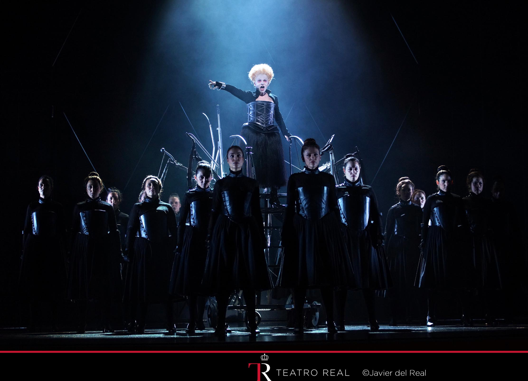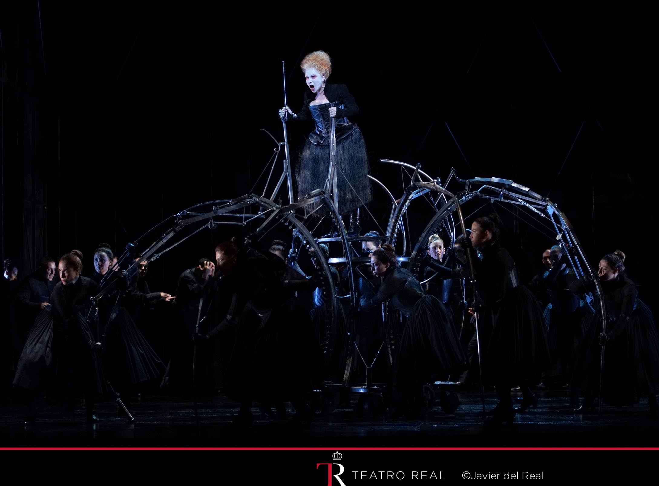 The sets (Madeleine Boyd) were utilitarian ultimately due to their having to be used on tour. Nevertheless, Talevi gave us a show of striking visual impact, transcending the necessary sparseness of the sets with some highly effective stage pictures and lighting effects (Matthew Haskins). The stage was dominated by the colour black and the constant presence of the chorus as guards or minsters pointed to the claustrophobic society in which the action took place. This was a society that, on the surface, treated its queen with the utmost reverence and in turn the outward signs of Elisabetta’s rule were manifested in the almost mechanical behaviour of the court not to mention the murderous silencing of dissent. Indeed, in one major coup de théâtre the sound of the cannon coincides with the lighting illuminating the severed heads of those who went before. In effect, Elisabetta’s rule was a totalitarian one, her influence maintained through arachnid threats. In the first act we saw a large spider in a glass case and in the second we see Elisabetta pursuing Roberto on an enormous mechanized one. At the end as Elisabetta ceded the throne, the reaction of those around her was one of bewilderment as if completely unable to rationalize how they could deal with her departure.