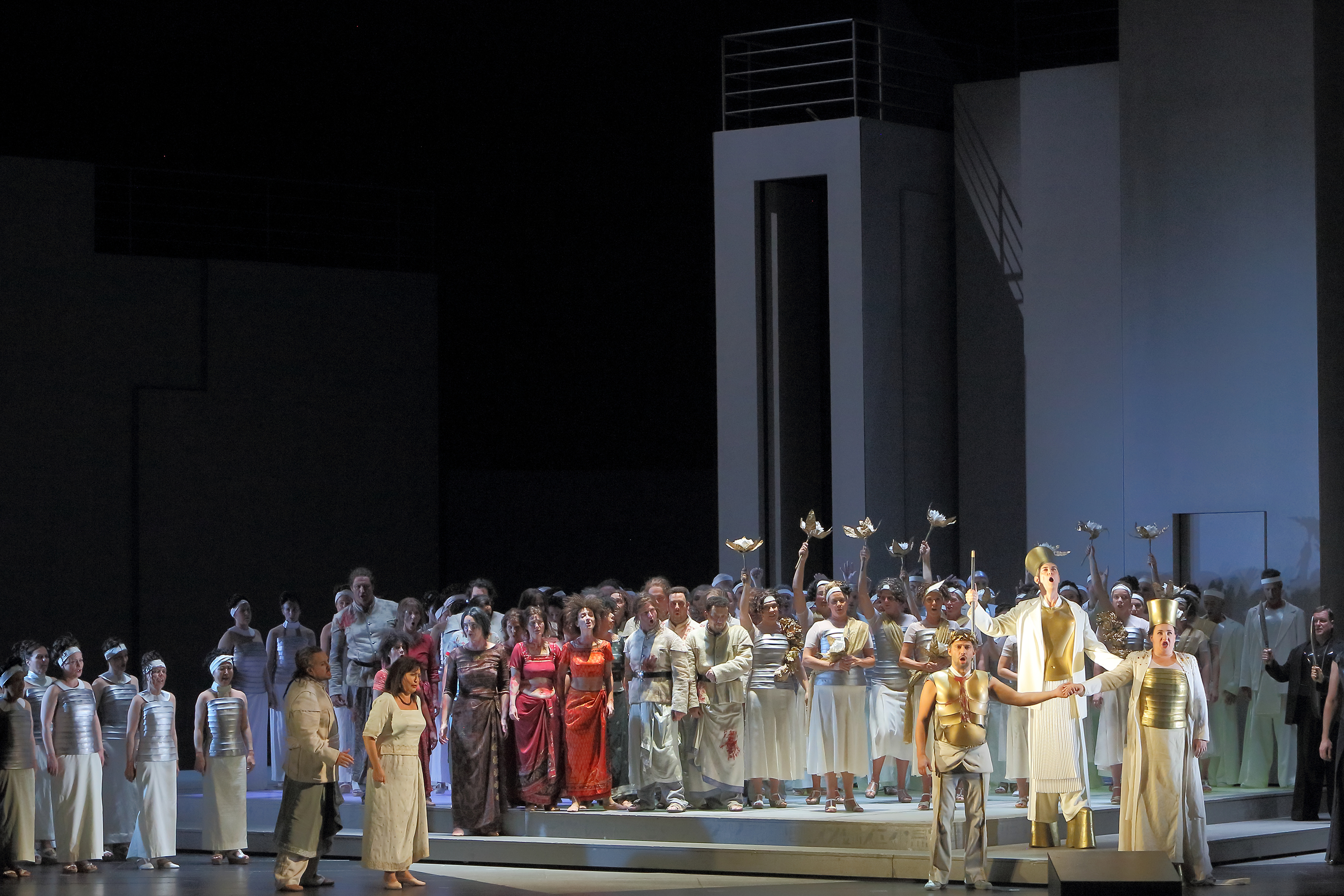 The orchestra played well for Dan Ettinger, though I’m sure they could play this score in their sleep. He did maintain excellent coordination with the vast forces in the triumphal scene. His conducting didn’t draw undue attention to itself apart from an enormous rallentando in the triumphal scene that seemed to come from nowhere and served no apparent musical purpose. The chorus was fine, singing with good blend and ensemble despite the fact that they were constantly being revolved around on the stage.