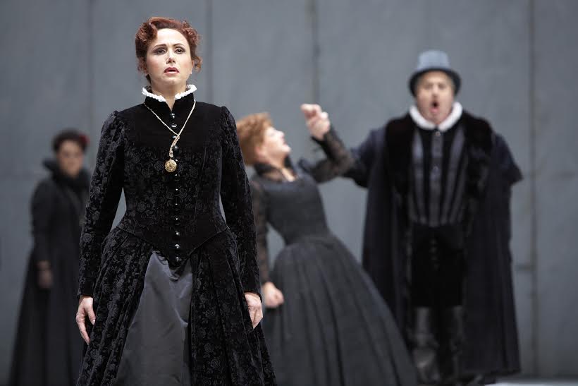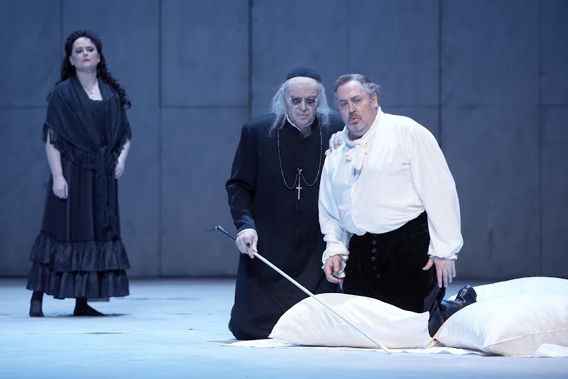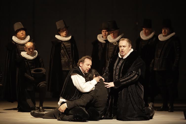 Peter Konwitschny’s production is already 14 years old and has been seen widely both in Hamburg and in Vienna. It was received warmly by the audience tonight. For me, Don Carlos is a work that reflects on the corrosive power of religion on the state and how that affects those with and in power, and those close to them. Konwitschny’s staging on the other hand envisions the work as domestic tragedy, one that removes the context from the work and instead focuses on the love triangle. In a way, it could be said that Konwitschny is universalizing the work and making it more immediate to the audience, yet I’m not convinced he achieves that. The main issue I have with the staging is how he mounts the auto-da-fé. As the audience exits for the interval following act 3 scene 1, the ushers hand out instructions for the next part. These include an invitation to follow the King and Queen into the theatre as they make an entrance through the auditorium and to take the closest seat rather than the one allocated. During the remainder of the opera the costumes worn are traditional 16th century garb, however during the auto-da-fé the entire cast changes into modern evening dress and then change back for the last two acts. The end of interval chimes are replaced by an announcer talking about how big this experience is. The house lights stay up for the whole of the scene and the audience wandered around and took photos, texted and various other normally verboten behaviours. The result of this was that the magnificent music got completely lost under the sight of people walking in whenever they felt like it and a scene completely foreign to the rest of the staging. In a way, it felt that Konwitschny’s point was that this grand scene does not fit with the rest of the opera being about the relationships between individuals. The problem for this observer was that it denied the work context, removed the focus on the oppression of religion and meant that the conflict between the church, state and individual was barely explored.