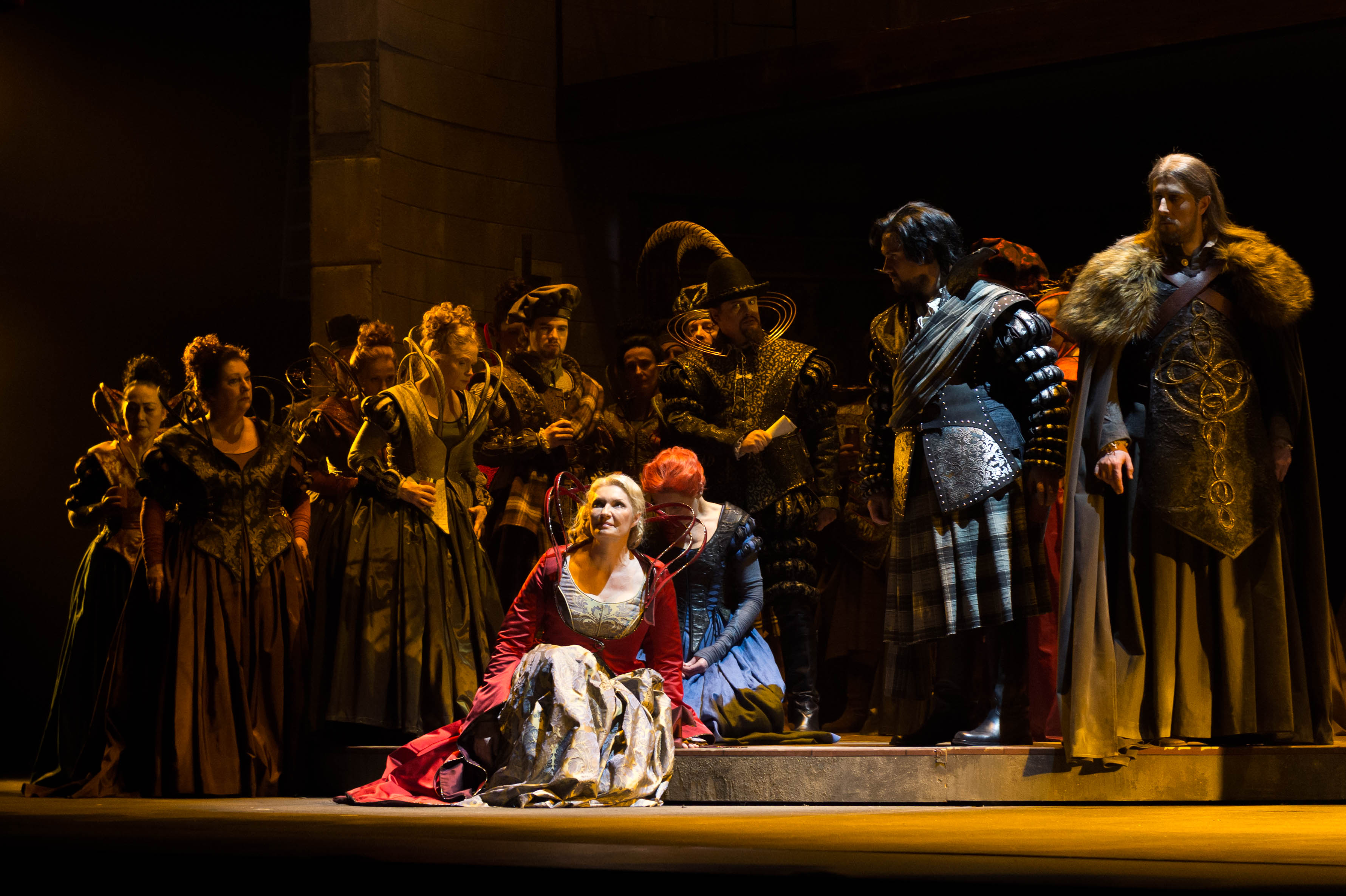 This production of Lucia was the work of Stefano Mazzonis di Pralafera who is the General Director of the company.  In his detailed program note he wrote about how he had clearly thought about the setting and the relationship between the libretto and the original novel.  This was a very classic staging – one where the gentlemen wore tartan kilts and the ladies long, flowing dresses.  There was a lot of standing and delivering and a fair bit of falling to the floor with Enrico in particular seeming to have a thing for pushing other characters to the floor.  There was one very striking moment where Lucia at the start of her mad scene appears carrying Arturo’s severed head which she then tosses nonchalantly to the crowd.  Personenregie seemed rudimentary, the Act 2 finale was basically sung with everyone facing the front and characters addressed the front as often as they addressed each other.  For a new production, it looked much older than it was and yet ultimately perhaps that was the point.  Mazzonis di Pralafera clearly wanted to prioritize the singing, and we certainly had some excellent singing, it’s just that for me, I would have liked to have had much more urgency in the acting and the setting.  This is a story of extreme passion and I’m not quite convinced we got a full sense of that.