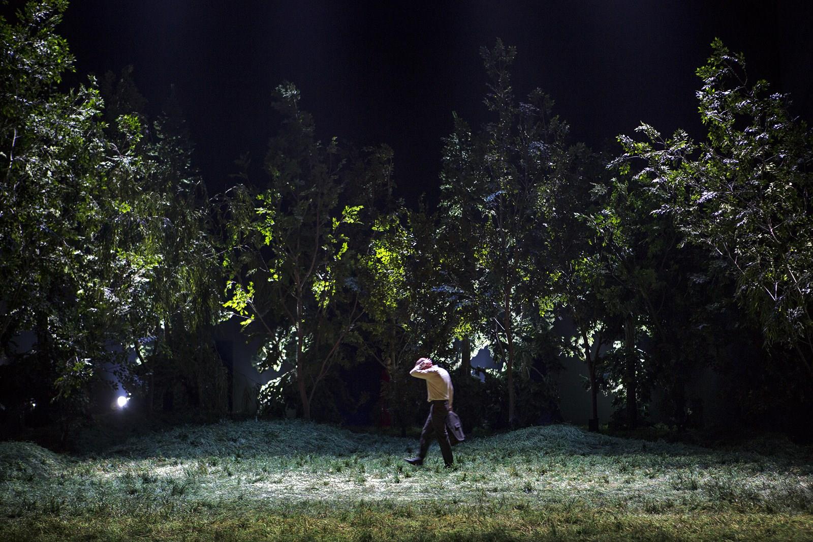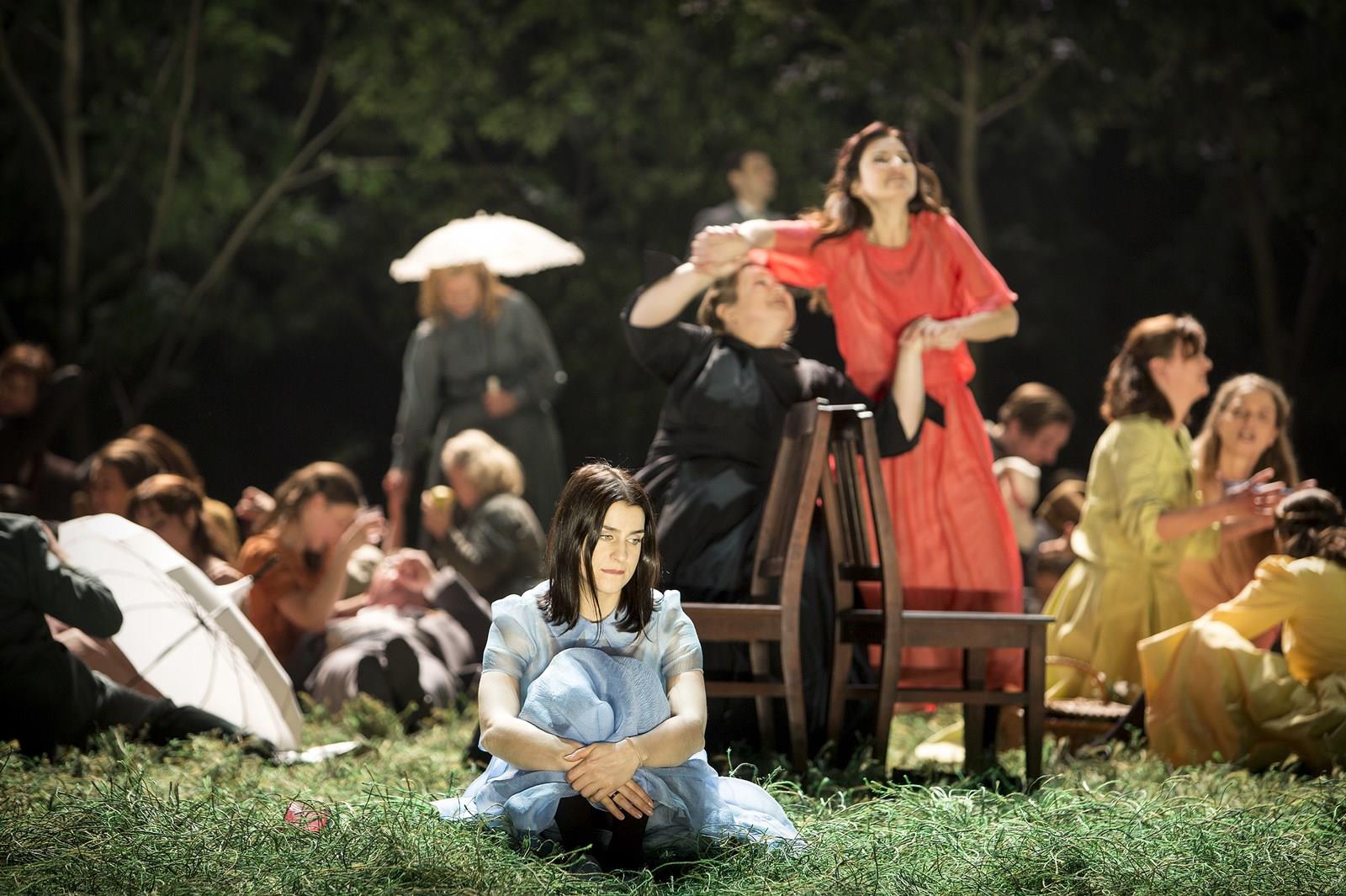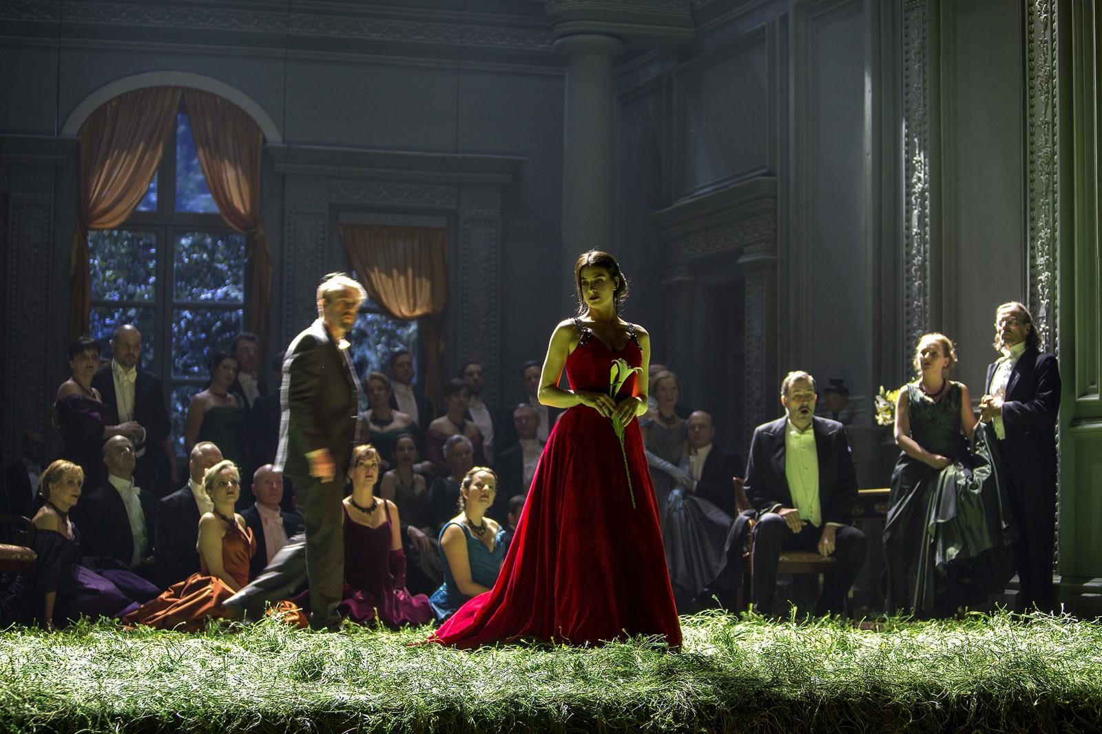 Perhaps inevitably with the focus on Tatyana, much less is made of Onegin than in other productions. Tonight, Onegin didn’t actually sing until the quartet – I’m not sure if this was a missed call or whether it was in fact part of the Regie, but it reinforced the sense of him being less of a concrete personality than one normally sees, certainly combined with the fact that so much action takes place off stage. The sets (Rebecca Ringst), place most of the action in a field surrounded by a forest with the sole exception being the Gremins’ party taking place in an apartment built inside the field. As Onegin comes to realize his mistake in rejecting Tatyana, the apartment is dismantled and the final scene plays out in the field in a rainstorm.