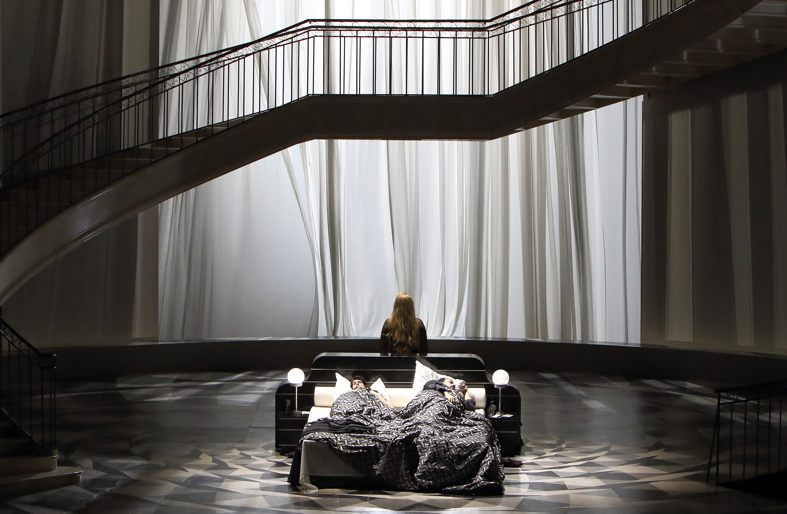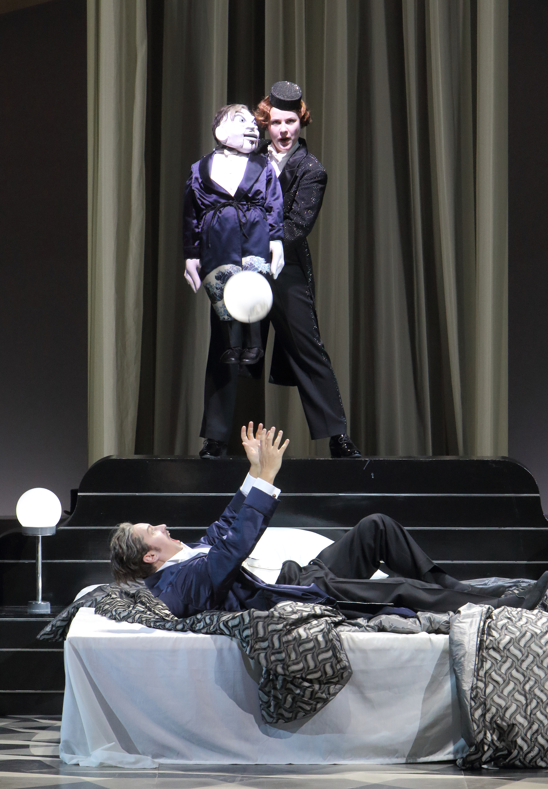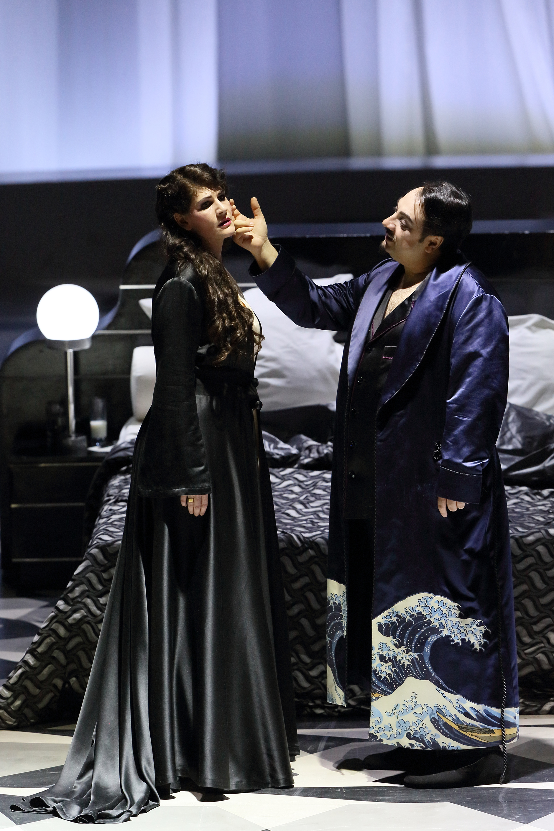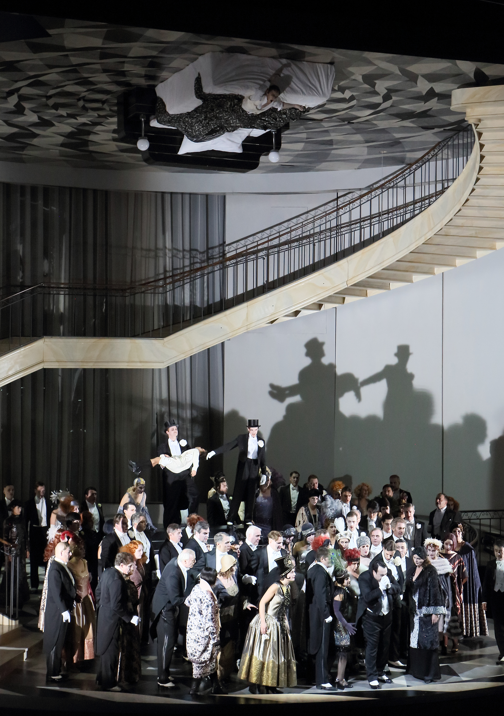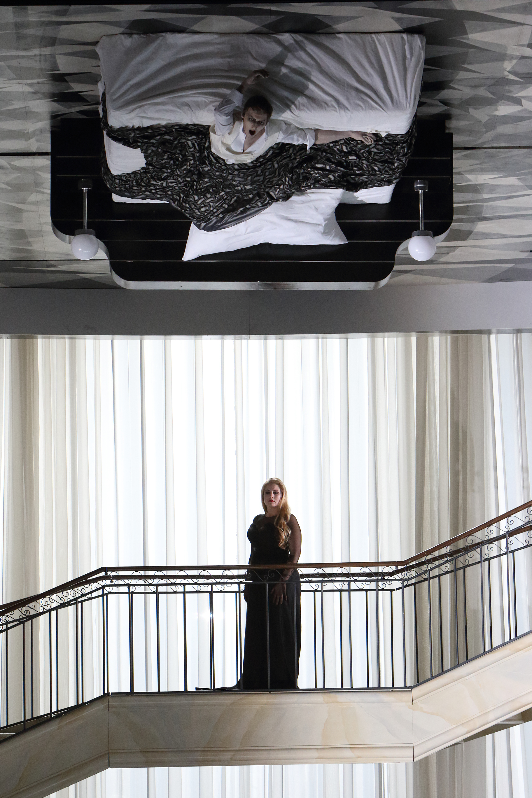 In Act 2 of Un ballo in maschera Amelia sings to Riccardo ‘Ahi sul funereo letto ov’io sognava spegnerlo gigante torna in petto’. The ‘funereo letto’ is a constant presence in Johannes Erath’s staging seen hovering above the stage with an immobile male figure lying on it. Clearly, Riccardo’s fate had been foreseen from the very beginning. Ulrica is also a constant presence on stage, seen as the curtain opens and at the end, it is she who is in control of the destiny of the characters. This Ulrica is less of the fanatical seer that we normally get than a subtle, thoughtful figure whose presence is the cause of the events that we witness. A single set (Heike Scheele) with another funereal bed as its centrepiece is the framework for the action looking like a 1930s grand hotel with costumes (Gesine Völlm) also redolent of that period. Occasionally characters, particularly Oscar and the chorus, will indulge in vaudeville-like dance routines that sit appropriately with some of Verdi’s more up-tempo moments, Erath seemingly aiming to bring out the ‘tragedia mutò in commedia’.