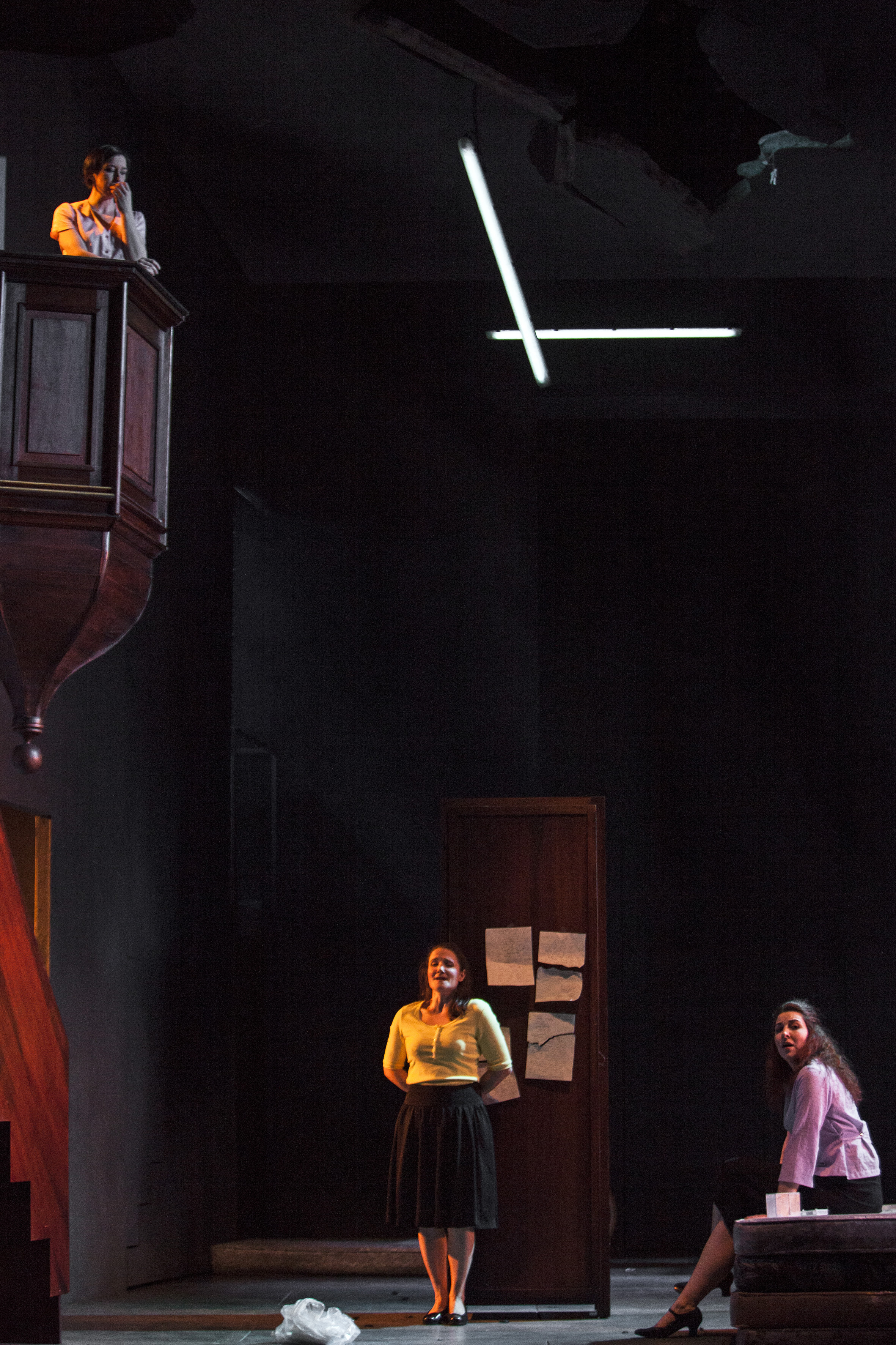 In many ways, the metaphor of a society traumatized by violence is one that is incredibly powerful in Brussels right now and it is clear that the theatre wished for it to be a kind of catharsis for the residents of this wonderful city. The sets (Anouk Dell’aiera) and costumes (Claire Risterucci) reflect a post second world war city, with holes in the roof through which the rain pours in and sepia tints in the set design and costumes. There is even an extremely homoerotic moment where the gentlemen of the cast disrobe and bathe, fooling around with each other in high spirits. Some mobile closets create plentiful opportunities for playing with characters hiding from each other. Yet, the overall sense I had is of a staging that took a tangent and never really got back onto course.