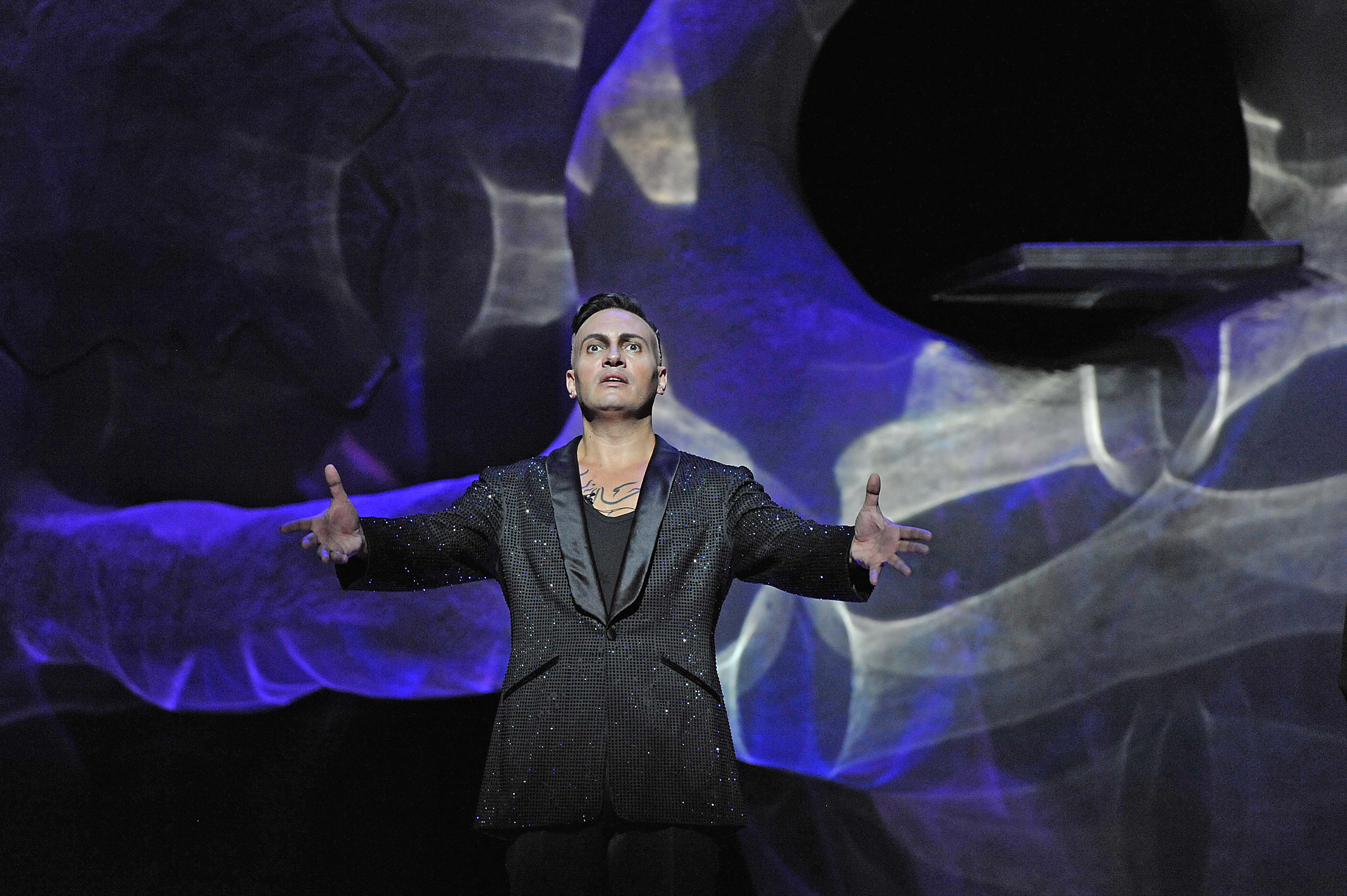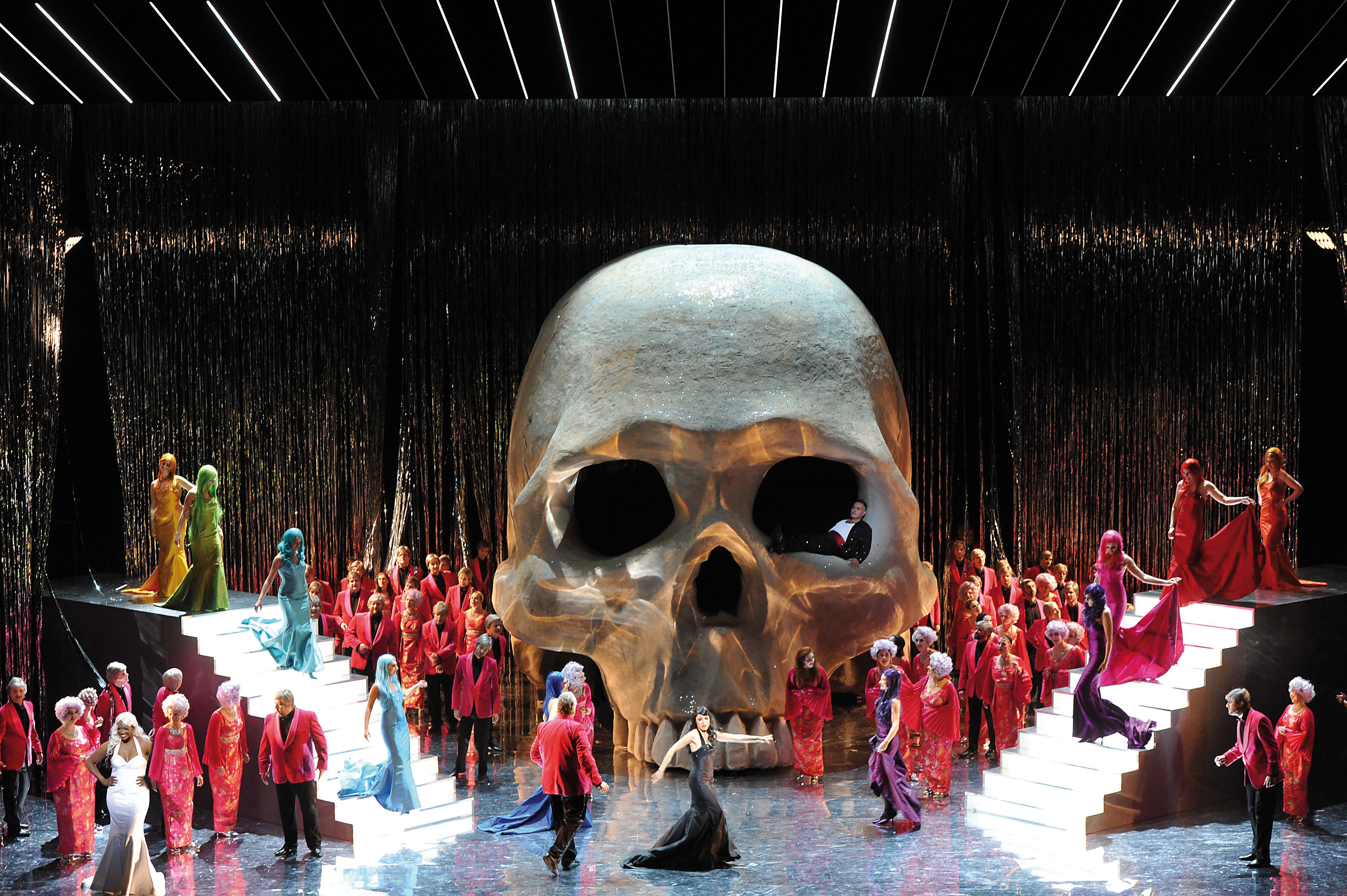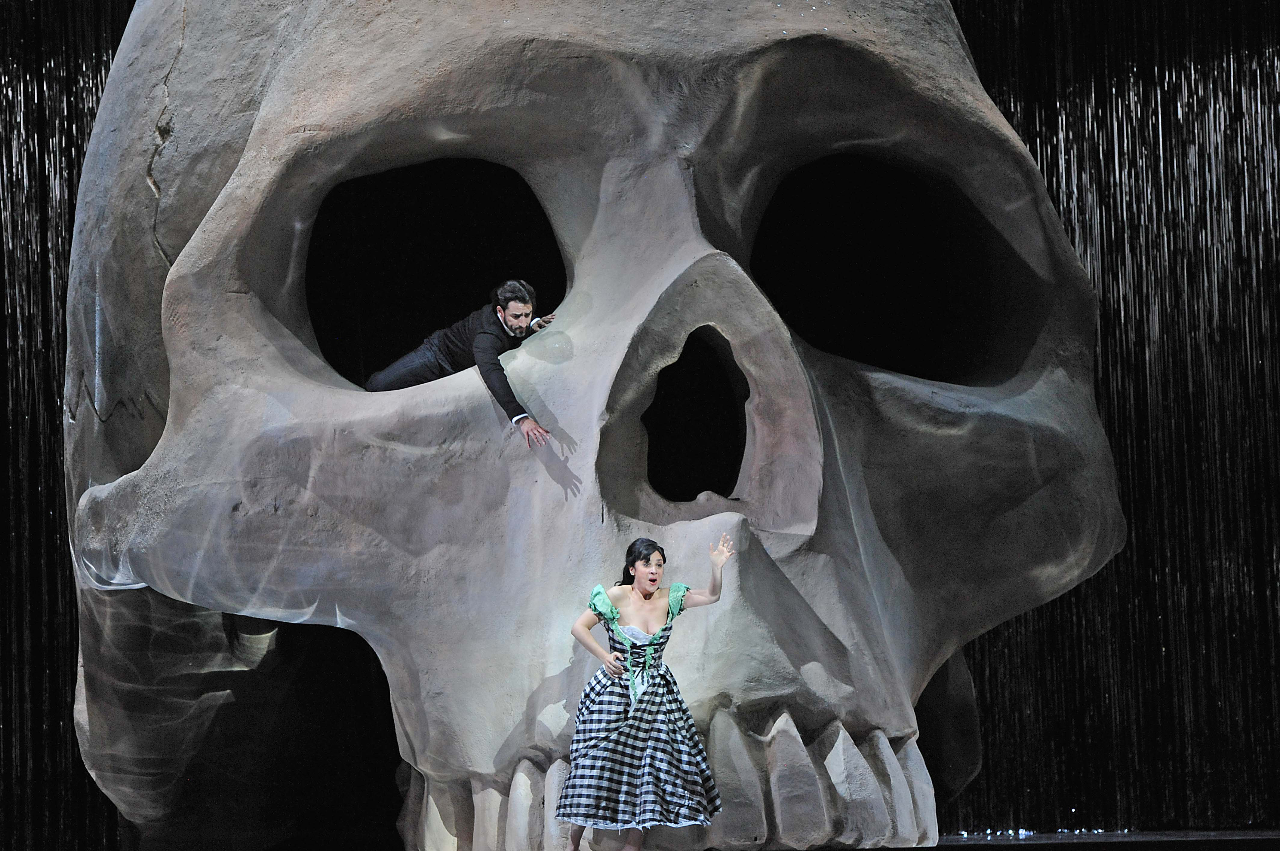 Philipp Himmelmann’s production really made much of little. If that sounds like damning with faint praise, it most certainly isn’t. Rather what he did was use what he had in an intelligent and illuminating way. The set was very simple – a large skeletal head dominated the stage upon which were projected images relevant to the scene. For example, a blooming meadow in the first scene where Faust and Margherita appear together, transforms into of the fires of hell as Faust hands her the potion. Video (Martin Eidenberger) was also used to illuminate the set and the curtain with images that showed the characters’ physical journeys from place to place, thereby illustrating the story in an engaging – but never overpowering – way, without the need for extremely elaborate set changes. The variety of costumes (Gesine Völlm) used by the chorus, in an opera that gives them such an important role, allowed them to set the scene through their presence as much as elaborate sets would. Indeed, Himmelmann had evidently also directed the chorus with the same detail as he had directed his principals providing us with a set of clearly defined individuals and a corporate mass. Likewise, personenregie was extremely detailed and showed the characters’ journeys in a particularly clear way.