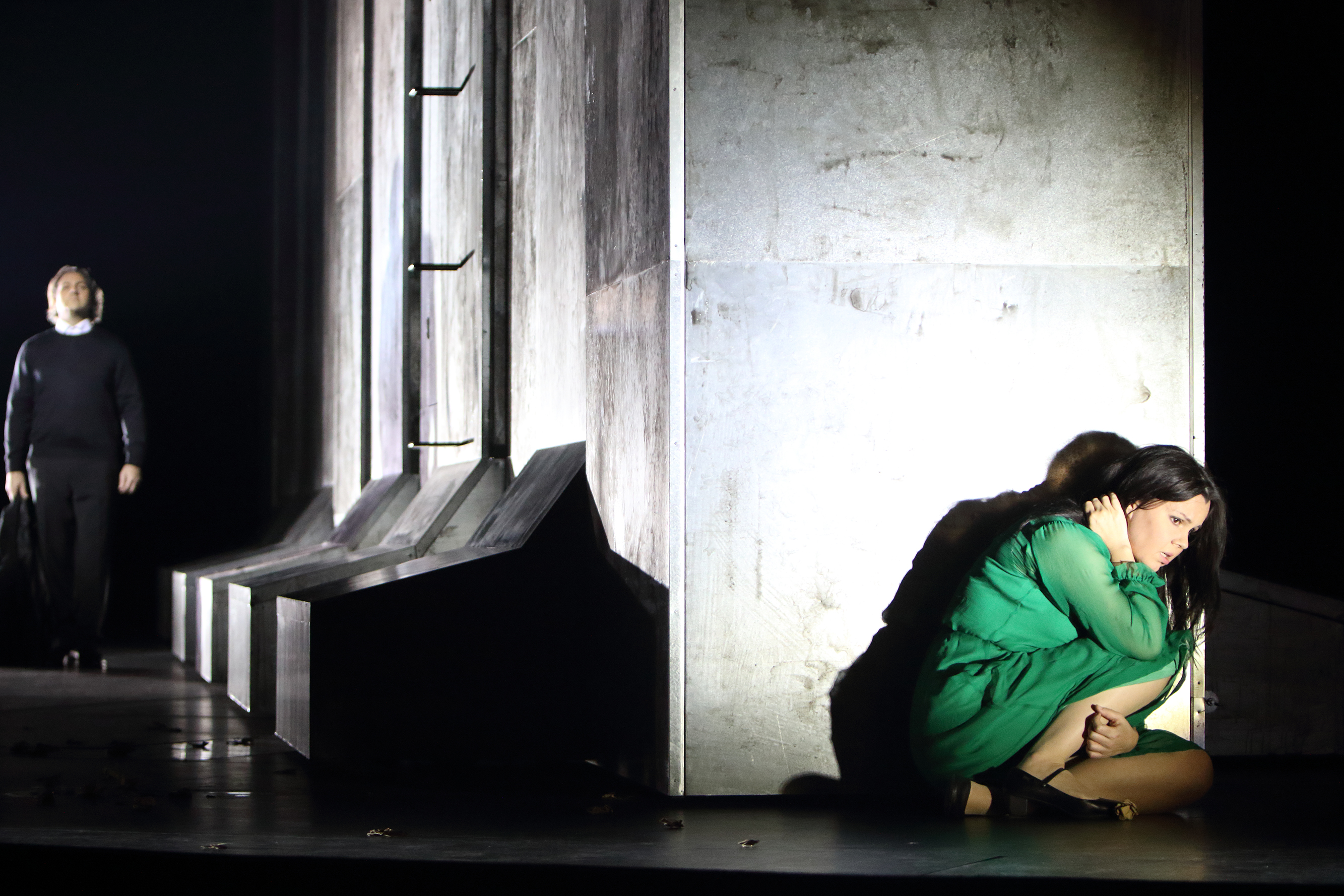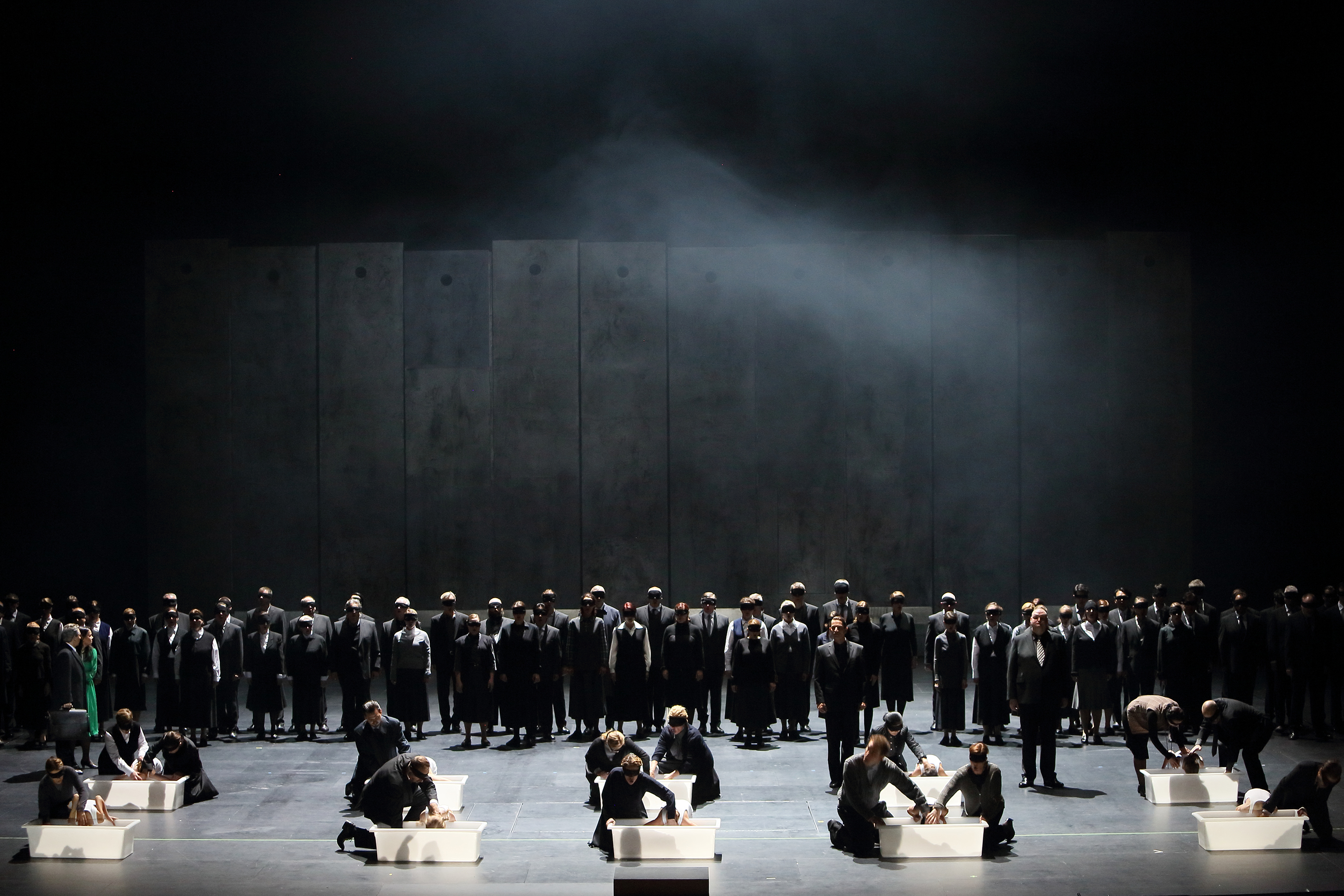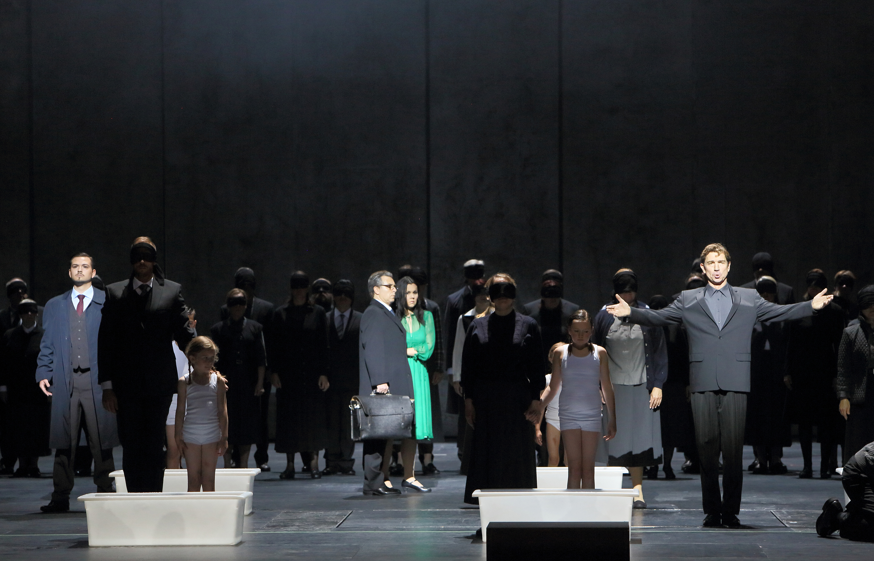 In a way, Bieito removes la Juive from La Juive.  Éléazar’s community isn’t a visibly Jewish one except in how it refers to itself through the libretto; rather Rachel distinguishes herself from the mob by her colourful green dress, the only real colour on an otherwise visually uniform stage.  I can see how the lack of colour could grate on some, but I do feel that in presenting this visually-monotonous world, Bieito makes his point even more forcefully.  Likewise, one could say that by attempting to universalize the work and making it less about two traditionally visually different religious communities and more about two communities who are separated only by their interpretation of what god is, Bieito really succeeds in bringing home how completely irrational hate between people is.  That’s not to say that he denies the work’s essential Jewishness: it’s all-present in the music and I must say that the way Roberto Alagna sang Éléazar’s Pesach prayer had me in tears – it really did feel so fundamentally Jewish; likewise the playing of the cors anglais at the opening of ‘Rachel, quand du seigneur’ was so deeply moving.