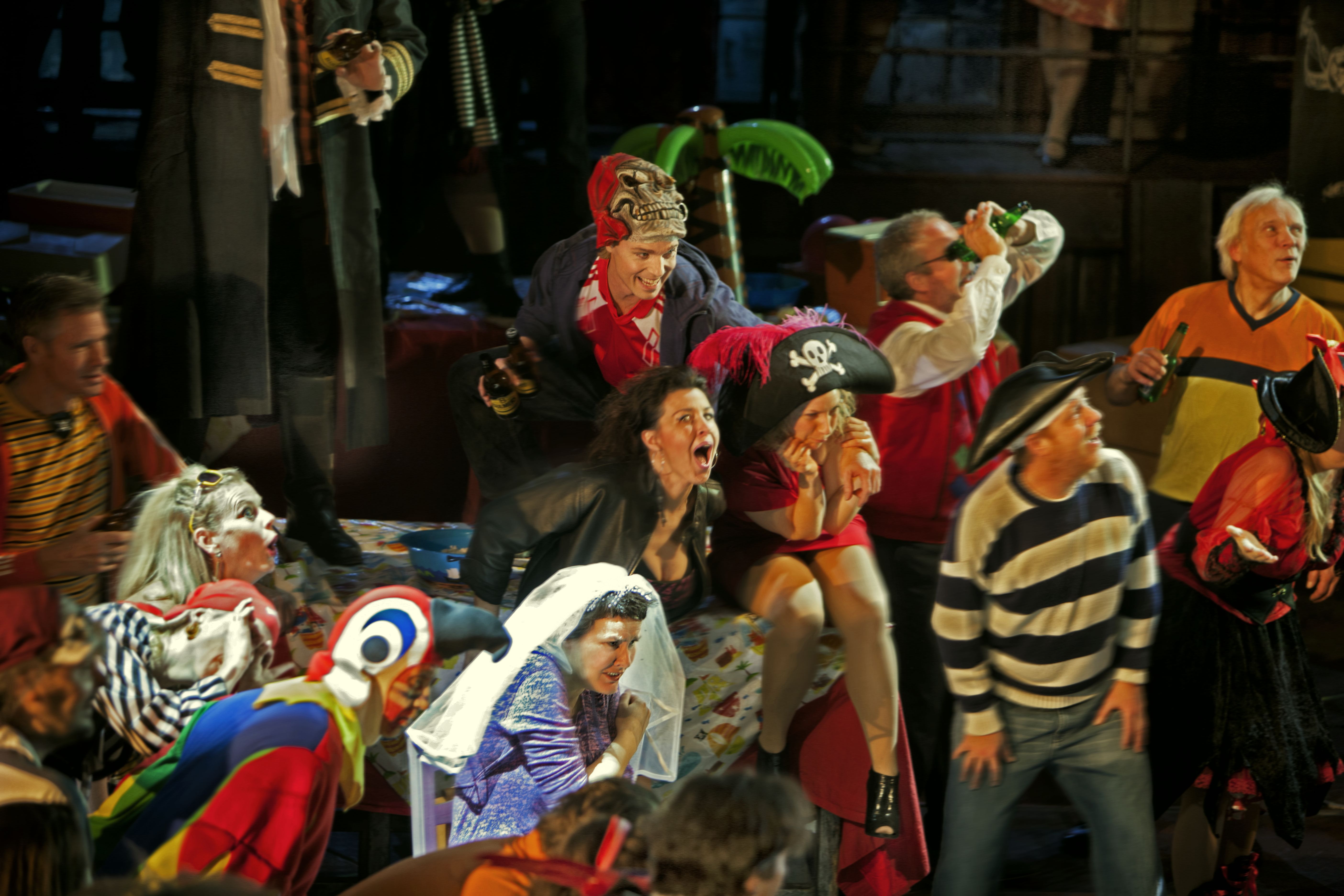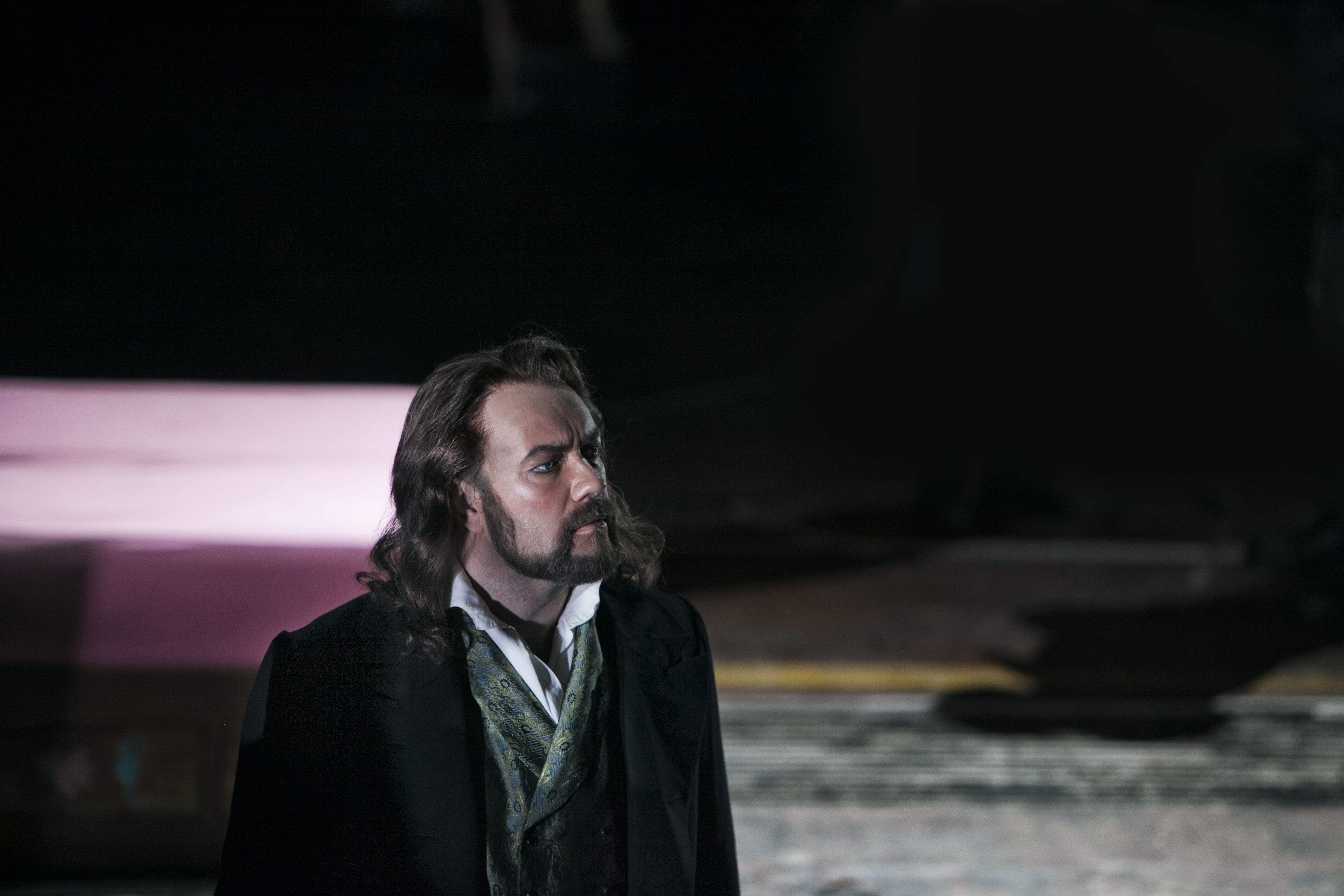 We never truly discover who the Holländer is – the boundaries between dreams and reality constantly open to question.  When he enters with Daland in Act 2 we don’t know whether what we see is Senta’s conception of the Holländer, or an opportunist trying to make a deal with Daland.  In the third act, a debauched party sees the Holländer celebrating with the others, taunting Senta and attempting to rape her.  The treatment of the crowd of Senta both here and in the second act is immensely cruel – the ladies mock her as she sings the ballad – and it’s clear that her escape to the world of her dreams makes her a target of scorn.  Kent’s execution of this liminality between dreams and reality is tremendously assured.  Scene changes happen fluently and video (Nina Dunn) is used most imaginatively to illustrate this; the Holländer’s ship appears covered in projections of waves, for a moment we don’t know whether it’s real or simply a projection.  The crowd scenes are very well done but far too often the principals are left just facing the front and barely looking at each other.  There appears to be a dichotomy between the thorough choreographing of the crowd scenes and how the principals seemed to barely relate to each other – but then of course that may in fact be the point.  We do get however, a central performance of raw, almost painful power from Ann Petersen as Senta, a manifestation of immense physical and vocal courage.