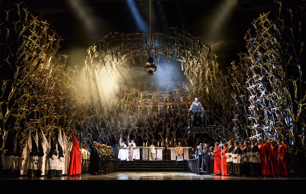 The staging was the work of La Fura dels Baus. The set (Alfons Flores) seemingly a wall of crucifixes and the druids were catholic priests. We saw penitents processing around the set and Norma performed her rituals in priest’s vestments. This was a military society too with Oroveso wearing military dress uniform. As an idea of creating a strongly oppressive religious society it had some merits but there were also some issues with this. The Catholic Church’s attitude to women is well known and it was easy to wonder why Norma would have been able to rise through the ranks to lead the people in the way that she did. There was a nice touch in how Adalgisa confessed her love for Pollione as if in a confessional though. Furthermore, characters seemed under-developed. We seemingly had no idea of who the Romans were or why the two peoples were in conflict. The principals were barely directed, often just standing and delivering to the front. The chorus was just marched on and off efficiently but without any particular imagination. Sonia Ganassi’s Adalgisa tried hard to inject some dramatic life into her character, working hard with the text to create a fully-rounded personality but otherwise the overall effect was of anonymity. Additionally, and this was even more obvious after Jonathan Kent’s fluently-executed Copenhagen Holländer yesterday, the stagecraft felt clunky. I missed the big coup de théâtre at the very end because the eye was drawn to other things happening on the stage. At one point, in a seemingly desperate attempt to breathe some dramatic life into the Act 1 Pollione-Adalgisa duet, Joseph Calleja was directed to indulge in some gratuitous furniture abuse. The show certainly looked good but overall I felt that it lacked in life and fully rounded characters.