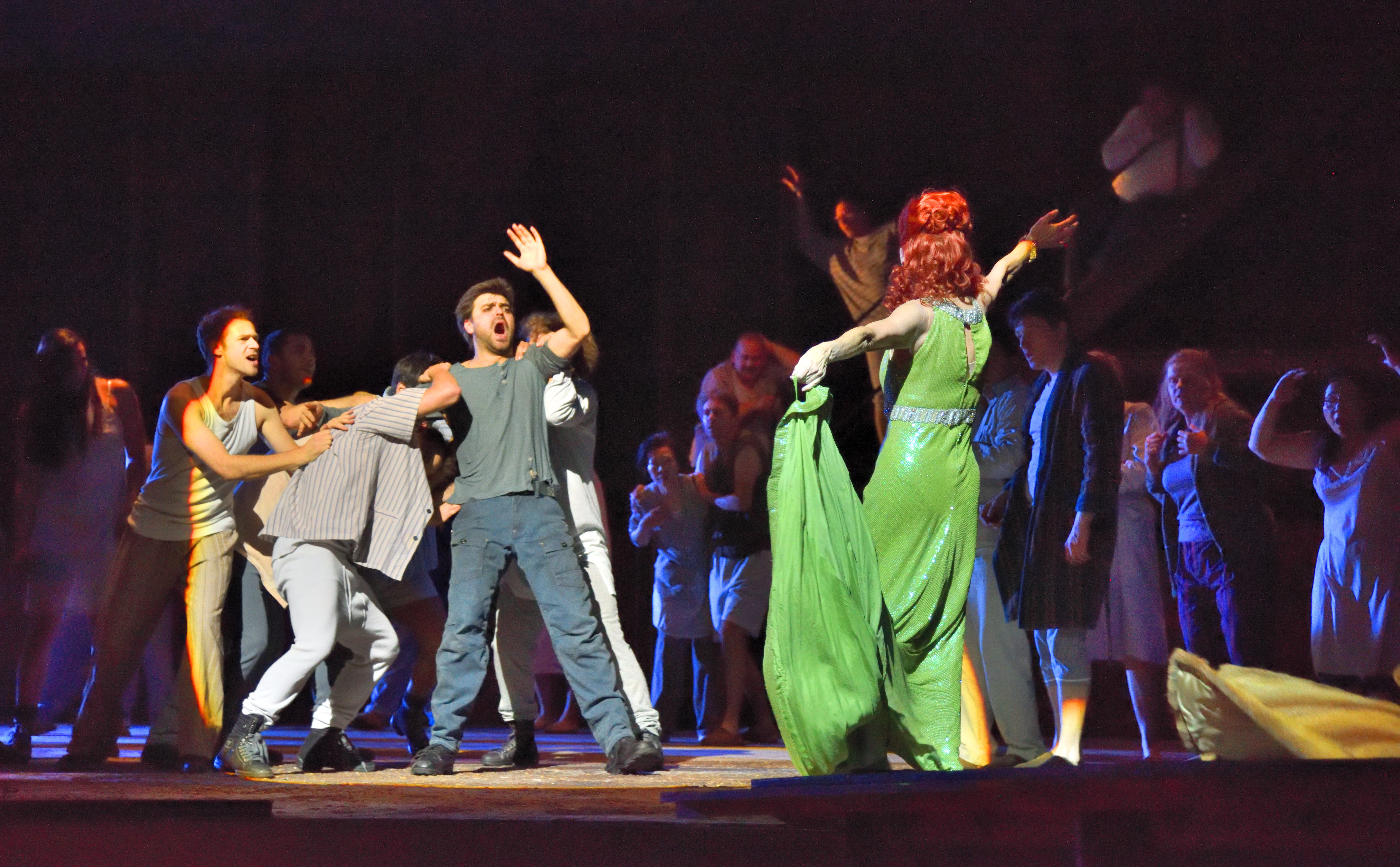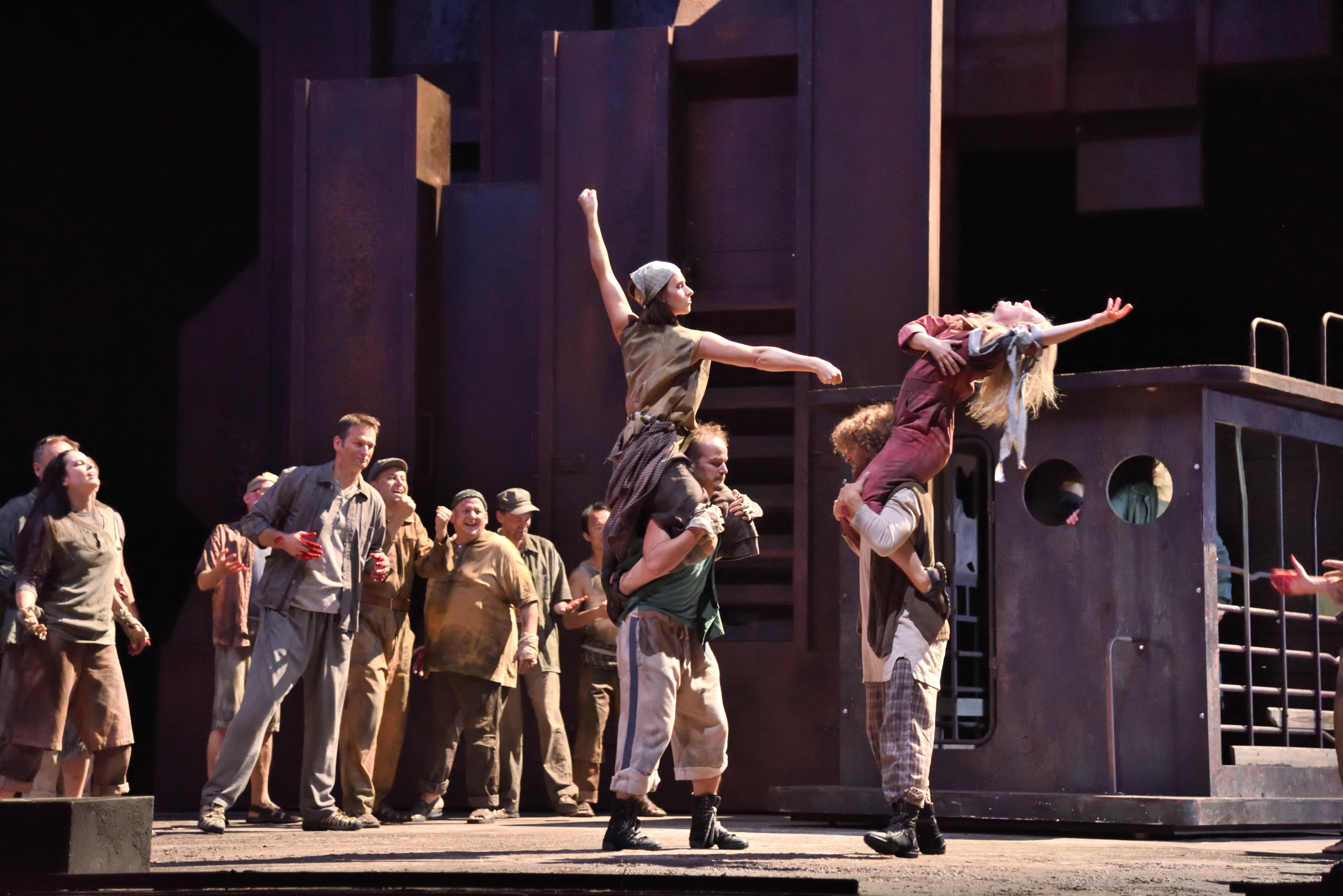 There were certainly some intelligent touches to the production. The relationship between Oreste and Pylade was nicely mapped, the tenderness and love between the characters evident. As Pylade sings ‘ton cœur au mien n’est pas fermé peut-être’, he reaches out to caress Oreste who rejects him conflicted about how to resolve the situation they find themselves in. There was a believable tenderness there that I found most convincing. Likewise the closeness between the two contrasted well with the isolation that Iphigénie finds herself in. She was portrayed as a loner, someone who didn’t really engage with anyone else and her search for resolution was always put to the fore. Certainly in both of these aspects I found the staging most successful. The problem is that it seemed Calvario wanted to add additional layers that cluttered the narrative, and to this viewer at least, added little in understanding of the work. Sets (Jon Morrell) were industrial, seemingly illustrating the inside of a ship with bridges that were able to rise and fall on occasion. Often the fact that something is possible doesn’t mean that it’s necessary. I thought of that as Iphigénie sang ‘ô malheureuse Iphigénie’ and was hoisted up and down in the air for no apparent reason. I enjoy seeing shirtless, buff sailors grabbing a piece of meat as much as the next man but their presence didn’t particularly illuminate the opening chorus for me. The ballets were accompanied by shouting from the stage which drowned out an otherwise excellent musical performance. For Calvario there is no conventional lieto fine. The closing chorus is accompanied by people randomly falling to the floor and jumping back up again but then he asks the band to reprise the very opening measures of Act 1 as everyone leaves the stage, leaving Oreste alone watching over an empty scene. It’s an idea that has merit but I can’t say that I was convinced of it musically.