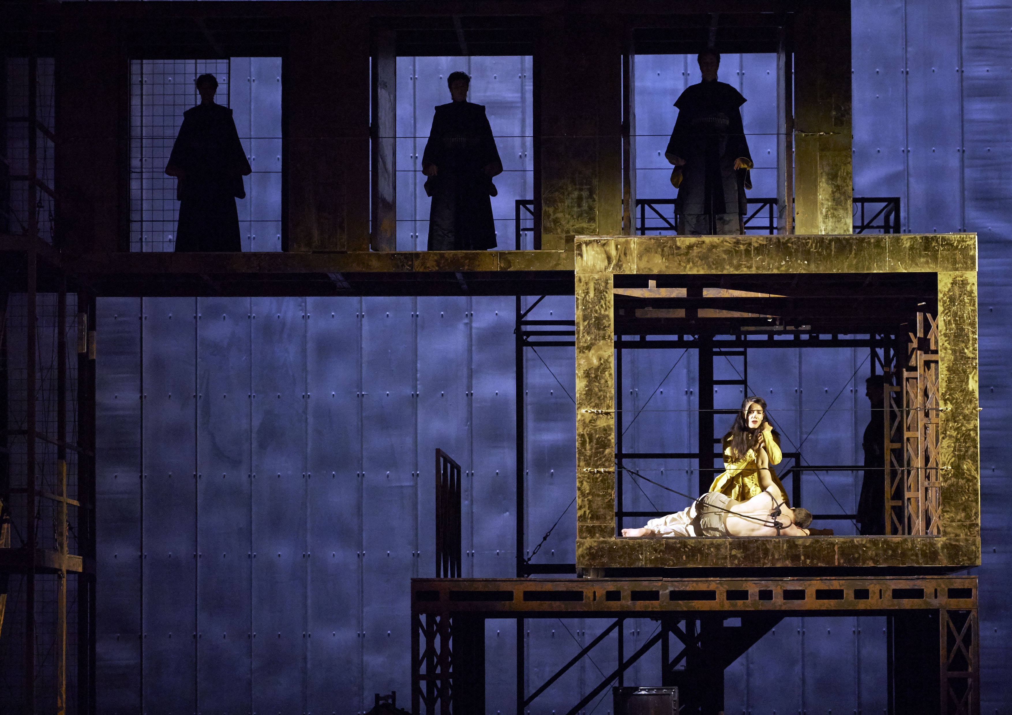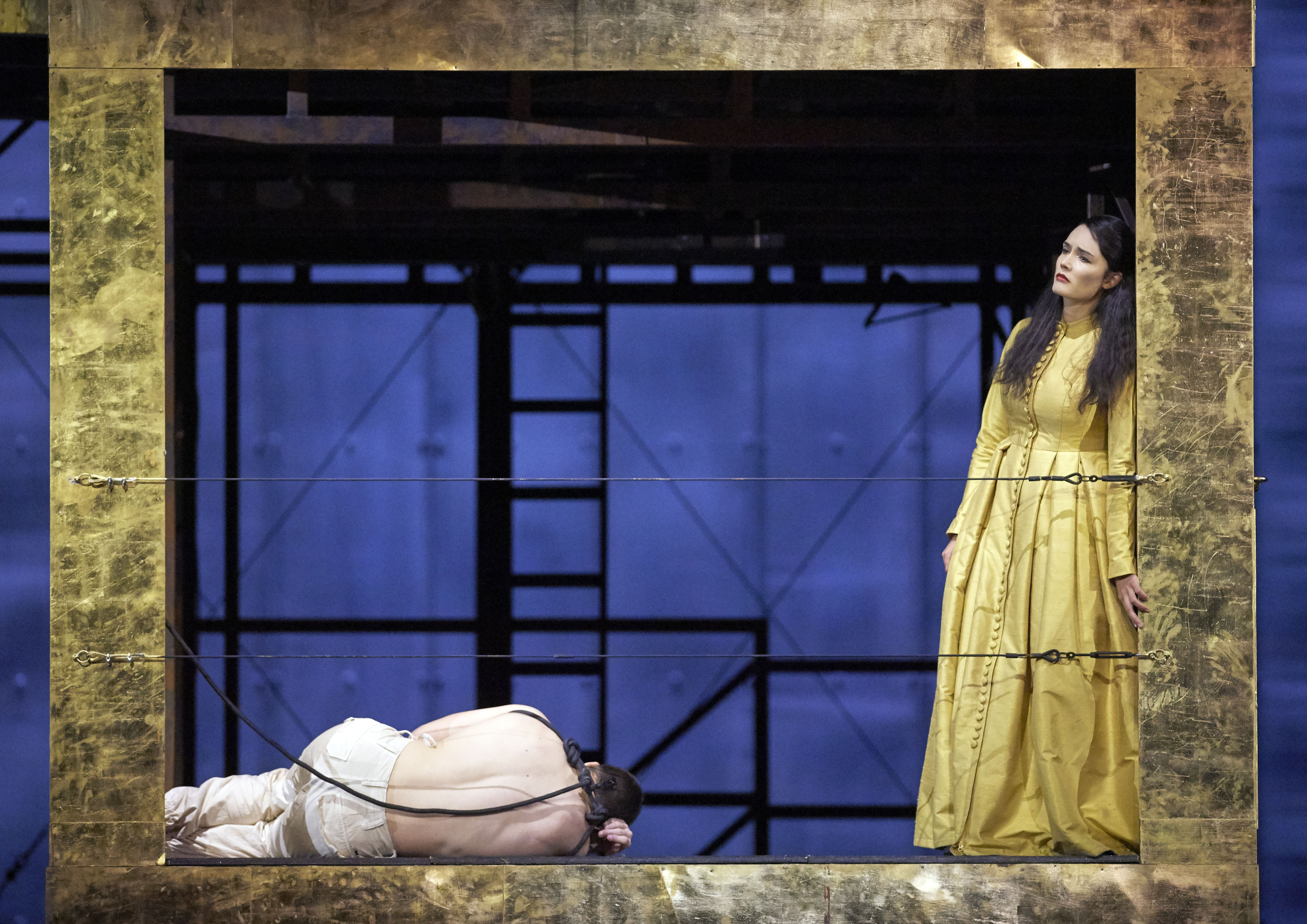 The staging was my first encounter with the work of Ivan Alexandre. The set (Pierre-André Weitz) was made of two interlocking two and three-story structures – which looked like something from Blade Runner – that held most of the action. Doors would open and close, hiding characters as they chose to appear or not. Costumes (also Weitz) looked straight out of Game of Thrones. Alexandre’s staging focused on creating a visual narrative, using stage pictures to illustrate the action rather than using his singing-actors to create living, breathing personalities. That’s not to say that they did not incarnate the characters they were playing, there was certainly an element of that, but rather in a way what we saw was a visual reaction to the music. For example, as Armide emerged with a sword to decapitate Renaud, the lighting changed to reflect the change of mood in the music. Similarly, as she tried to lure him into her structure we saw multiple Armides doing precisely the same thing, using the doors of the structure to hide and appear at will. A corps of (generally shirtless) gentlemen dancers was used widely for visual interest and while seeing a group of buff guys do push-ups in unison was not unpleasant to the eyes, it was no replacement for the creation of living, breathing characters. Indeed, the personenregie so often felt that it consisted of marching people on and off (especially the chorus) with principals just parked at the front and delivering.