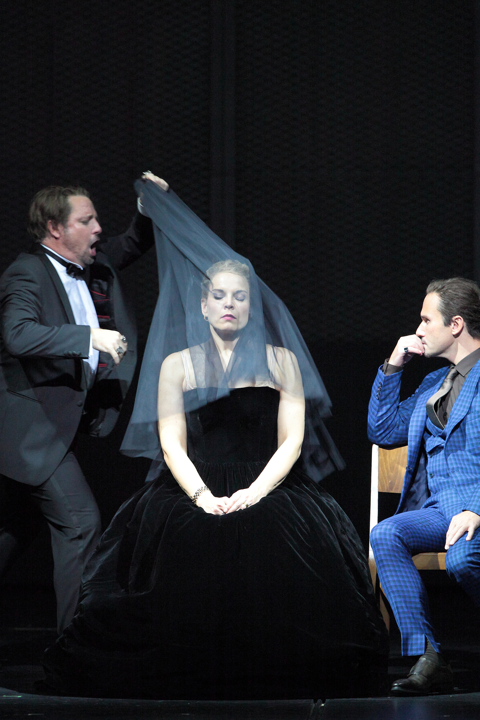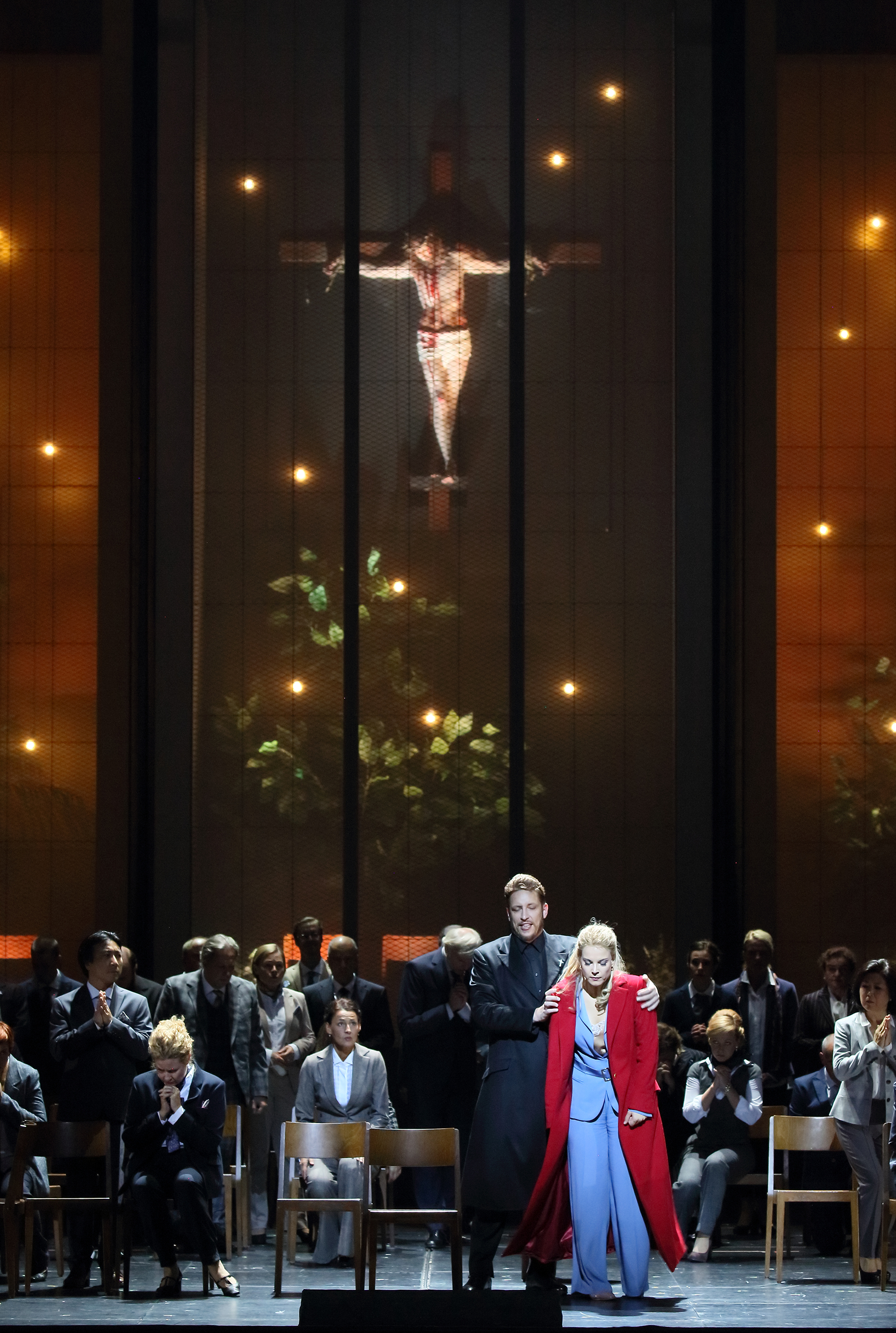 Amélie Niermeyer is a new name to me but she is well-regarded within the industry. I have to say though that I found her Favorite a bit of a mess. There is a kernel of a good idea here – the way that Léonor is treated is shockingly bad but in one respect she raises a question that she is either unwilling or unable to answer. The relationship between Alphonse and Léonor is an interesting one; as he sings ‘pour toujours tu m’appartiens’ he makes it very clear that he considers her his physical possession, yet during the ballet music (no ballet here, instead Léonor and Alphonse watch a movie) it struck me that there was a deeper level of co-dependency there than one might initially have thought. It just felt that this was raised and then left to one side. The set (Alexander Müller-Elmau) consisted of metal panels that would be moved noisily around and would occasionally light up to show some religious imagery with statues coming to life. A group of chairs was abused frequently, either thrown to the floor or used as devices to attack characters with. It’s true that in terms of personenregie we did get a sense of the characters and their motivations but the overwhelming sense I was left with was that of several potentially good ideas taken and then quickly discarded. Given that sightlines at the Nationaltheater aren’t that great from many seats, it’s also regrettable that Niermeyer set much of the action on stage right which meant that for a considerable part of the evening, the action was lost to those seated on the left of the theatre.