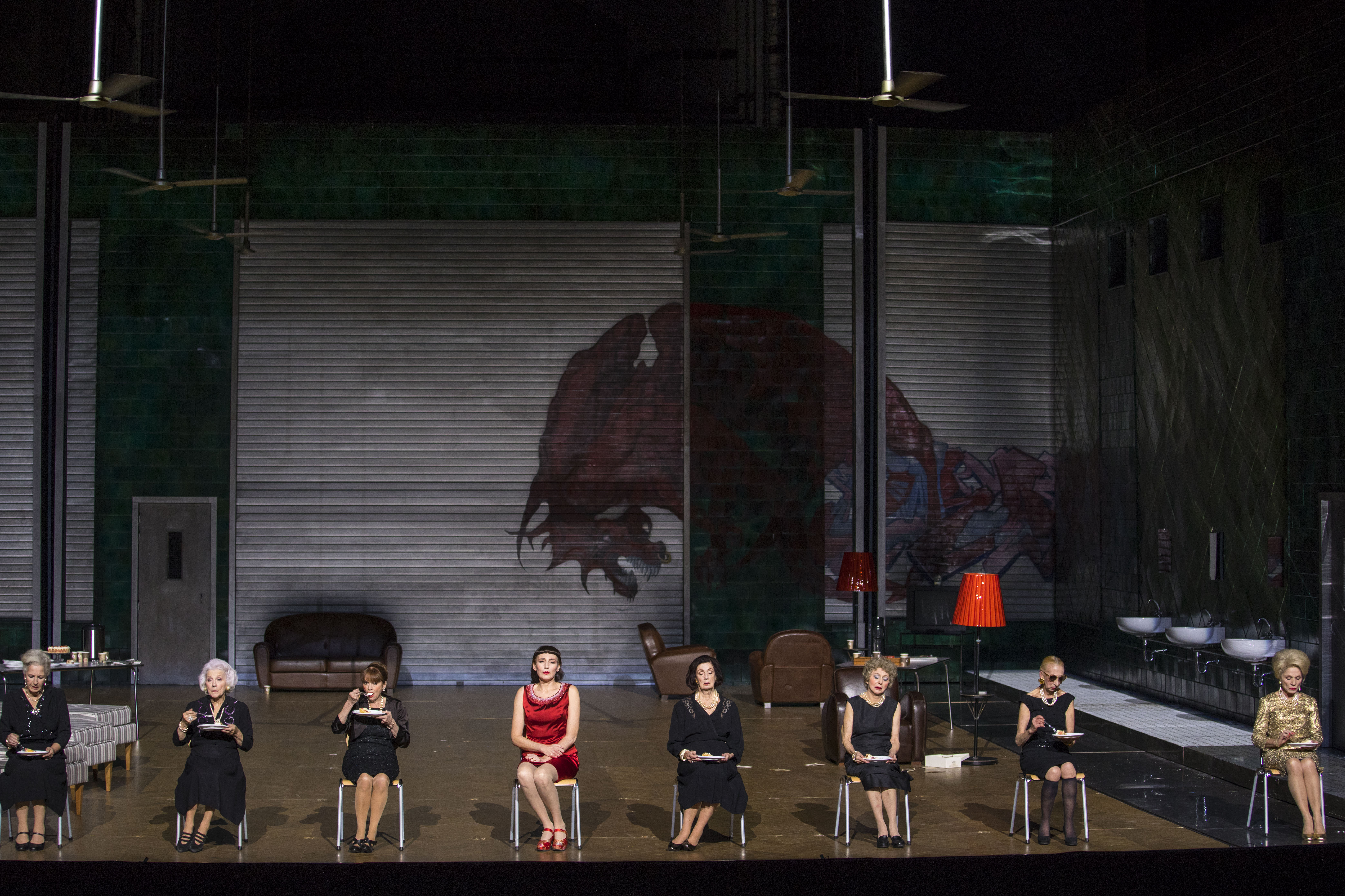 Tonight’s Iphigénie en Tauride staging was the work of Krzysztof Warlikowski. His starting point was to set the work in a retirement home. A mirror at the back of the set meant that we could see our reflection as an audience in the events on stage and it meant that we were never quite sure whether what we saw was real or a simulacrum. This was achieved in part by Iphigénie transforming from a grand, elegant, mature lady into a younger version of herself while her older double looked on. When Pylade and Oreste were brought on as prisoners we saw them as their actual, younger selves. I found this a very moving idea – the thought that our memories are of now and of then, and the way that Warlikowski allowed Iphigénie to transcend time was intelligent and well executed. As Iphigénie sang ‘que les regrets de ta sœur jusqu’à toi puissent descendre’, we saw her younger self sitting with the other seniors all of them perhaps reflecting on what was or what could have been.