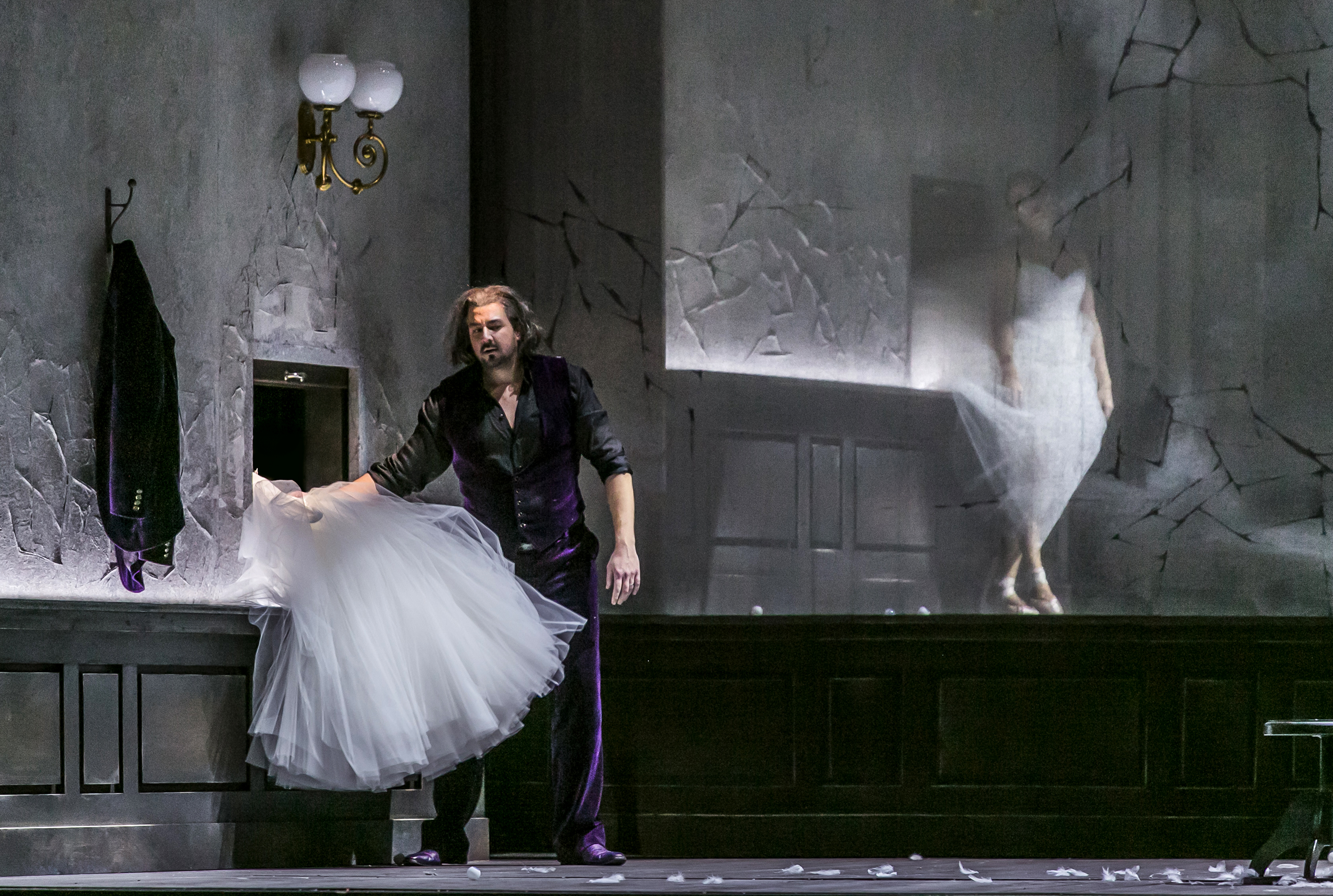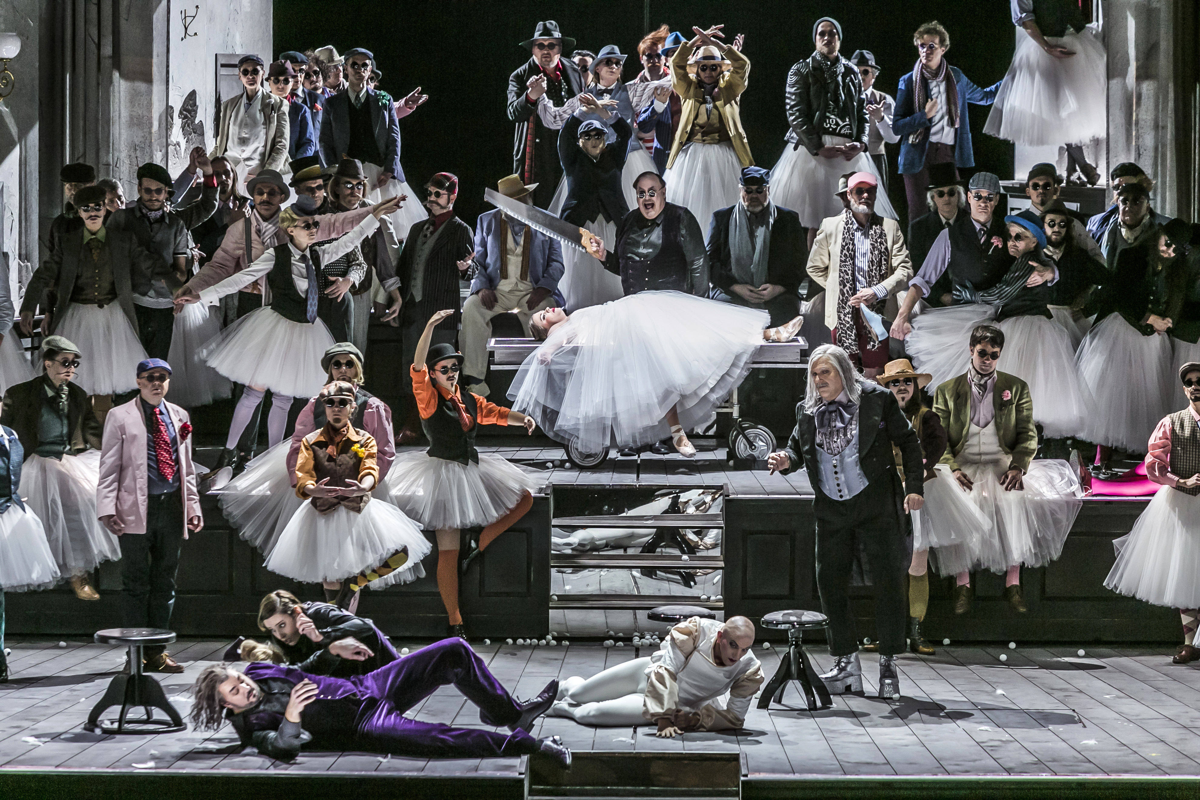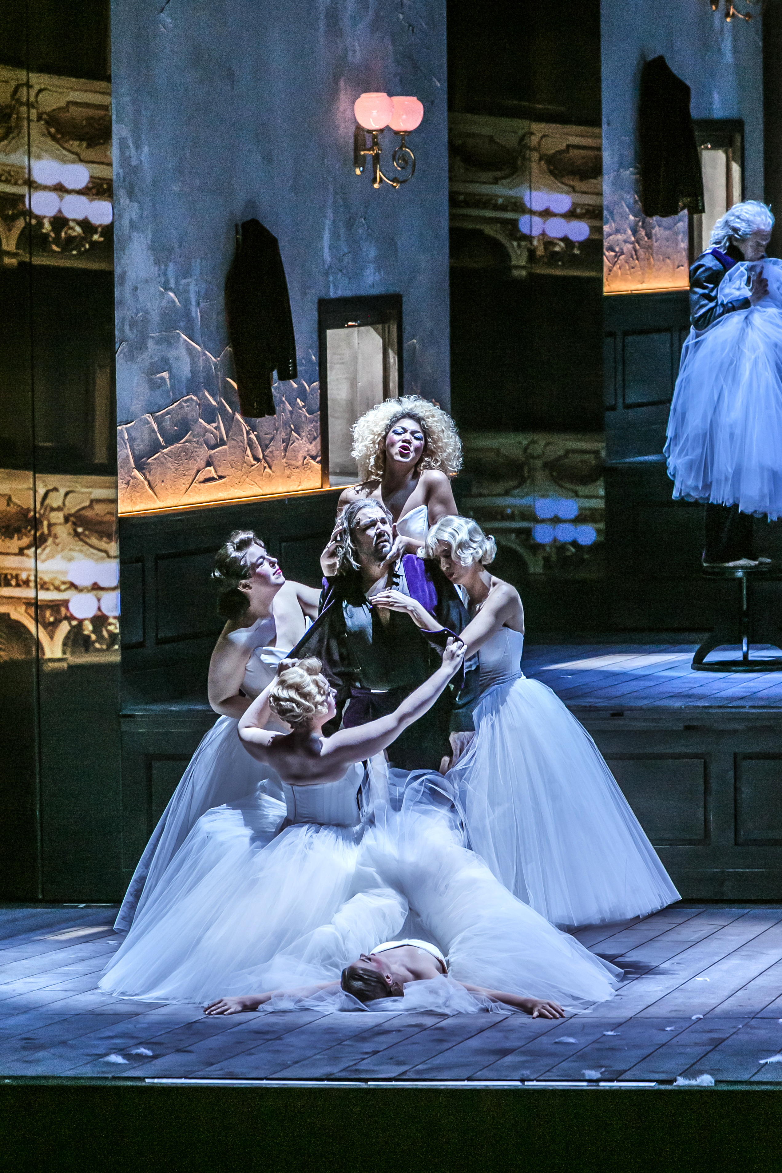 Erath’s staging was very much a reflection on Hoffmann’s loneliness and complicated personality. He, the villains and Nicklausse were dressed for much of the evening in the same clothes. If we take as our starting point the three ladies (Olympia, Antonia and Giulietta) being the same person, Stella, in three aspects of her life (‘Stella, sous les trois aspects de sa vie: jeune fille, artiste et courtisane’ as Nicklausse sings in the epilogue), then the idea of Hoffmann being an amalgam of the villians, Nicklausse and Hoffmann himself is actually quite a pertinent one. This certainly points to Hoffmann’s self-destructive, addictive nature and offers an interesting and potentially convincing reading of the text. Yet, I’m not quite convinced Erath pulls it off. The main reason for this is that he clutters the narrative with so much extraneous detail with the outcome that one spends much of the time asking why things are happening. For example, in the Olympia act we see table tennis balls fall from the sky, later, the orchestra is raised on a hydraulic platform only to descend shortly afterwards. In the Olympia act the chorus is made to act as blind people while singing about her visual assets (‘voyez comme elle est mise’). In a way, it seems that Erath is unwilling to trust his singing-actors to drive the narrative and feels it necessary to add additional visual detail to every scene.
