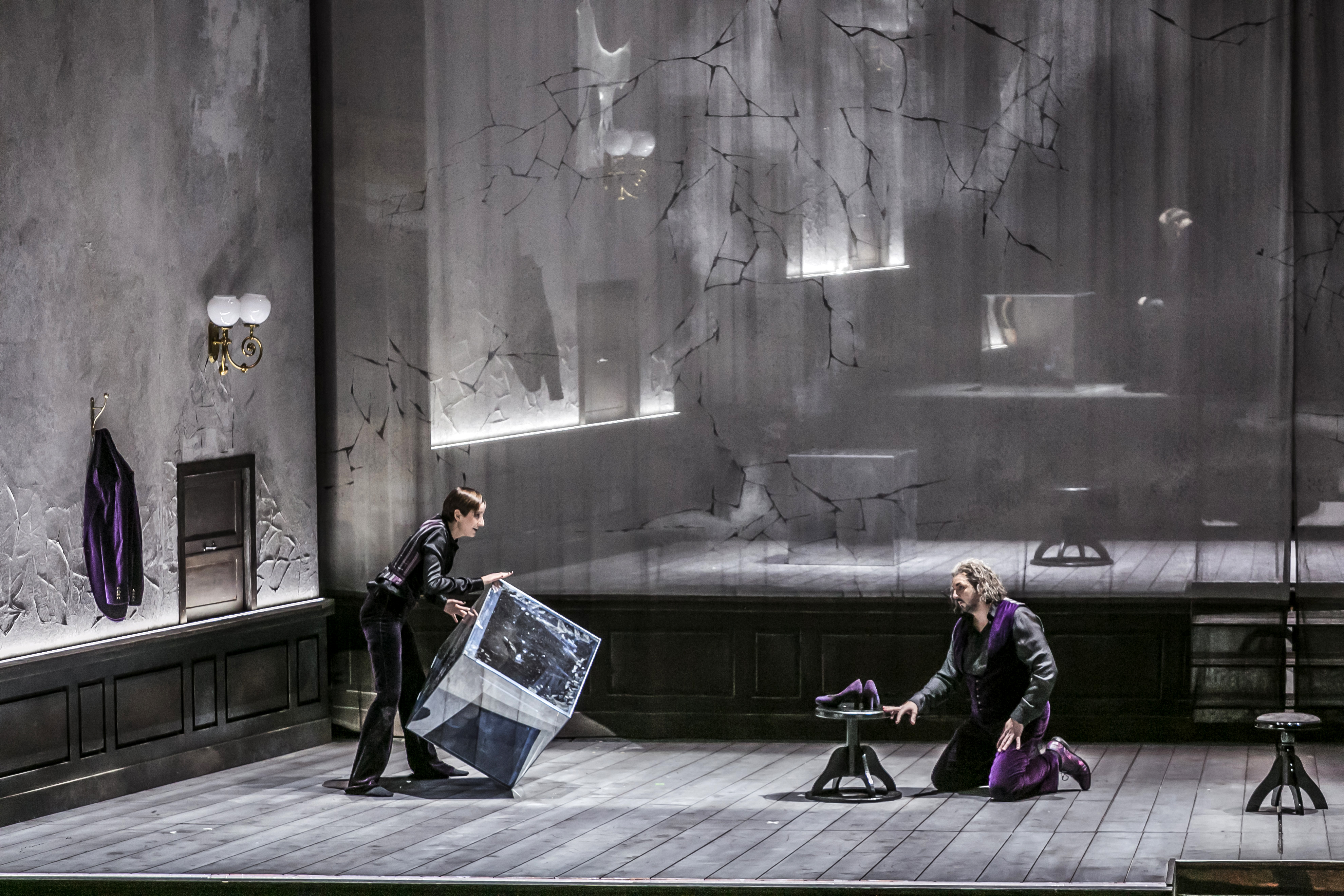 The ornate architecture of the theatre played a leading role in Johannes Erath’s staging. This was a production inspired as much by the space as by the plot. As the curtain rose, we saw an image of the theatre reflected back at us, gradually populated by human figures. Later, we saw video of Antonia walking around the corridors of the house and she suddenly appeared behind us, singing from the royal box. Erath used the space around the stage almost as much as on it, with characters appearing in the boxes at the side of the stage and Nicklausse’ first entry happening at the front of the Parkett. This certainly helped in bringing the action close to the audience although I’m sure it must have affected sightlines for a number of audience members.