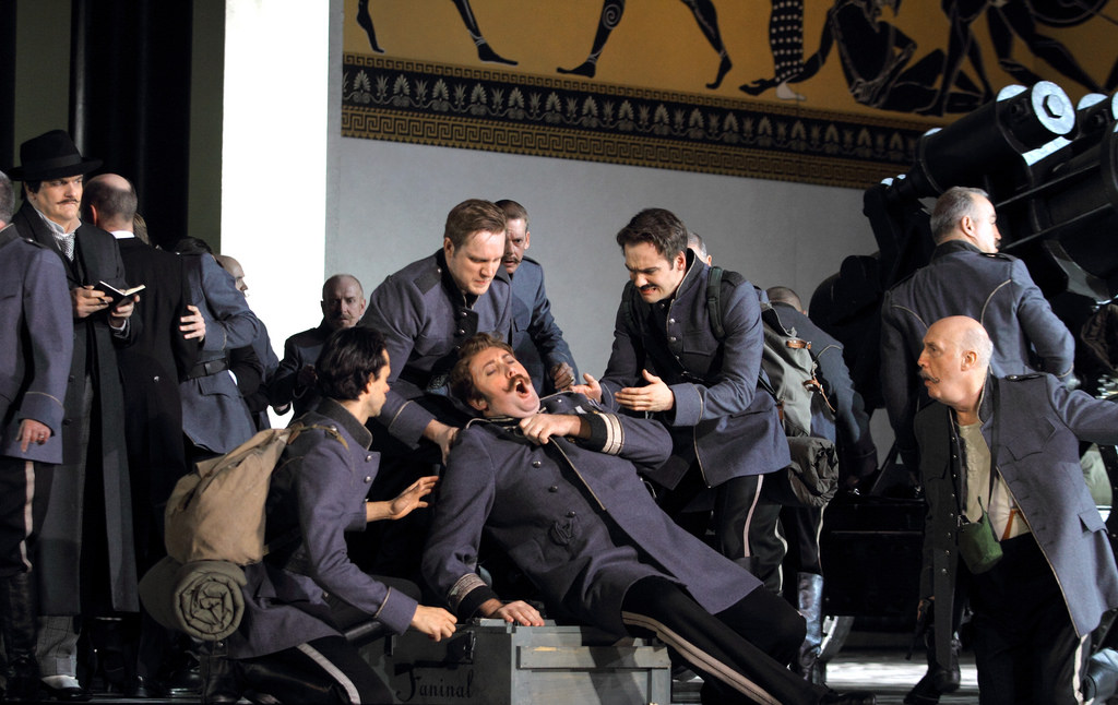 For Carsen, the events of the plot took place at a time of social change. We appear to be in the time of World War 1. At the start of Act 2 we see two large cannons being dragged out and Ochs and his men are dressed up as soldiers. They crawl along the floor towards the end of the act as if representing men in the trenches. And yet this is an idea that feels underdeveloped. At the very end of the evening, during those magical closing measures, the stage opens up to reveal soldiers dying and military machinery. It’s a strong idea – the thought of the upper classes enjoying life while others died – yet in its execution here feels gratuitous and tagged on. Had Carsen developed it more throughout the evening it might have been more successful, however, on this occasion it felt like an afterthought.