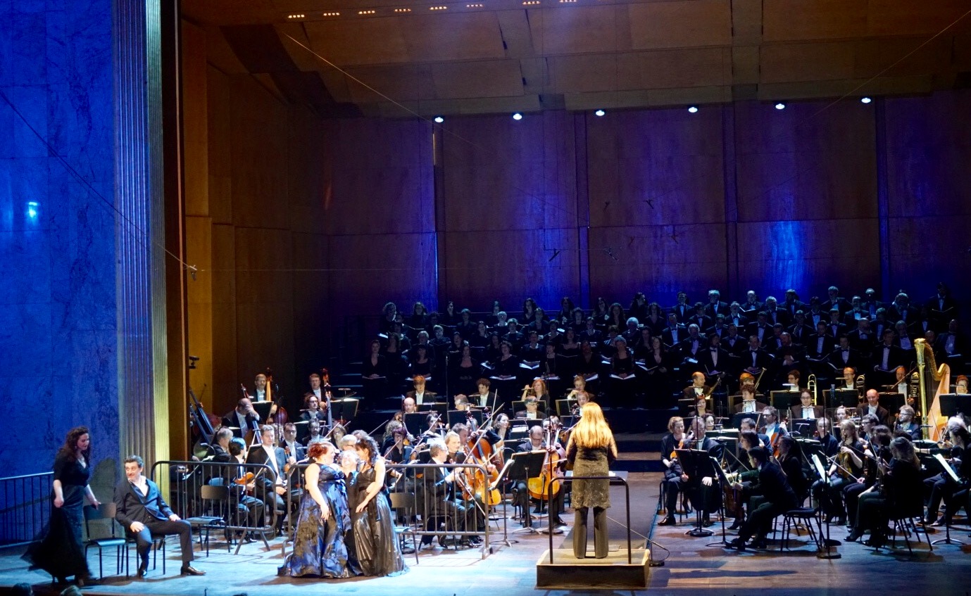 Despite the concert setting we actually received a very intricate and complete mise en espace, credited to Laurent Delvert, that was considerably more than a concert staging. The orchestra was split in two around a central runway at the head of which the conductor stood. Even though the chorus was arranged in rows behind the orchestra, they were used most imaginatively to illustrate the drama – interacting with each other, using individuals from different sections to stand at different times. As a result, this was no mere concert performance but a living, breathing piece of music theatre, nowhere more evident than in a final scene of raw, searing power.