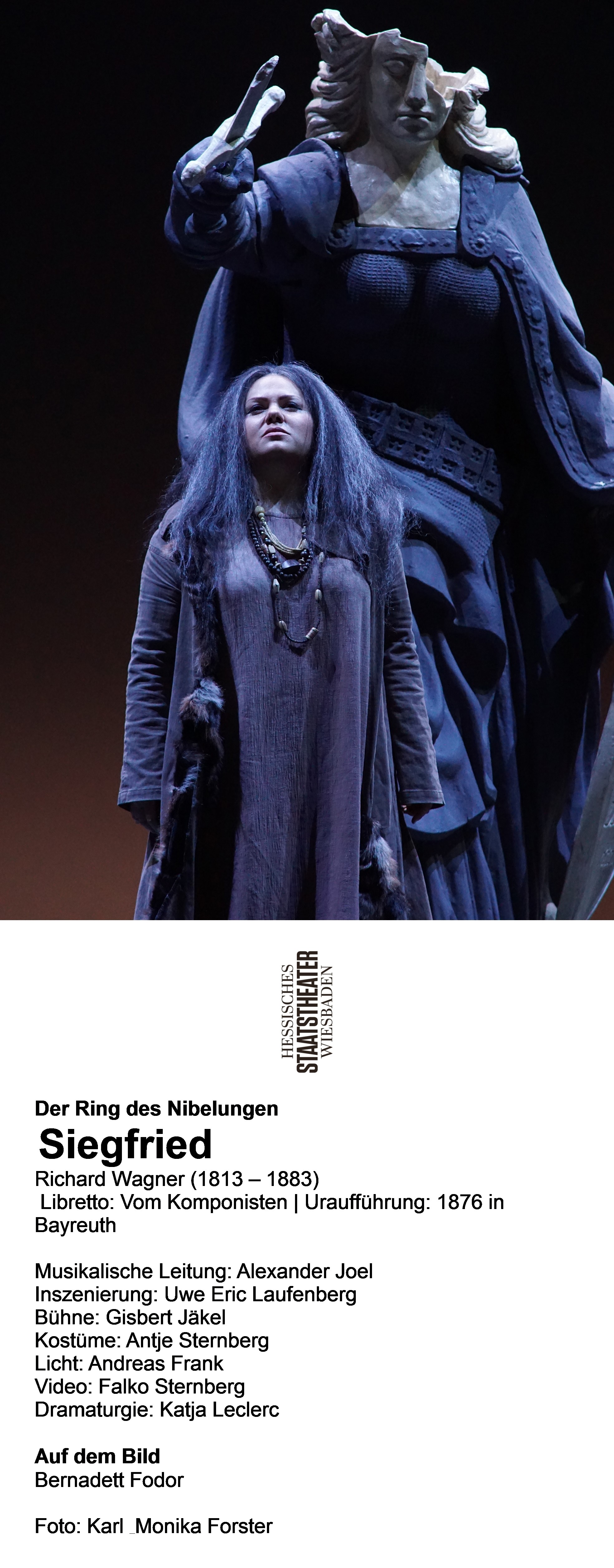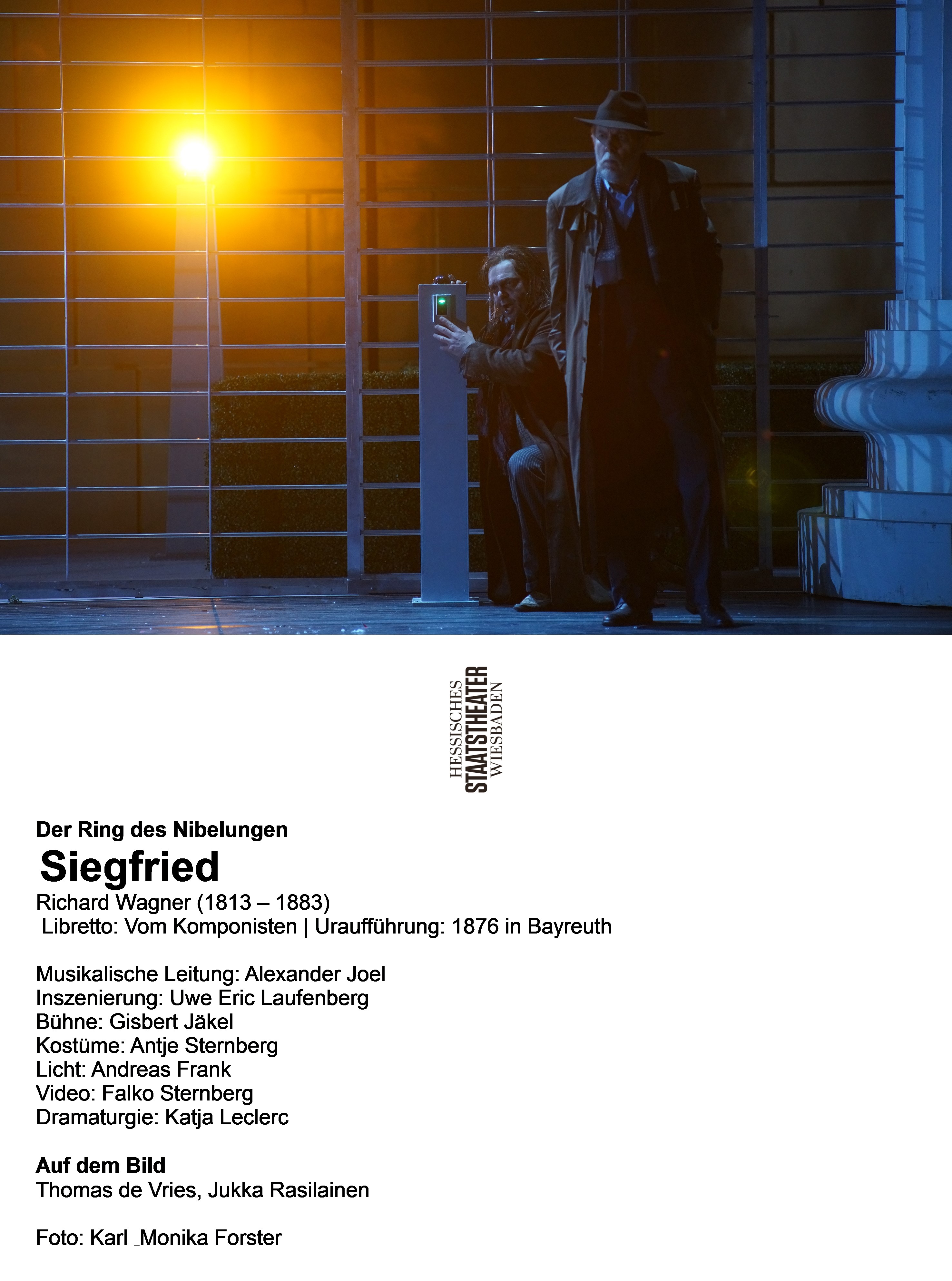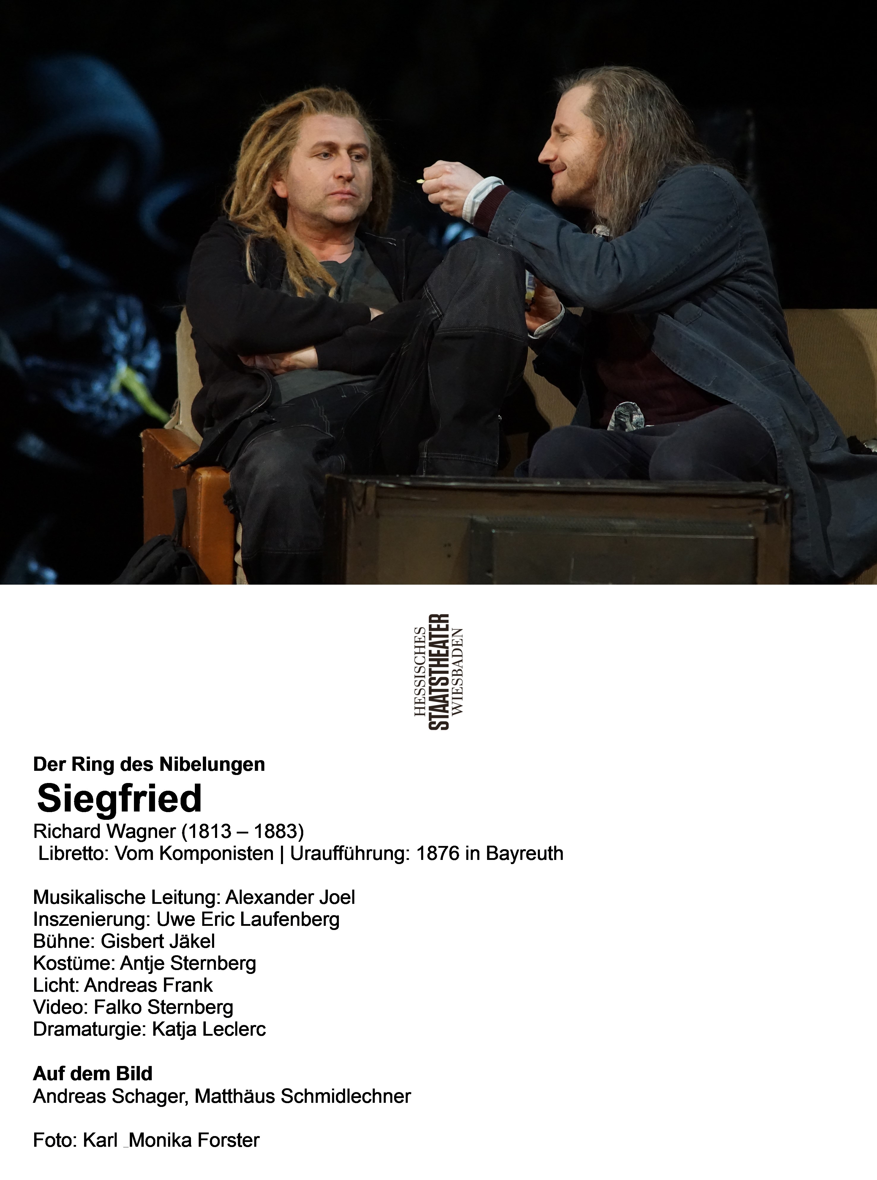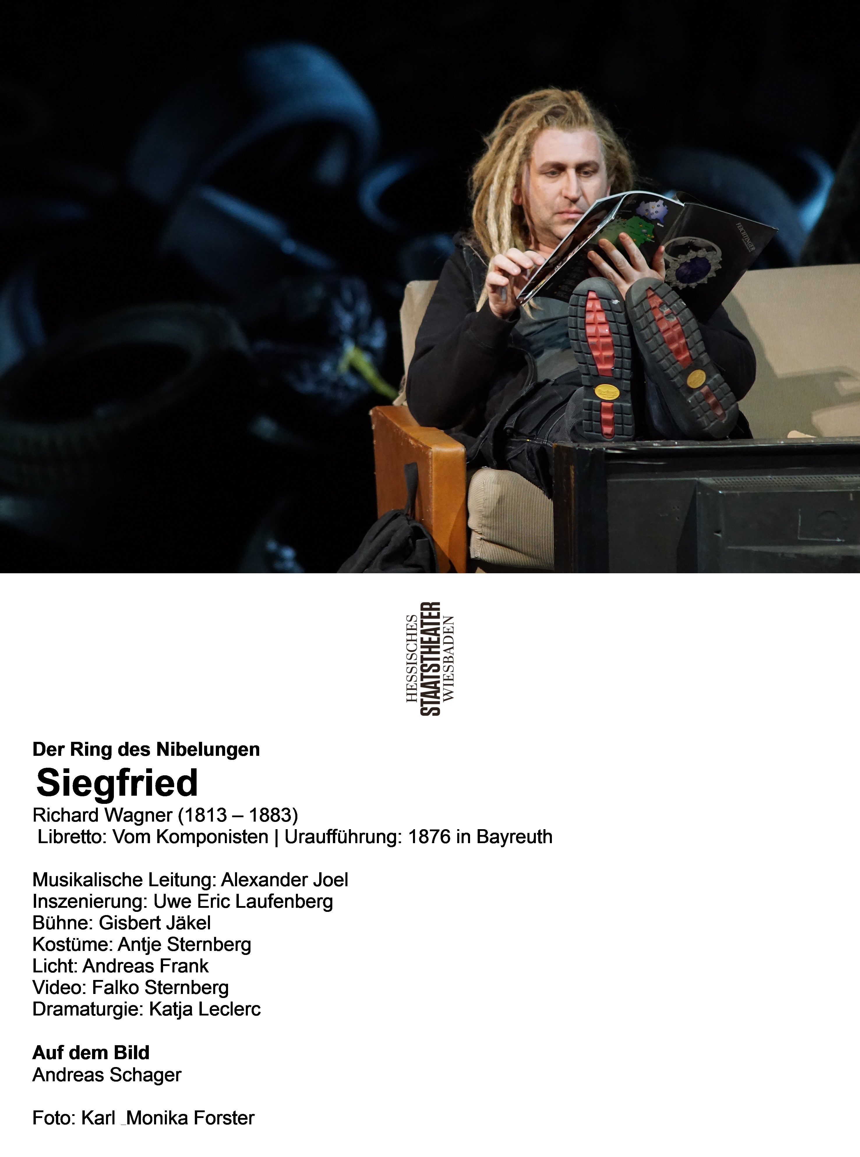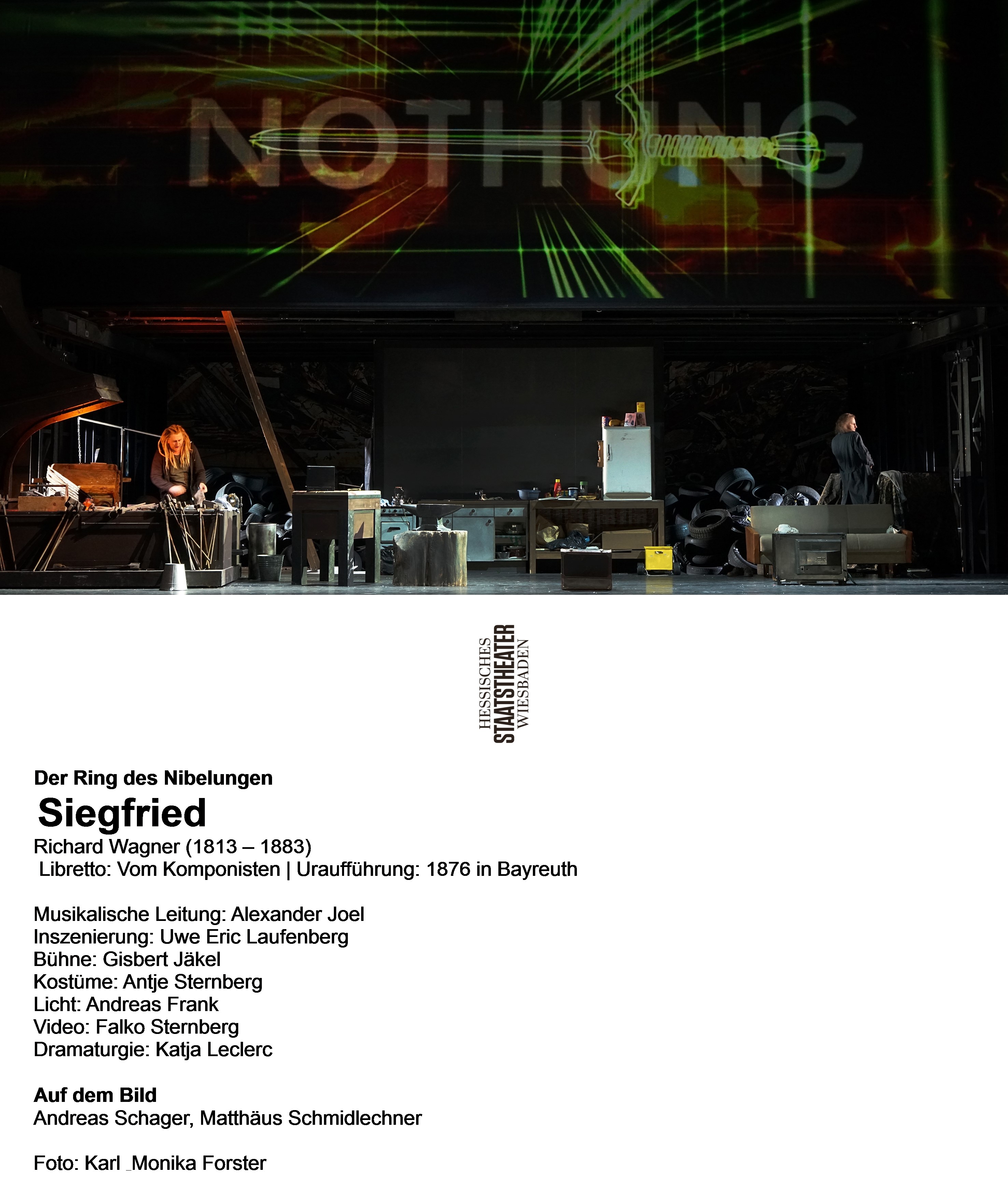 For any theatre, the Ring is the ultimate challenge and for this year’s International May Festival, the Staatstheater Wiesbaden brought together today’s pre-eminent interpreters of the roles of Siegfried and Brünnhilde, Andreas Schager and Evelyn Herlitzius. I was due to attend the full cycle but, due to other commitments, was unable to see the Rheingold and Walküre. Any discussion of Uwe Eric Laufenberg’s staging is at something of a disadvantage having missed the two earlier chapters.