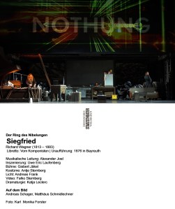 Indeed the use of video (Falko Sternberg) was for me a simultaneously insightful and frustrating aspect of the staging. There seem to be two ways of using video on the operatic stage – one that over-dominates the characters (such as Kasper Holten’s London Royal Opera Don Giovanni) or another that genuinely enhances the sets and atmosphere (Philipp Himmelmann’s Baden Baden Mefistofele for instance). In Act 2, the images projected of a living forest really brought that scene to life. Likewise, Fafner, a dragon projected on the back wall, gradually transformed into a video game that Siegfried won. I thought it an ingenious way of resolving the issue of portraying a dragon on stage, especially as he is revealed to be a man hiding behind a desk. Yet in Act 1, the video was less successful, the images distracting from the principals and highlighting the fact that personenregie was either rudimentary – with characters who barely looked at each other – or clichéd, as Brünnhilde and Siegfried walked to the front for their big finish.