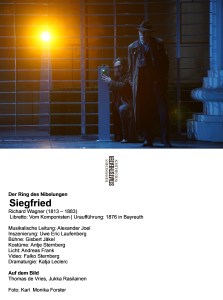The remainder of the cast also contributed to the overall high musical level of the evening. Matthäus Schmidlechner’s Mime was sung in a well-placed tenor that had steel at the top. Jukka Rasilainen ideally incarnated the Wanderer with a world-weary bass-baritone that used its unique vocal colour to bring home his character’s straddling of the past and visions of the future. Thomas de Vries was a very impressive Alberich with a voice of good resonance and rounded tone. The top sounded slightly disconnected but he’s a singer I would gladly hear again (and indeed will do in Monday’s Götterdämmerung). Park Youngdoo’s Fafner sounded quite mighty as the amplified dragon but sounded curiously smaller when unamplified. The resonance seems good but the voice doesn’t seem to carry. Stella An sang the Waldvogel with an attractive fast vibrato and bright tone, but was somewhat cavalier in pitching. Bernadett Fodor’s Erda was sung in a mahogany mezzo with tasteful chesty incursions.