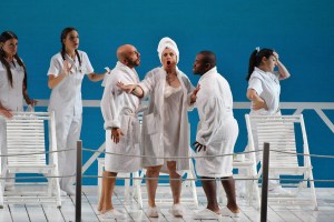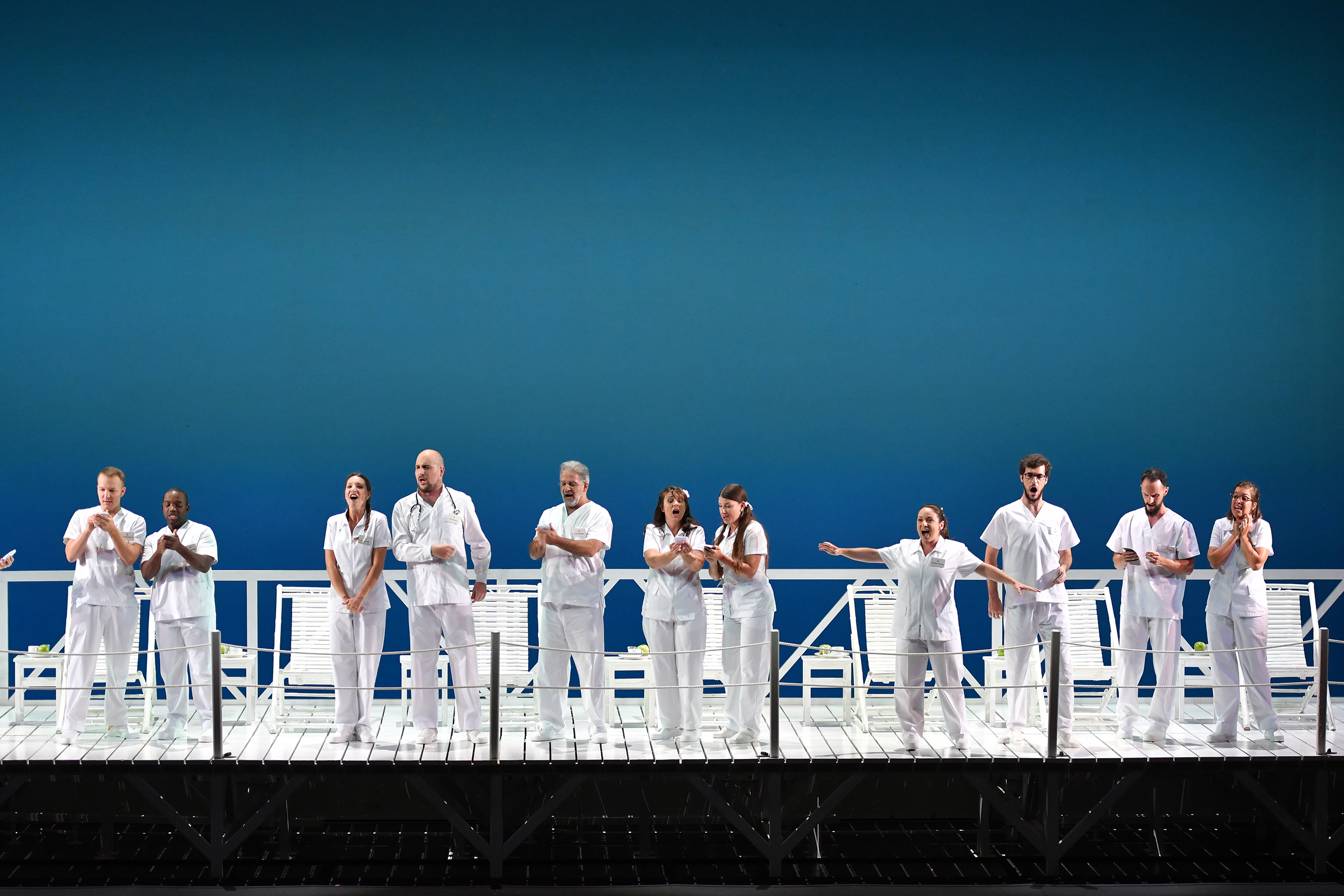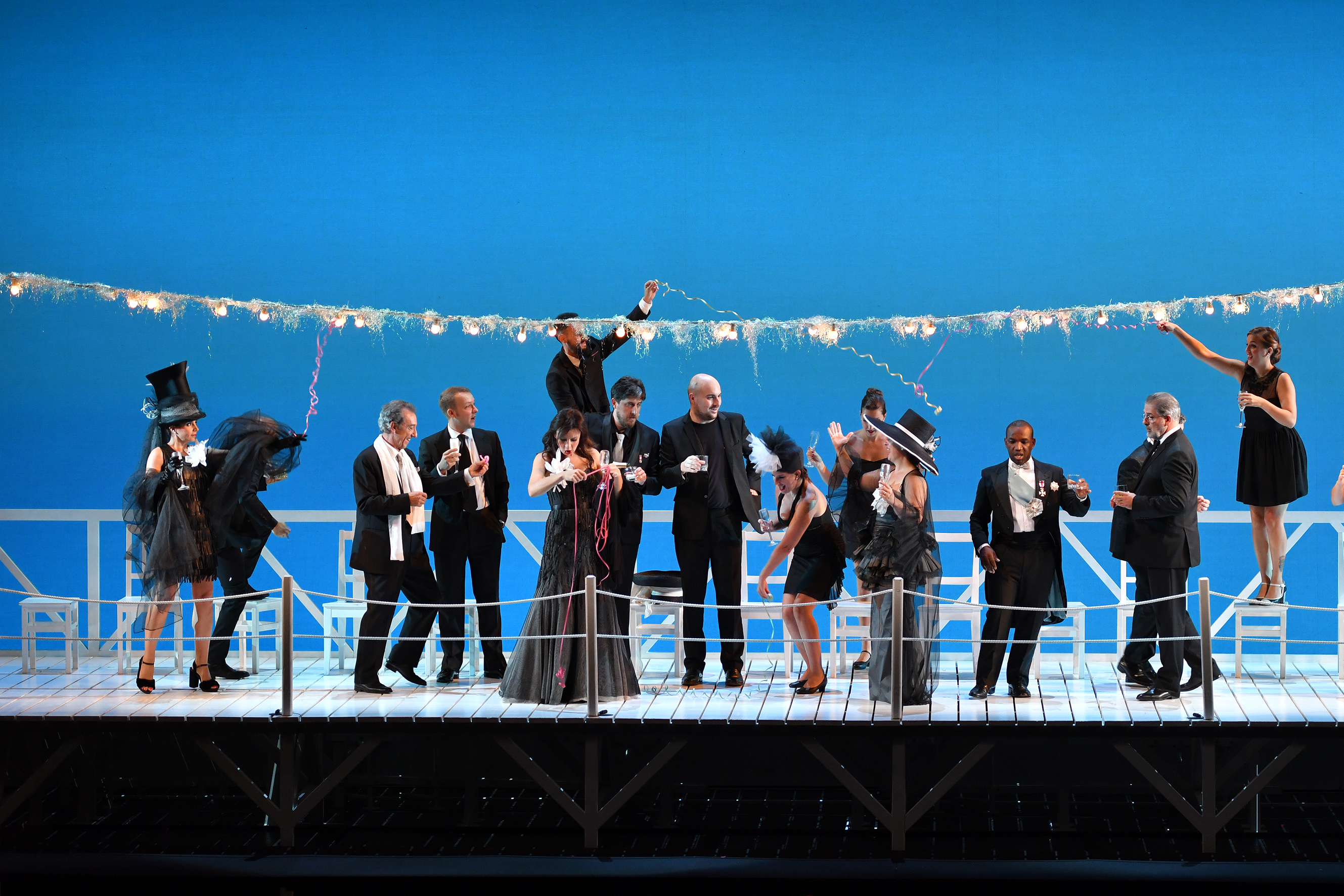 The production was the work of Emilio Sagi. A co-production with Madrid’s Teatro Real, it was imported from the Pesaro Rossini Festival. It was efficient enough and told the story relatively straight. The guests are clearly taking the waters and the action takes place on a simple boardwalk that serves as the single set throughout. At the start, it is suggested that all the characters are apparently working at the spa, wearing name tags. Then we see them given drugs by Don Prudenzio. I thought, at first, that it would be the start of a staging based on sanatorium patients acting out the characters of the opera as therapy – but this was an idea that was swiftly dropped and never seen again. Personenregie consisted of characters addressing the front more than each other and there seemed initially to be very little chemistry between them. And then, in the Melibea/Libenskof duet something happened. Suddenly, Marina Viotti and Lawrence Brownlee turned a routine production into something very special. We saw two people who really engaged with each other, striking sparks off of one another. From that point on, the evening seemed to take flight into a different league, with Irina Lungu’s Corinna subsequently working it across the stage as a deliciously diva-ish Corinna. Sagi does keep quite a witty idea until the end – but I won’t ruin it for you here.