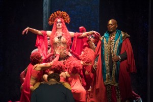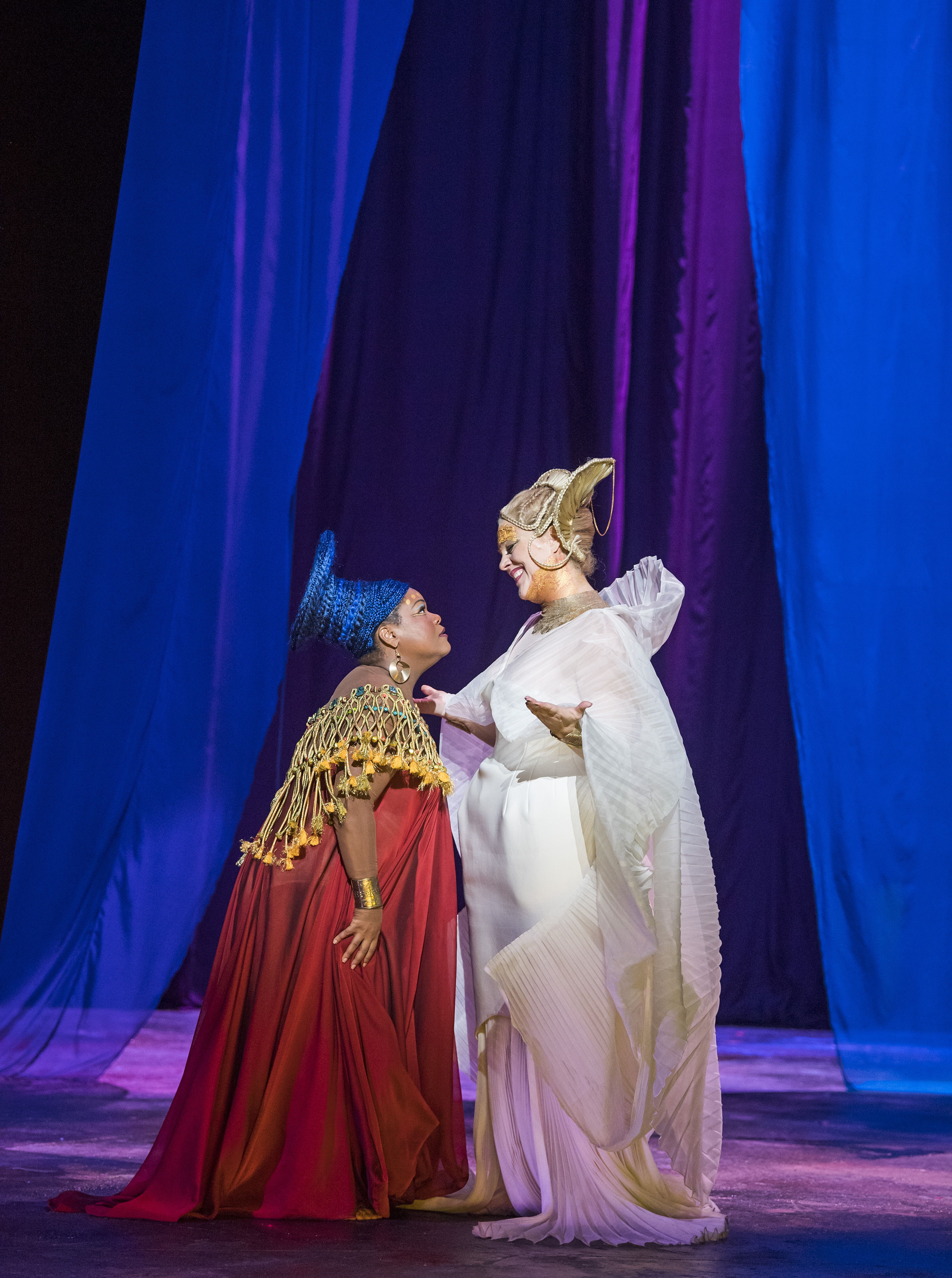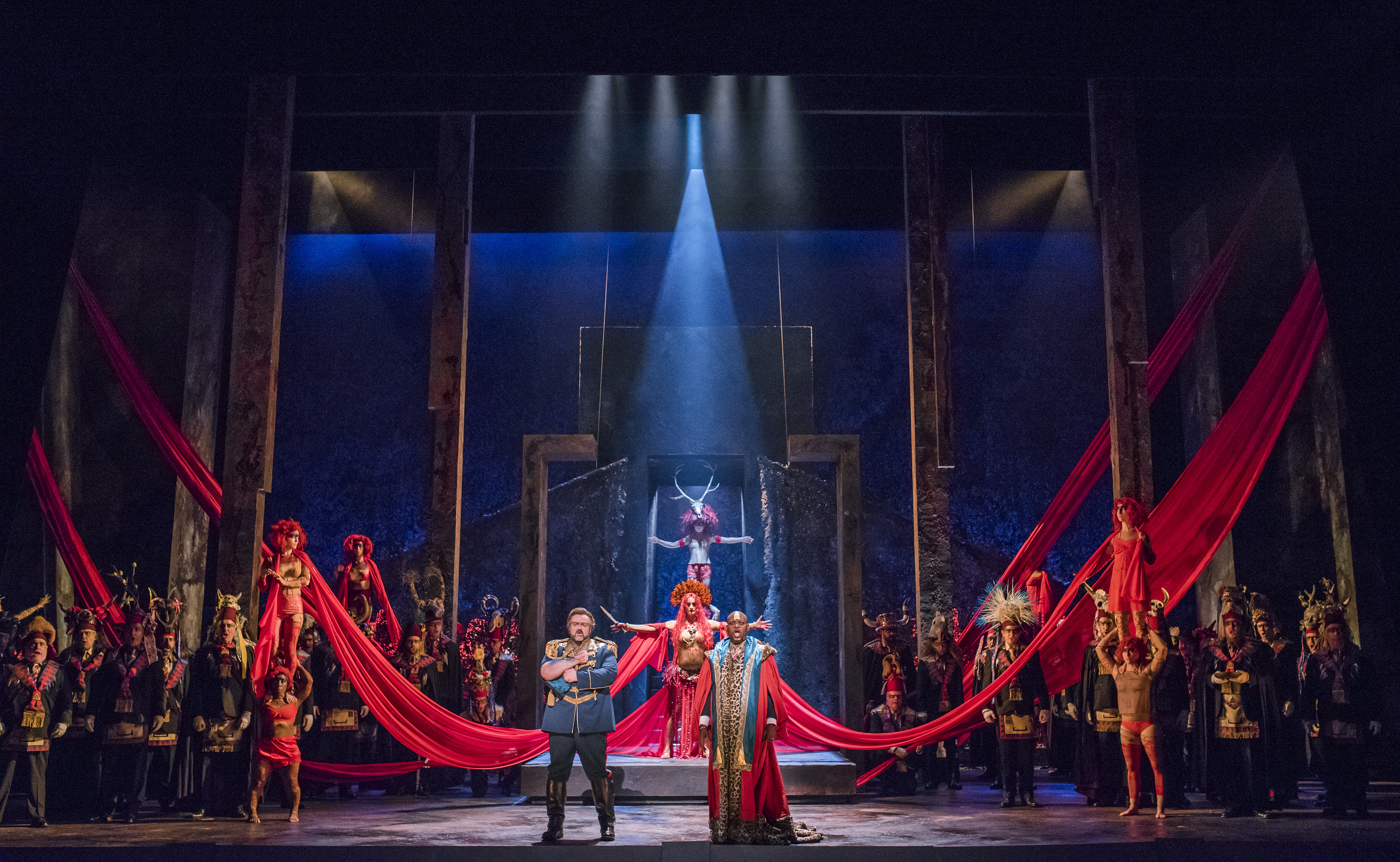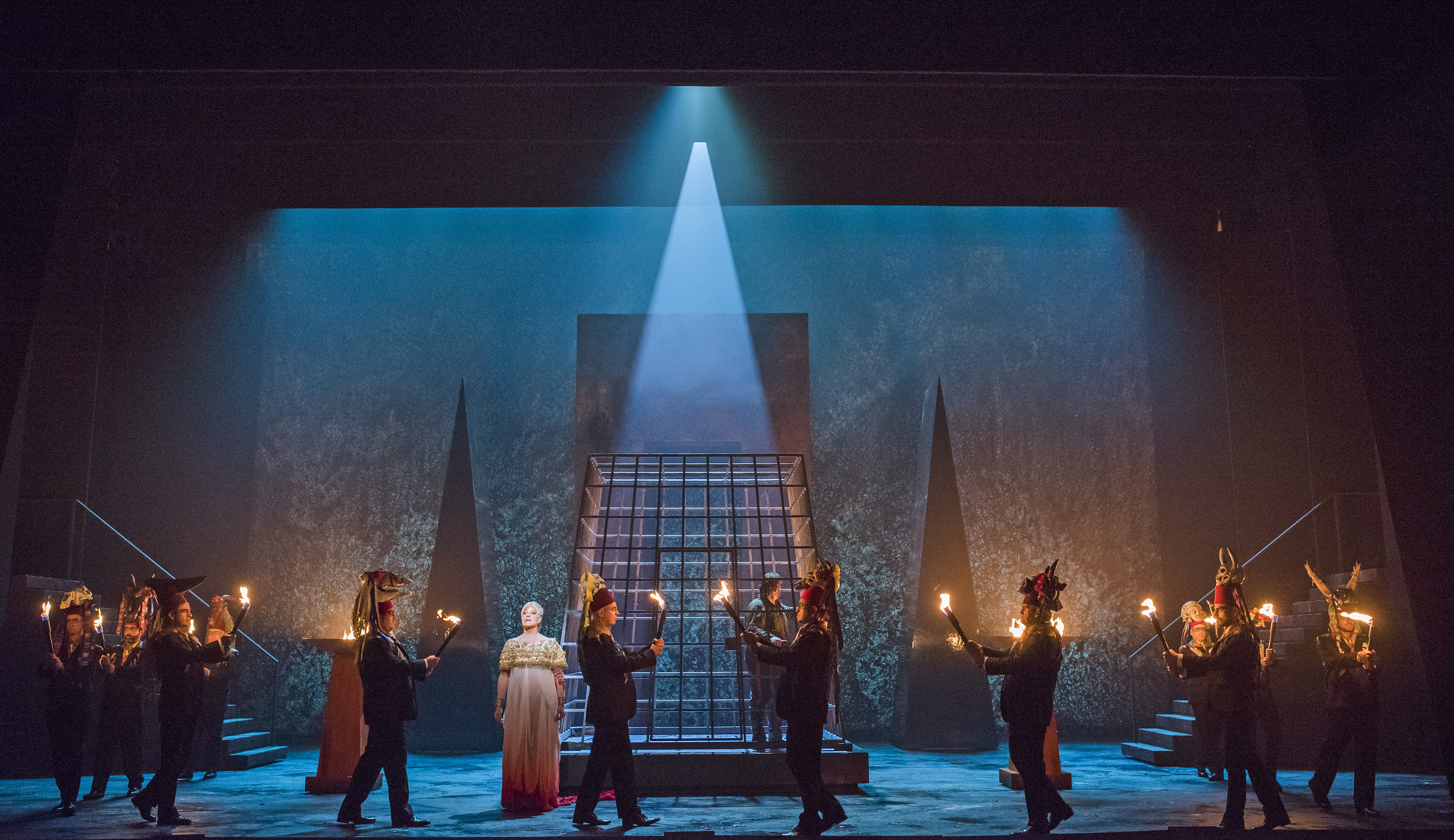 As for Phelim McDermott’s staging, it certainly gave a good show. There was much spectacle with the stage populated with the chorus and actors in the triumphal scene and a striking staging of the tomb scene at the end. The visuals offered much to the eye – redolent of sci-fi meets Halloween, with the chorus ladies going full gothic chic with ornate headdresses. Michelle DeYoung’s Amneris suffered most from the costuming, with a flowing white outfit with huge sleeves that, with arms outstretched, made her look as if she was about to take off. The Priestess also looked like she had taken a wrong turn on the way to the Moulin Rouge. Yet despite this visual interest, far too often, principals were parked at the front to deliver their arias in front of a black drape, behind which noisy scene changes took place. This was a staging driven by the visuals instead of narrative impetus – in most cases, I never really got a sense of who the characters were, nor was there an overwhelming sense of a drama hurtling to its conclusion. I longed for a cogent narrative, something to strip away the layers and reveal the drama behind the spectacle. Perhaps with stronger direction of the principals and less implacable standing and delivering, in many respects we might have had that.
