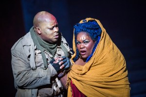 Aida is something of a signature role for Latonia Moore, having sung it around a hundred times in the original. Her affinity with the role was clear – even when parked at the front, she filled the words with meaning, the voice bright with a silvery, cutting edge. She transcended the staging, creating a believable character – both loving and cunning. ‘Ritorna vincitor’ was inclined to sharpness as if pushing the voice, perhaps through nerves, but she soared gloriously over the ensemble in the triumphal scene. Her ‘o patria mia’ was extrovert rather than floated and I did long for her to pull back and float at the top. She was unafraid to give us some chest but the break was obvious at times. Moore, however, is a notable talent.
