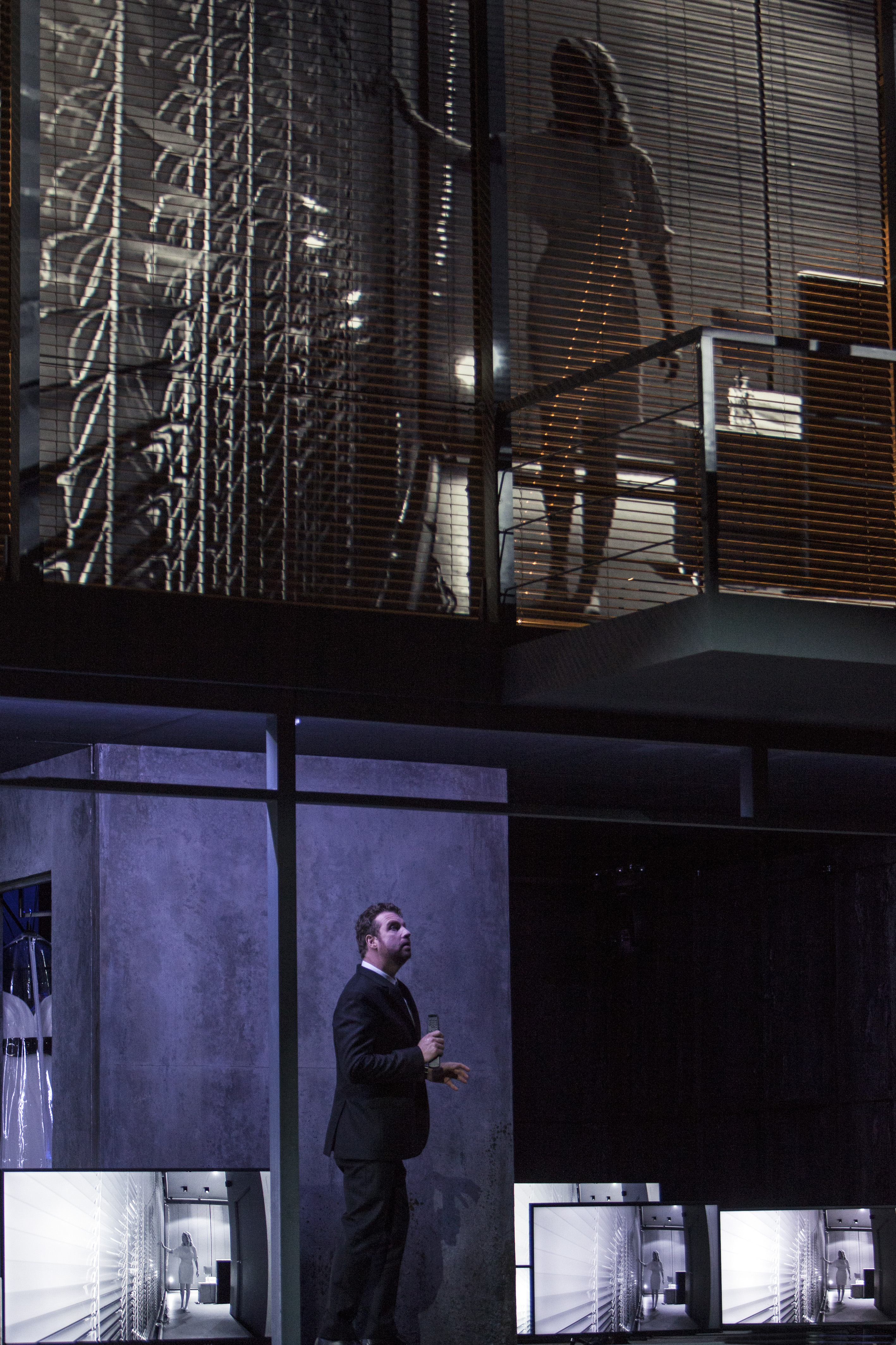 Kratzer, along with Jeremy Ovenden’s Silla, also brings out the full journey of Silla’s character – making the development from dictator to remorse absolutely believable.  In Act 3 as Cinna sings of Jove’s revenge, ‘De più superbi il core’, we see Silla on stage re-watching his videos, confronted by his abuse of Giunia.  As he does so, we see things that weren’t previously played out on stage, Silla mistreating Giunia by slapping and raping her.  The impact of this is devastating, the horror of what Silla did being revealed to us (and to him) in full grisly detail.  Within this awfulness, Ovenden fully manifests physically the shame and disgust that Silla feels, as he realizes what he has done to others, thereby giving us a full insight into his mental journey.  Yet, there was no happy end here – these are characters who are traumatized and for whom life will never be the same again.  I found it a deeply intelligent and psychologically insightful piece of theatre.