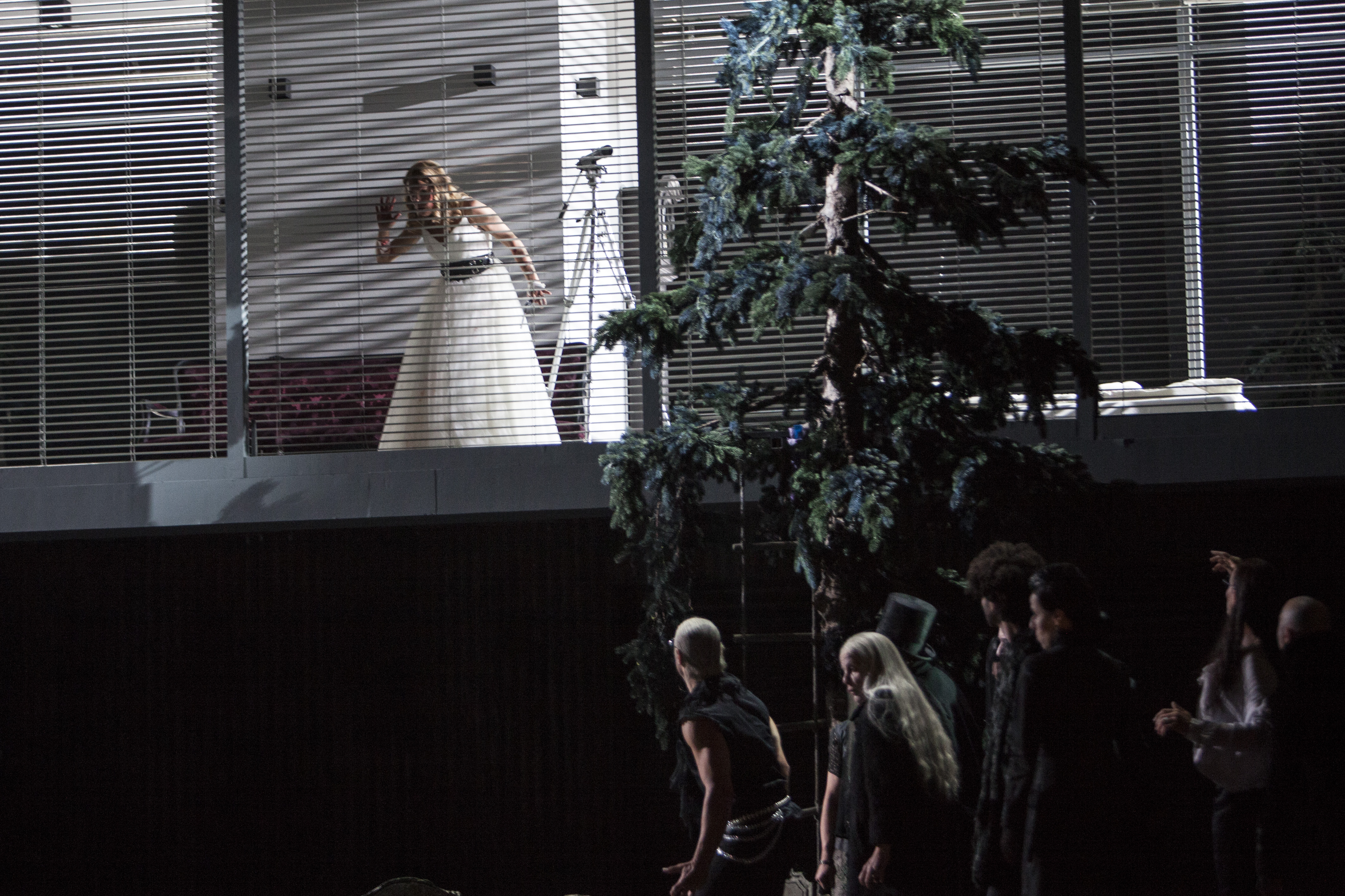 Kratzer and his creative team give us a psychological thriller.  Set in a dictator’s hideout, deep among the pines, the revolving stage shows the action from multiple aspects.  What we see is an intelligent meditation on the corruption of power and the lack of humanity engendered by that power.  Kratzer also plays around with the idea of watching and being watched.  He sets the tone at the start with a video sequence showing leaders (JFK, Putin, Chaplin’s Great Dictator) but even here there are hints of what is to come with VHS cassettes appearing in the film being labelled and organized.  As the evening progresses, we realize that the captive Giunia is being watched in her captivity by Silla.  We see her shaving her legs, filmed and magnified across the stage, and as she does so, she cuts her leg.  This is harrowing to watch for us (several audience members audibly gasped) but for Silla, this obsession with blood is something that he lives from – we see him earlier playing with a knife, cutting himself and sipping blood from a cup.  It sounds heavy-handed on paper, but it never feels it.  This is also a work that lives in the shadows and the stage environment and highly effective set (Rainer Sellmaier) reflect that.  The milieu outside of the house is dark, where the chorus as zombies emerge from the pines and a hound (the exceptionally well behaved Indy) runs around the stage, taunting Cecilio as he dares to enter Silla’s estate.