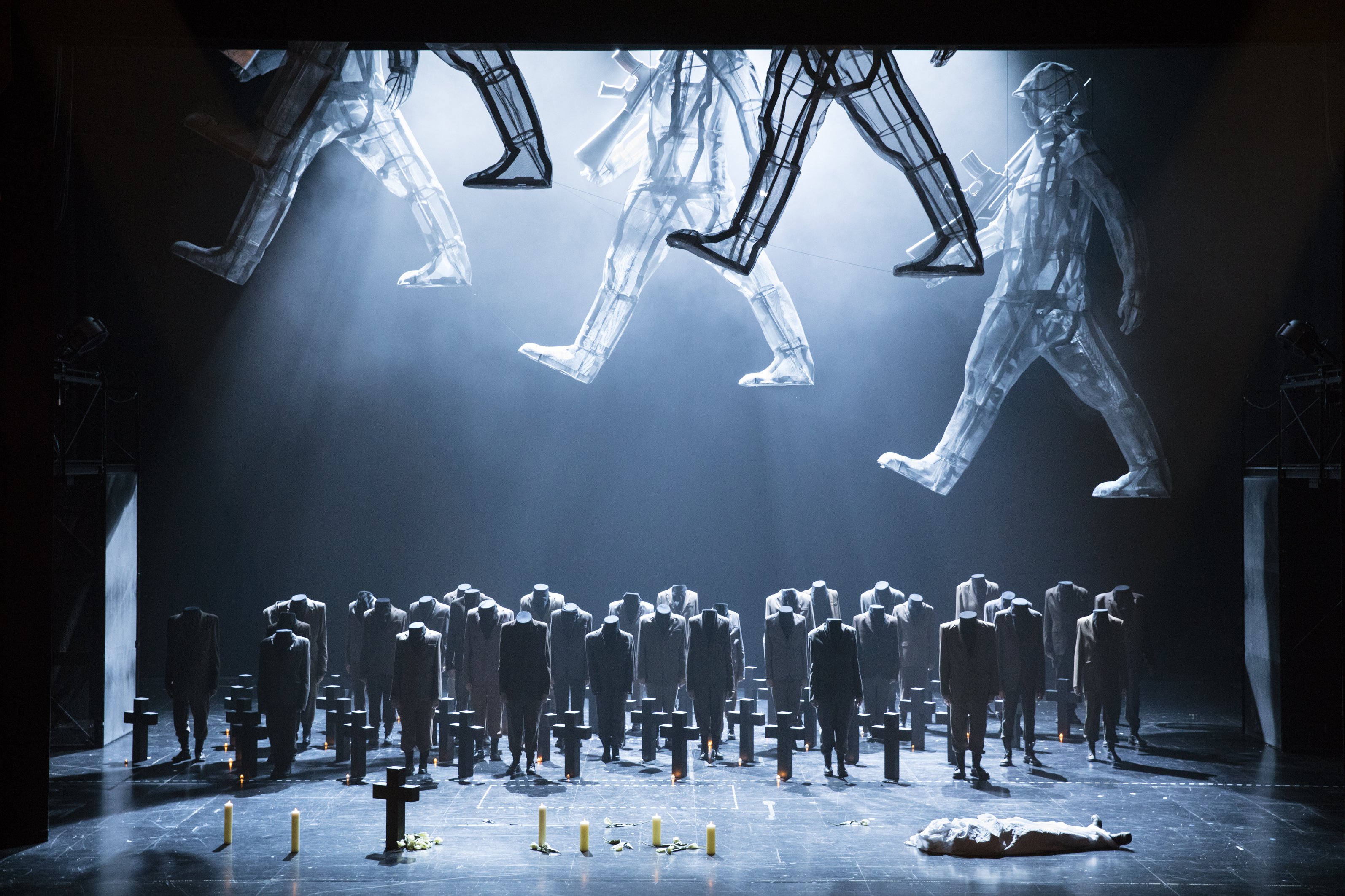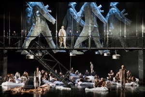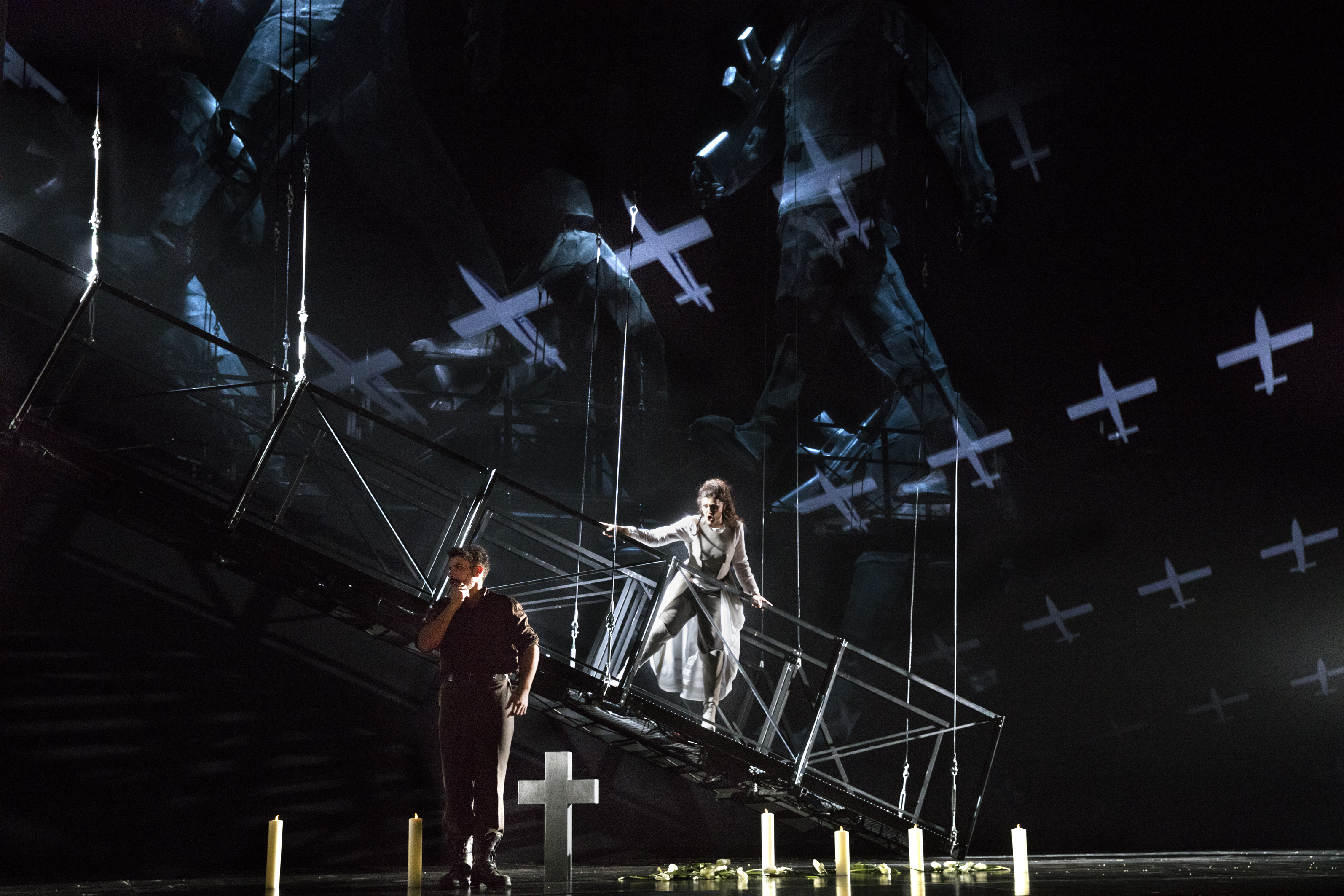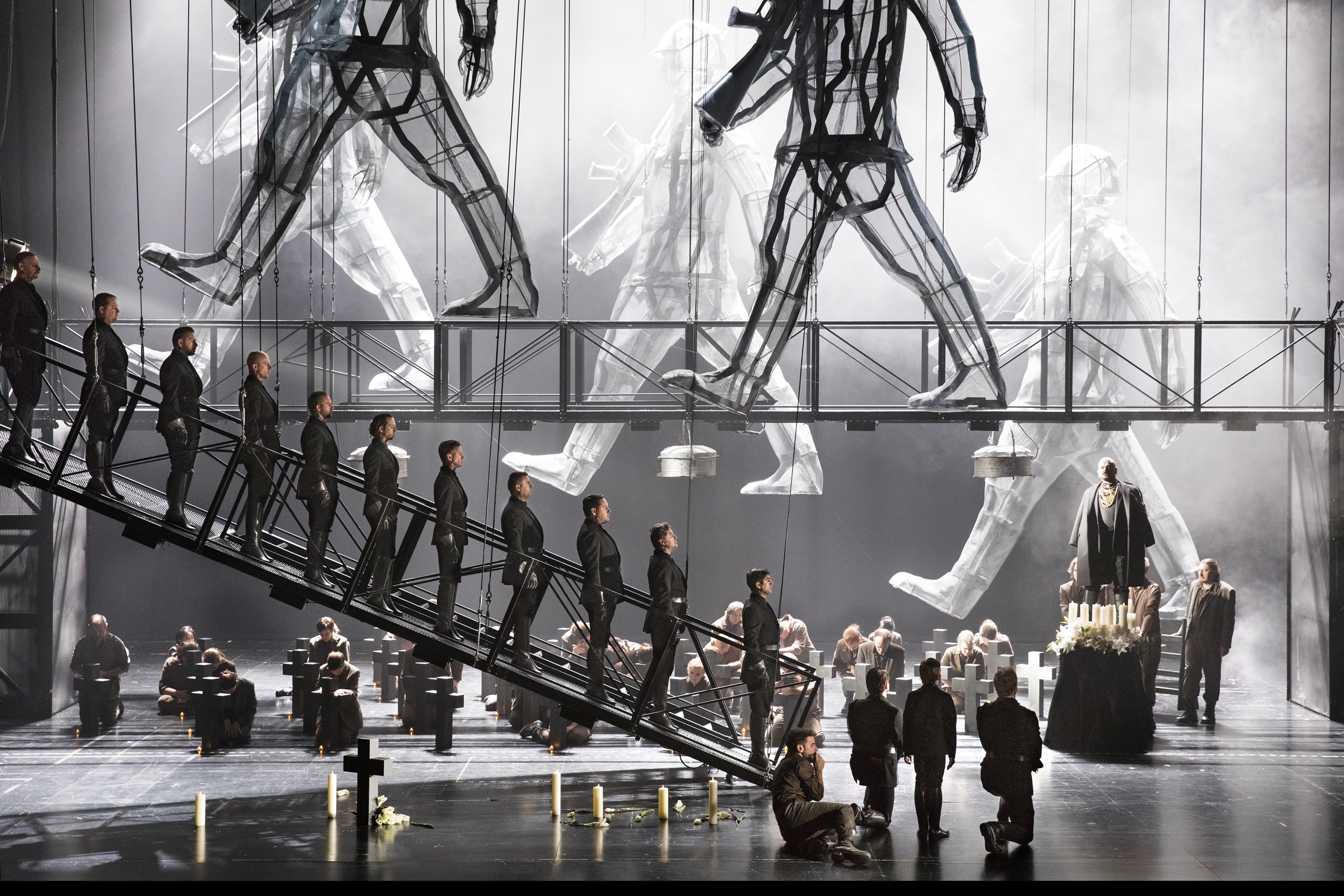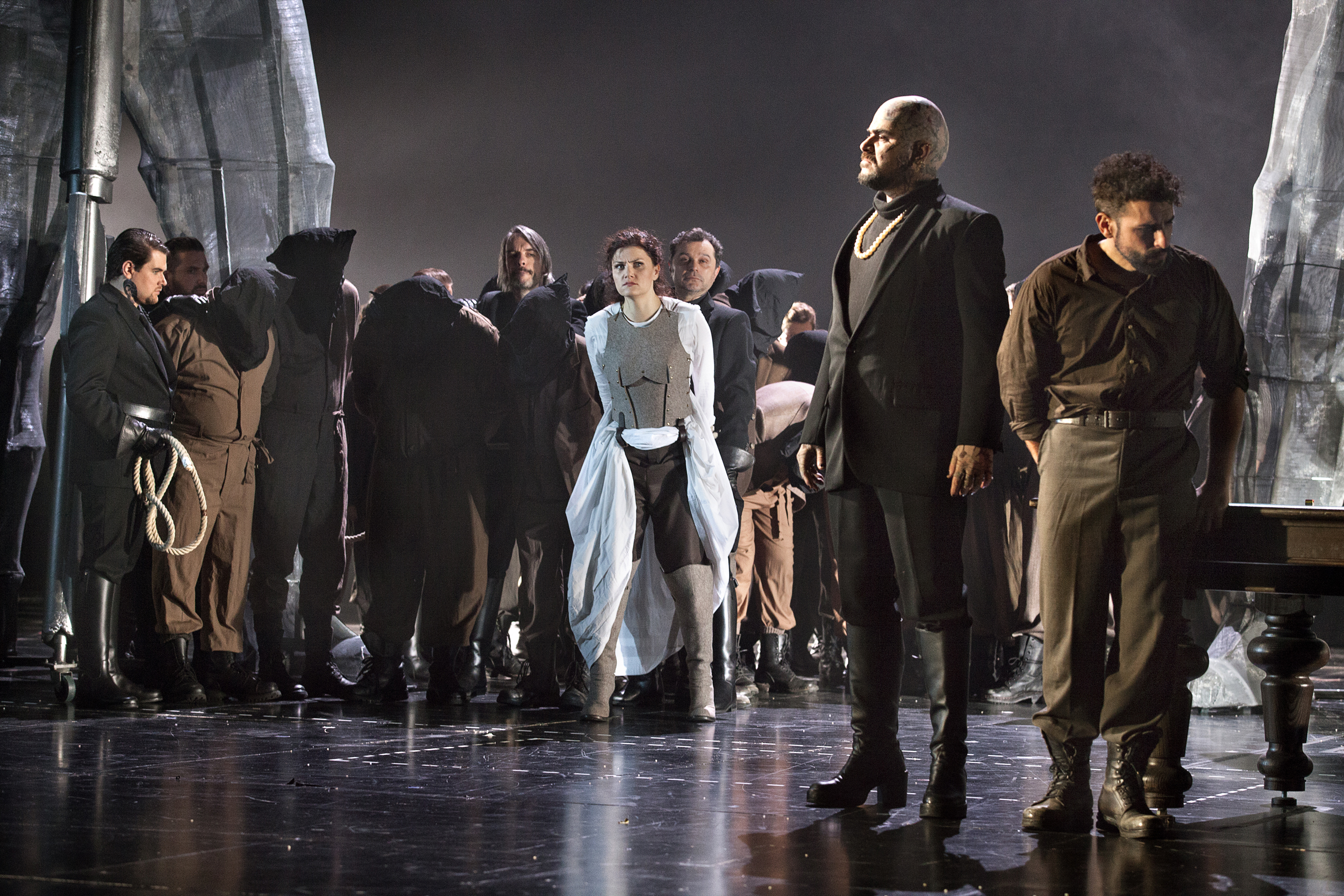 Particularly so because, in its first revival, Carlos Wagner’s staging feels altogether far too timely. In the opening scene we see Spanish soldiers in black uniforms toasting ‘vive l’Espagne, vive son roi’ while the people below tend to their injured. The effect, at least for me, was shattering – especially with memories of the events of October 1st this year in Catalonia so fresh in the mind. Wagner gives us images of an almost dystopian near future. The staging is dark and pervaded with an air of fear, of the fact that danger lies around every corner, where being with the wrong people, or caught in the wrong place can result in instant death. There is humanity here – the tender relationship between Hélène and Henri flourishes despite adversity. Personenregie did however consist of a fair bit of standing and delivering, with characters often duetting with each other from opposite sides of the stage. And yet, there was an undeniable impact to the staging, partly as a result of the current environment but also because the stage pictures are so striking. As Henri sings his beautiful ‘anges des cieux’ (the same melody as ‘ange si pur’ from La Favorite), we see him tending to the graves of those who went before. In turn, the final scene sees the chorus mourning rather than celebrating. The Duke may have left, but the effects of his actions will have real and tangible consequences for generations to come.
