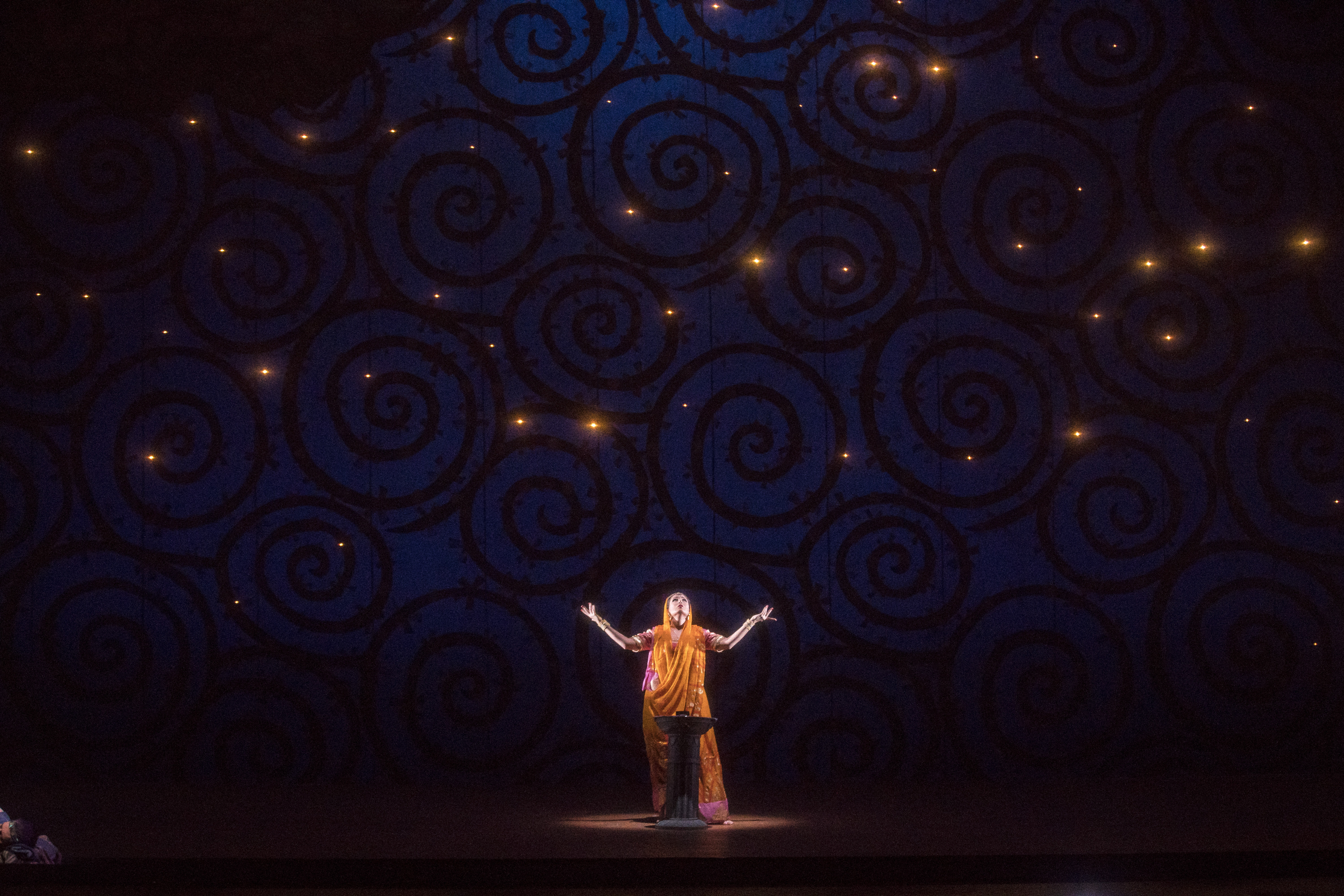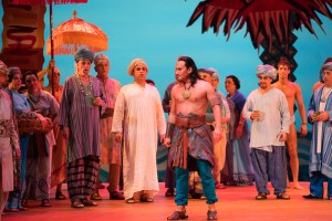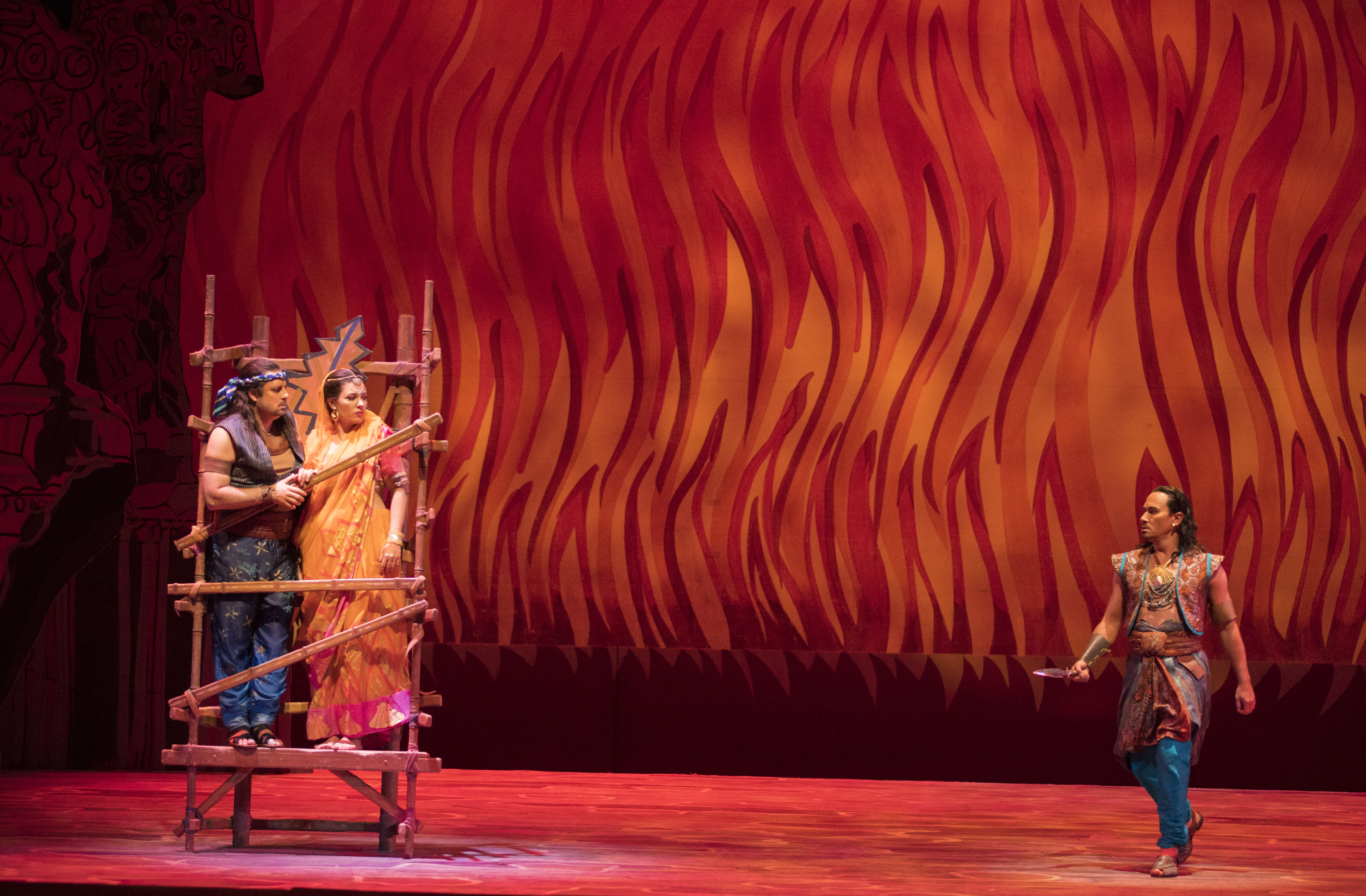 Andrew Sinclair’s staging plays it relatively straight. There is a simplicity to his storytelling that certainly is a strength – the idea of Zurga representing the new regime and Nourabad the old feeling threatened by the new is hinted at, but not quite fully brought out, at least until the final scene. What Sinclair instead gives us is a good, old-fashioned show and it was warmly received by the audience. The designs (Zandra Rhodes) were colourful (though perhaps garish would be a more appropriate description) and there was a lot of ‘local’ colour in the costumes (also Rhodes) with some outfits that would not look out of place in a Bollywood hit. Yet, despite the visuals, the personenregie was somewhat conventional – a lot of standing and delivering, while the chorus was parked along the sides and a ballet corps, in a nod to the French opera ballet tradition, added a dancing contribution. There were balance issues due to the placement of the chorus with individual voices sticking out, something that wasn’t apparent when they were placed off-stage.