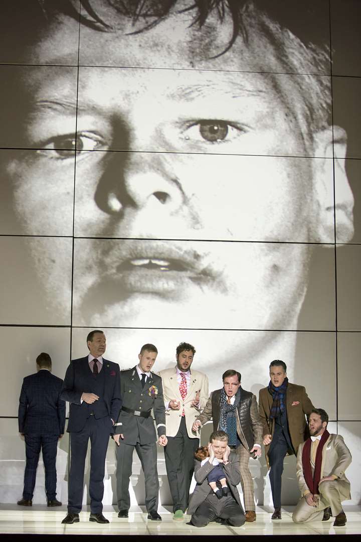 In many ways, what’s left unseen is more important that what is seen. Bieito forces us to imagine what exactly – we know that the ‘kinder’ of the populace are going missing, being abducted. The few clues he gives us seem to point to a pedophile ring, yet the true horror of the reality is one that’s left to us as an audience to conceive of. This Gezeichneten is a sister staging to Bieito’s Zürich Fiery Angel – there, Renata’s face was projected onto the stage curtain; here, on the white backdrop before which the action takes place, we see images of nameless children.