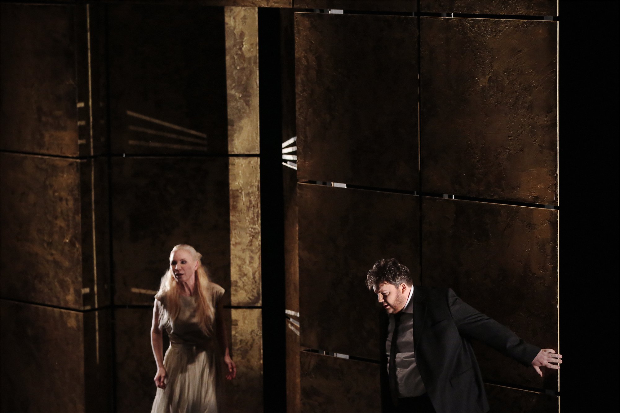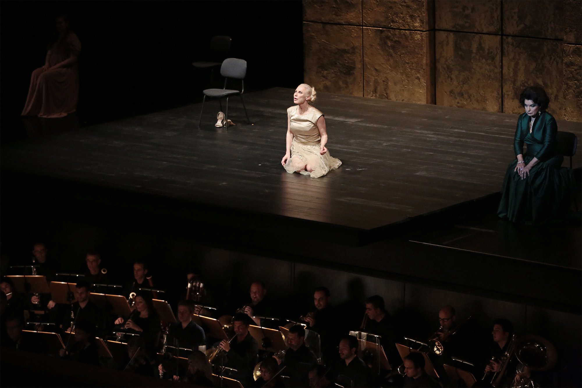 Today’s Elektra was initially advertised as a semi-staging – a good solution for a house that isn’t the most financially endowed.  Yet what we got, was much more than that.  Entrusted to Nicola Raab, a young Bavarian director rapidly making a name for herself, we saw a piece of theatre that left food for thought and reflection.  As we entered the auditorium, we saw a large wooden square in the centre of the stage.  This is later revealed to be Elektra’s hovel.  The other family members (except for Orest) enter and take their places behind music stands outside of the wooden square, Elektra being the only family member who does not have one.  As the evening develops, the music stands become left behind, occasionally abused, as were a few chairs thrown around.  Only the siblings are able to enter Elektra’s square, while Klytämnestra conducts her scene from just outside it.  A large door behind the square adds visual interest, occasionally opening to reveal a void behind or Klytämnestra’s bloody handprint as she expires.  As a framework, it’s an interesting one – Elektra’s trauma confining her to a space that no one else can reach.  And yet, it did seem perhaps inconsistent in approach.  Especially so – due to Elektra’s isolation – with characters having to permanently deliver their lines to the front rather than to each other.  Interesting how the servants gathered round just as Orest revealed himself to his sister – a nod to Chéreau’s staging perhaps.  It was also wonderful to have the house chorus singing their off-stage lines from the rear of the auditorium, bathing the room in waves of rapturous shouts.  On the whole it was a clever solution, much more than a semi-staging but perhaps lacking the intricacies of a fully-staged one.