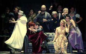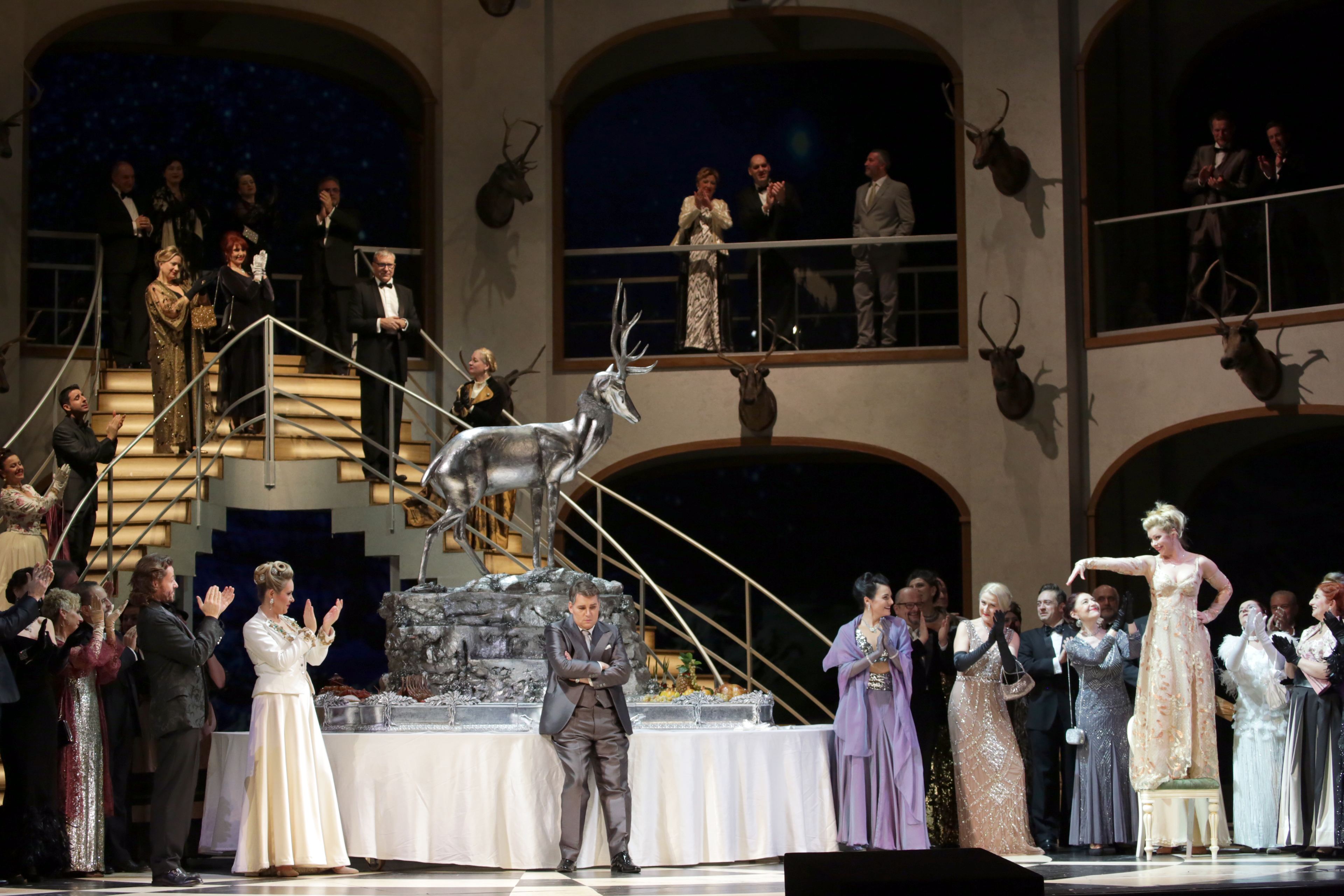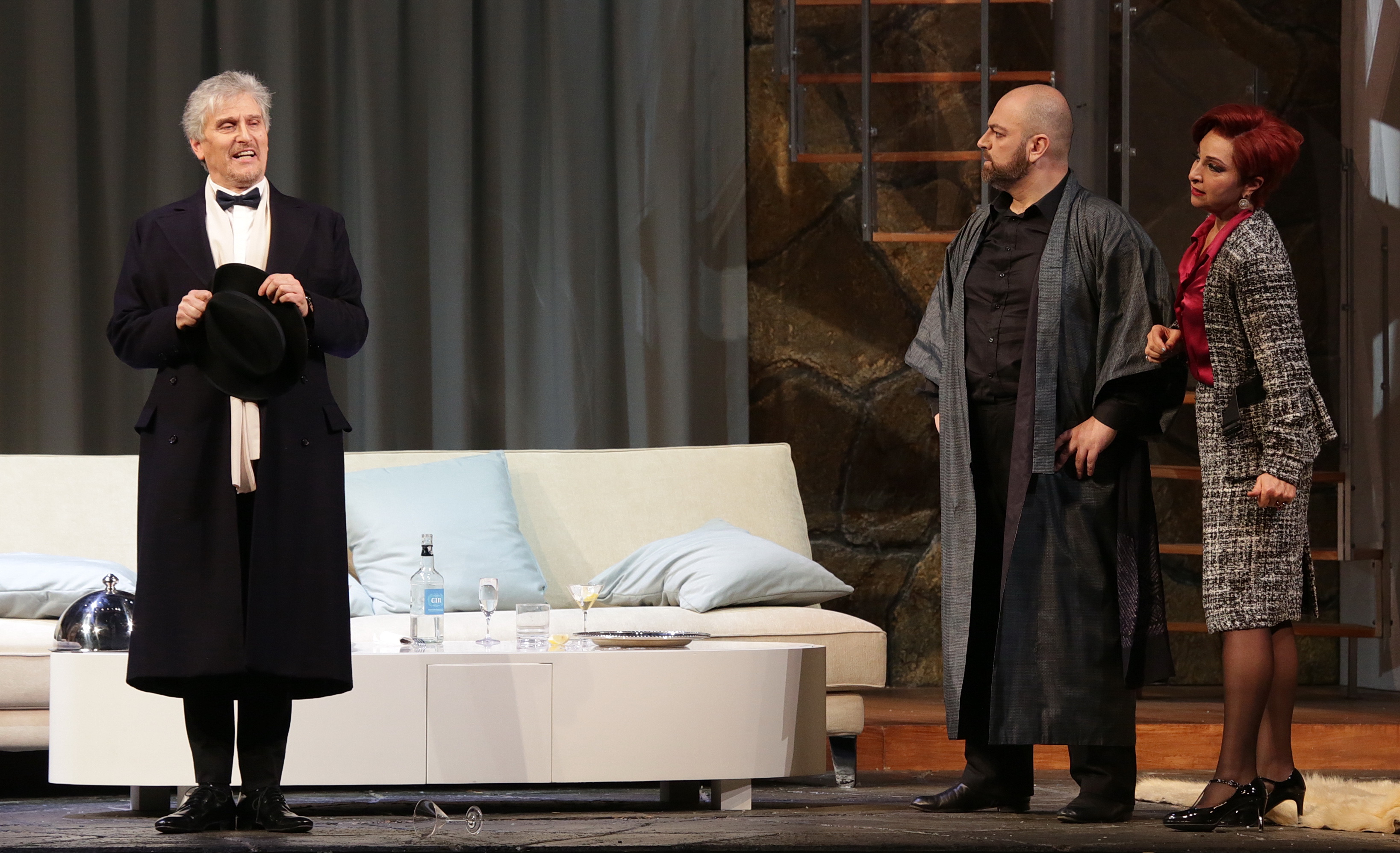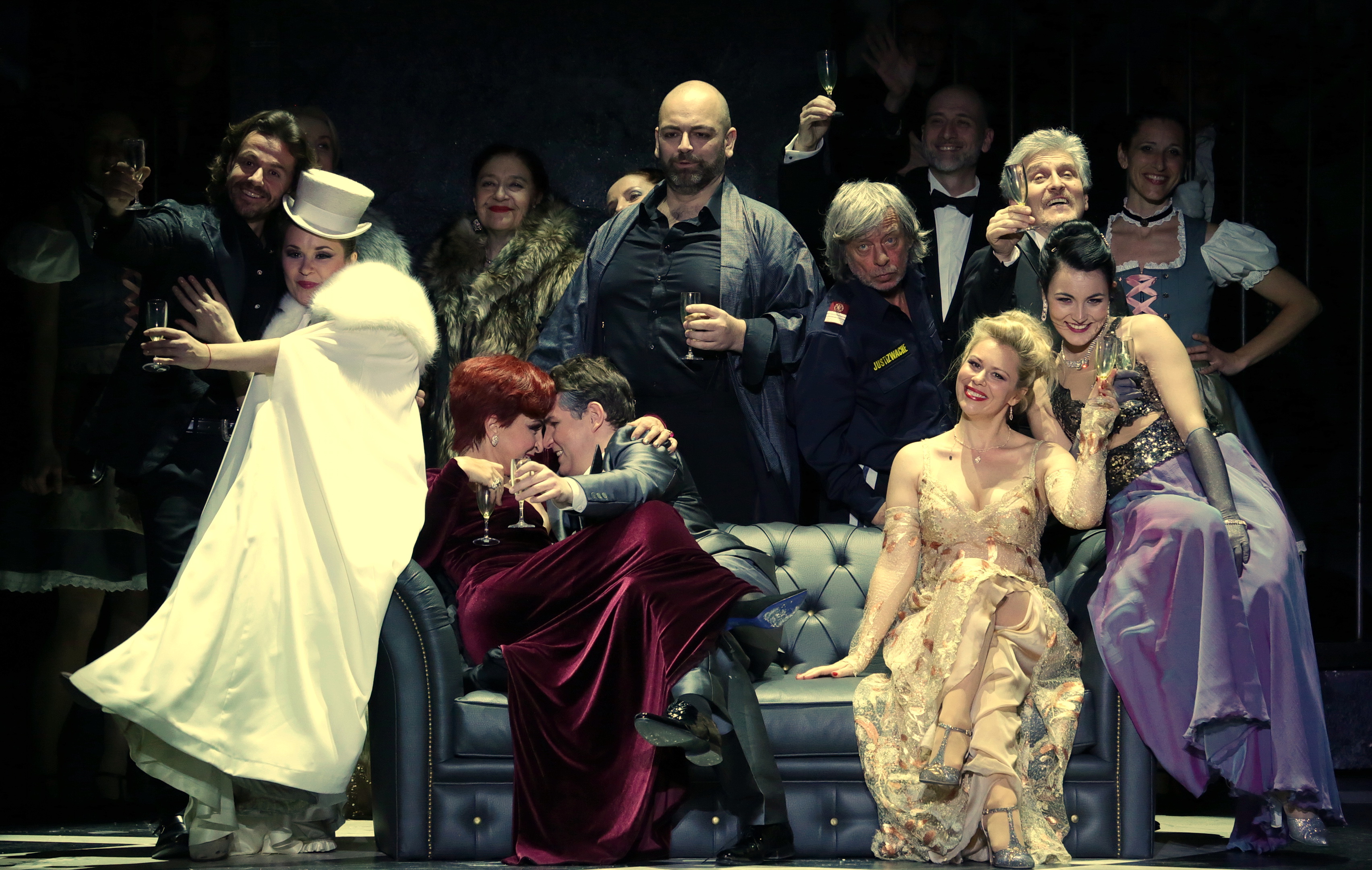 Indeed, you did read correctly as here, Prinz Orlofsky became Principessa Orlofskaya. Yelena Maximova might have been dressed in a ball gown but she was also able to drink the men of the cast under the table and was also quite inclined to give Adele a passionate kiss on the lips. While it did require a few very minor changes to the sung text, I felt it did actually work. The Italian influence was not only heard in the dialogue. Girorgio Berrugi’s Alfred was also somewhat of a parody of the Italian tenor, bursting into phrases from Ballo, Cavalleria Rusticana and Traviata at any given moment to express his love for Rosalinde. It was also an extremely handsome show. Sets (Heike Scheele) ranged from a mountain villa, to a palatial party, to a dark prison, looked good and allowed the cast just the framework they needed to allow the narrative to take its course. The presence of the house’s corpo di ballo added a celebratory air, although I’m not quite sure what the pair of trapeze artists brought other than a horrible fear that they might fall off – they didn’t and they certainly impressed with their skill. While the first two acts flew by, there were issues of pacing in the third, with Frosch’s monologue, here delivered by actor Paolo Rossi, seemingly lasting an eternity. That said, the audience found it absolutely hilarious, so it may well be that the local humour was lost on me.