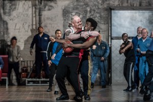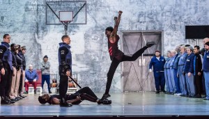 Where Warlikowski’s vision also has tremendous power is in the way he allows each of his characters to search for freedom and resolution in his own way. The curtain rises on a single prisoner, playing basketball. As the first act progresses, he is brutally attacked by Nikita and left in a wheelchair. We come to realize that he is in fact the eagle mentioned in the text. Towards the end of the evening, we see him emerging from his wheelchair, finally finding freedom from his confinement and learning to shoot hoops again. Similarly, another character finds expression for his frustration through dance, bringing beauty among the horror, making the most of limited space. For others, finding relief became even more drastic – Luka/Filka finding his resolution through suicide. I found it an exceptionally powerful piece of theatre, one that made me reflect on what it really means to lose freedom and still find a way to express oneself, to survive despite adversity. In these bleak days in the UK, where we see both main political parties voluntarily taking our rights of free movement away, wanting to imprison their citizens on a rainy rock in the north Atlantic, Warlikowski’s staging felt immensely relevant and powerful.