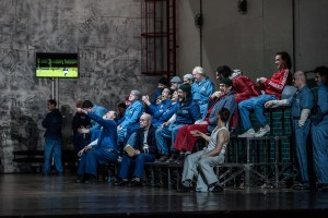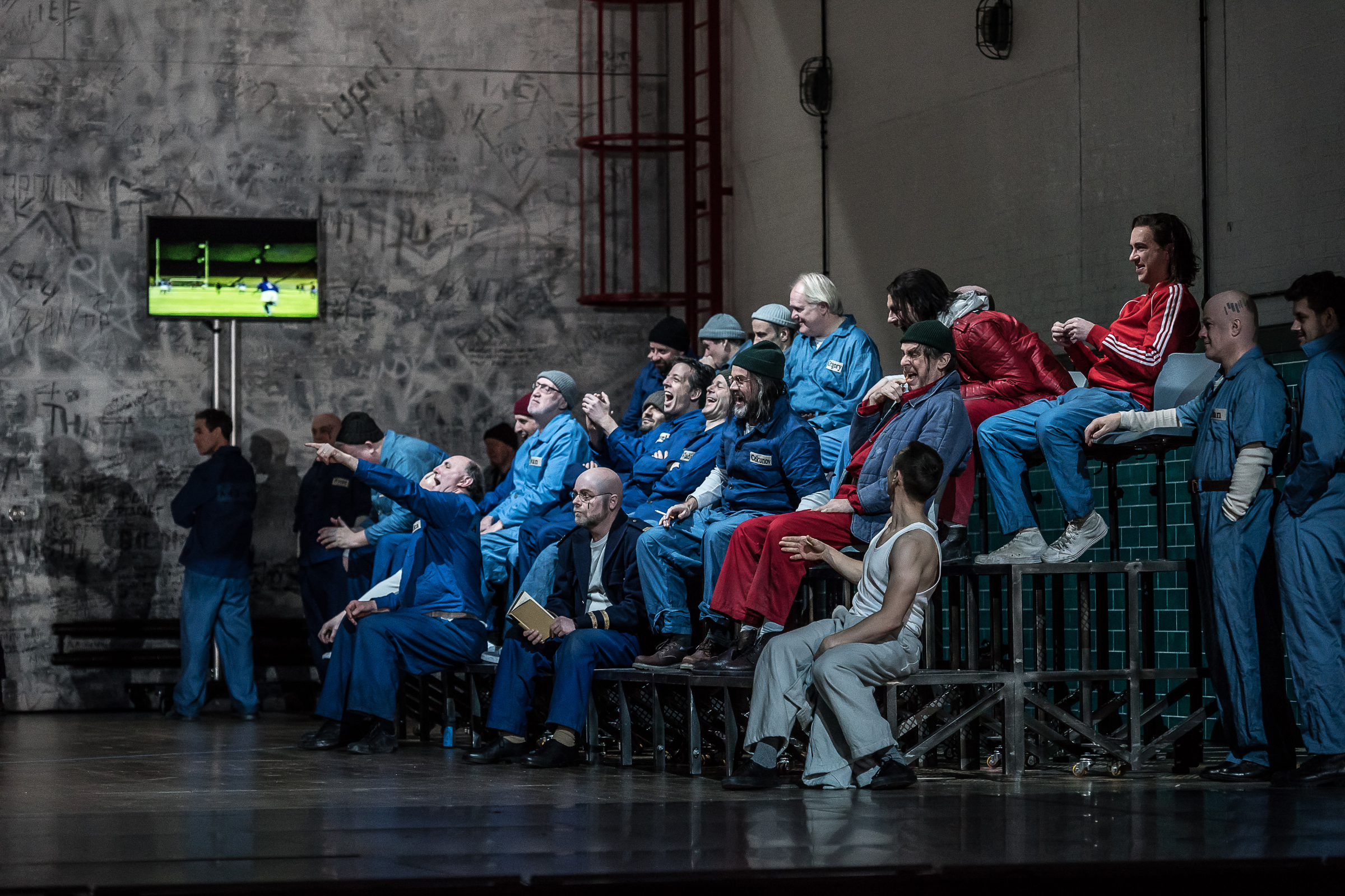 The sheer detail that Warlikowski brings to his mise-en-scène is staggering. In fact, it’s probably impossible to take it all in on a single viewing. The film being shown on the TV at the back of set (designed by his long term collaborator Małgorzata Szczęśniak), the constant movement, the guards ever present – watching. Yet in doing so, what he manages to create is precisely that world of individuals living in the prison environment. These prisoners are not faceless, anonymous bodies, rather they are individuals – each with his own backstory – whose life choices led them to this brutal place where their freedom was taken away and conventional laws and morality no longer apply. In doing so, Warlikowski brings out the central tenet of Janáček’s work. This isn’t an opera with a conventional narrative per se, rather it’s a work that exists in its own space, separate, without a sense of time, in which characters emerge from the mass to tell their stories. I can understand why some may feel overwhelmed by this approach, not knowing where to focus. Yet it feels all of a piece with this universe in microcosm, precisely because it brings home the multitude of characters existing within it.