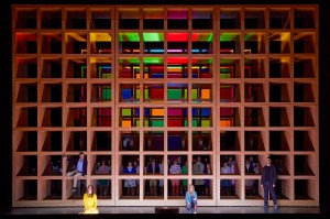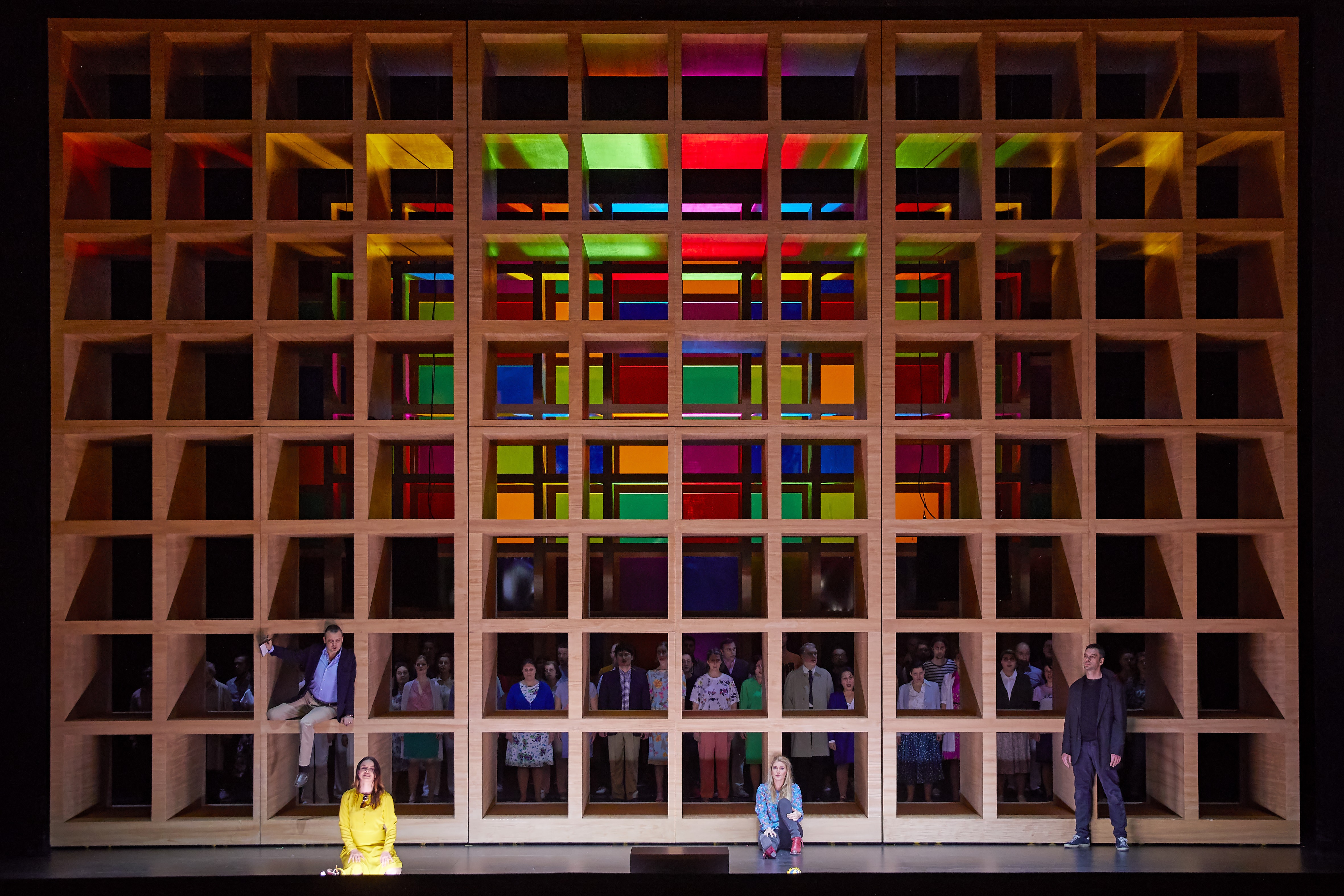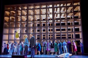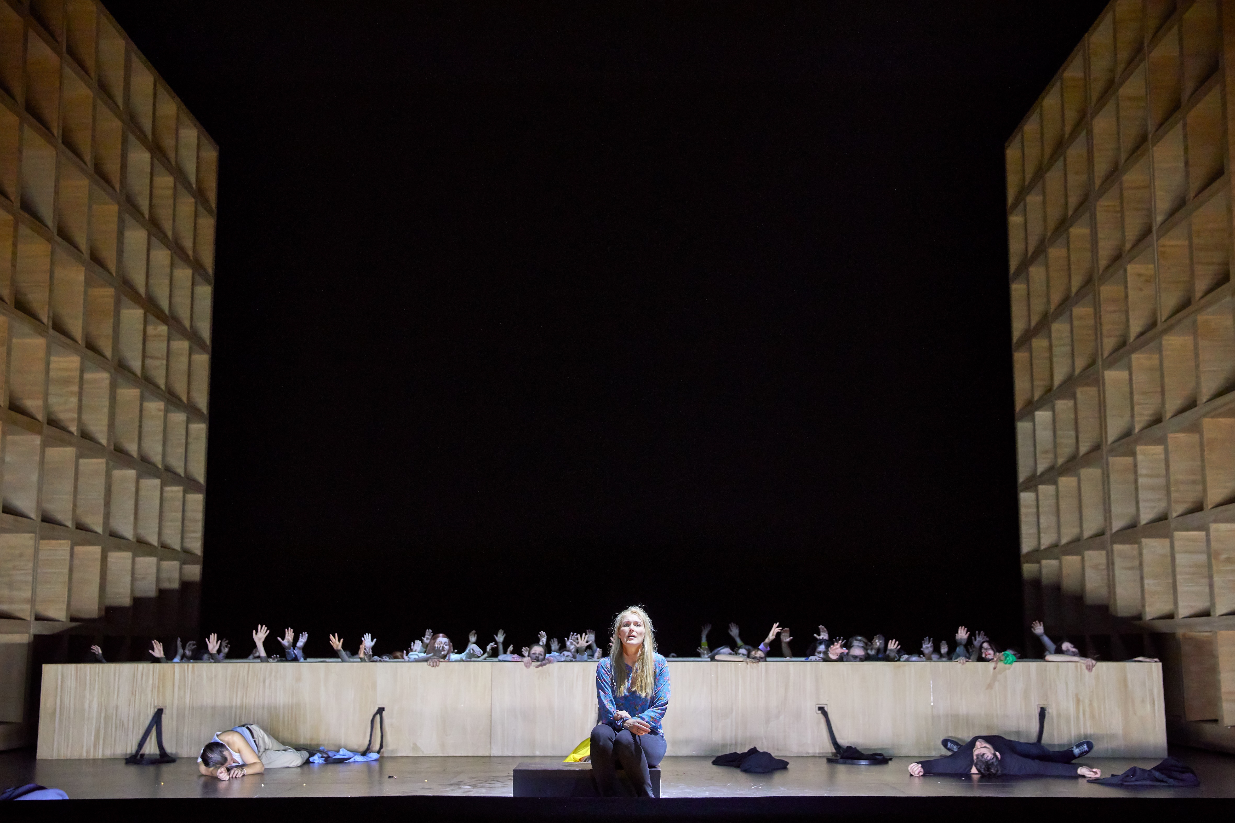 These wooden structures reflect the cemetery walls commonly found in the Iberian peninsula. The massed forces go through them, climb up them and later, hide in them. They are rotated around as if to demonstrate how grief never remains constant, but changes and develops with time. It also highlights to us that constant presence of death. The ‘agnus dei’ started with the two soloists off stage, gradually rejoining the chorus as the variations proceeded. It was deeply moving, their voices calling out for comfort and met with the humanity of the chorus. In common with Bieito’s other more recent work, this was a piece of theatre that didn’t give all the answers, but allowed the spectator to live it through the eyes of his or her own experiences. There’s also a desperation there. In the ‘tuba mirum’, the chorus with hands outstretched calling out for answers, the off-stage trumpets thundering through the room, felt incredibly direct compared with the sepulchral voices from beyond as the opening ‘requiem’ emerged from darkness.
