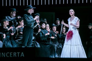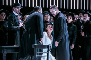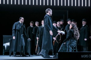 Hilsdorf is a name new to me although he is one of Germany’s more active stage directors since his operatic debut in Gelsenkirchen back in 1981. This was his Dresden debut. His staging is built on simple visuals. An open set, chairs arranged around the back, a long dining table along the side and rows of fluorescent strip lights along the back of the stage. The almost exclusively black stage furniture and black costumes give the visuals an elegance and clean simplicity that I found had the potential to work well, in that it gave the opportunity for the singers to guide the action. And yet it felt that characters were under-directed, usually staring into the middle distance, barely engaging with each other and the chorus was marched on, parked and then marched off again. Although I must say the man vomiting at the side of the stage after the mad scene did offer some visual interest. The constant presence of a bed at the centre of the stage held some symbolic value and provided the opportunity of a big reveal of Arturo’s body during the mad scene. The rows of lights at the back were migraine-inducing in their brightness and surely a warning should have been given to epileptics due to the way that they flashed as if replicating lightning in the Wolf’s Crag scene. The appearance of a ghostly figure as Lucia sang ‘regnava del silenzio’, brought back some traumatic memories of Katie Mitchell’s London Royal Opera staging – although the ghost was seen once and never returned thereafter. This was a society where nobody had privacy and it was impossible to be left alone. Certainly, at least until the final scene, where Edgardo is alone on stage, the chorus singing from the pit. It made for a strong finish and undoubtedly the strength of Hilsdorf’s approach is in the clarity of the visuals – even if what happens within those seems underdeveloped.