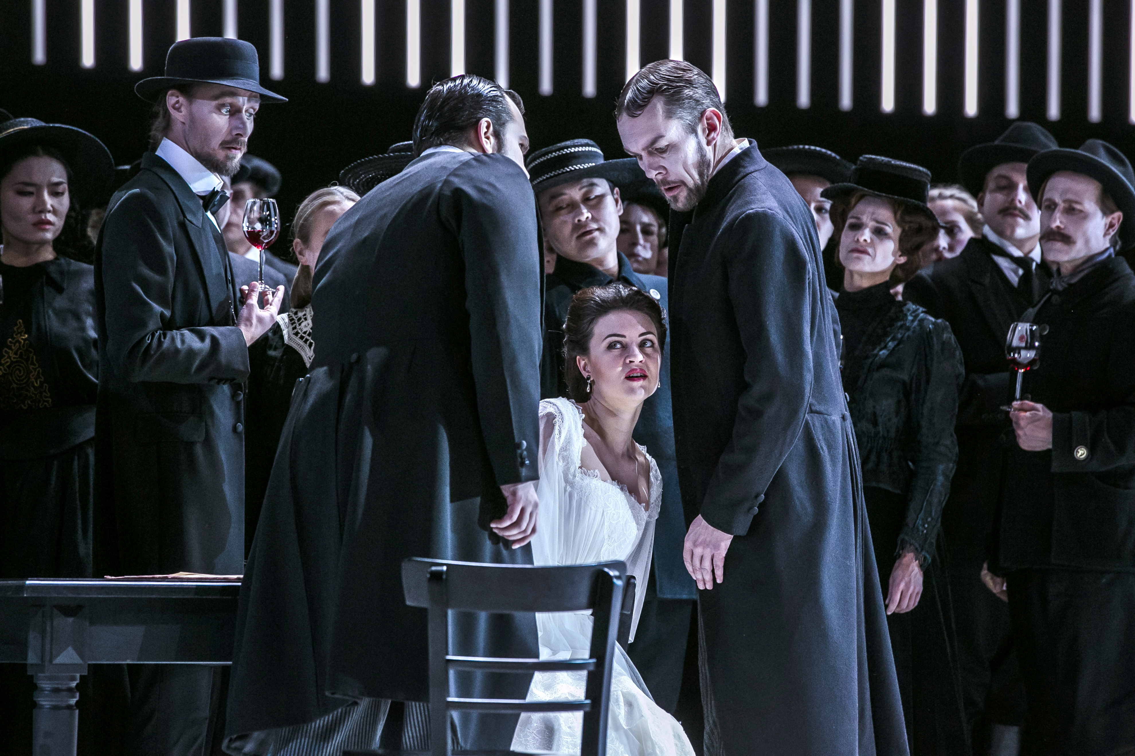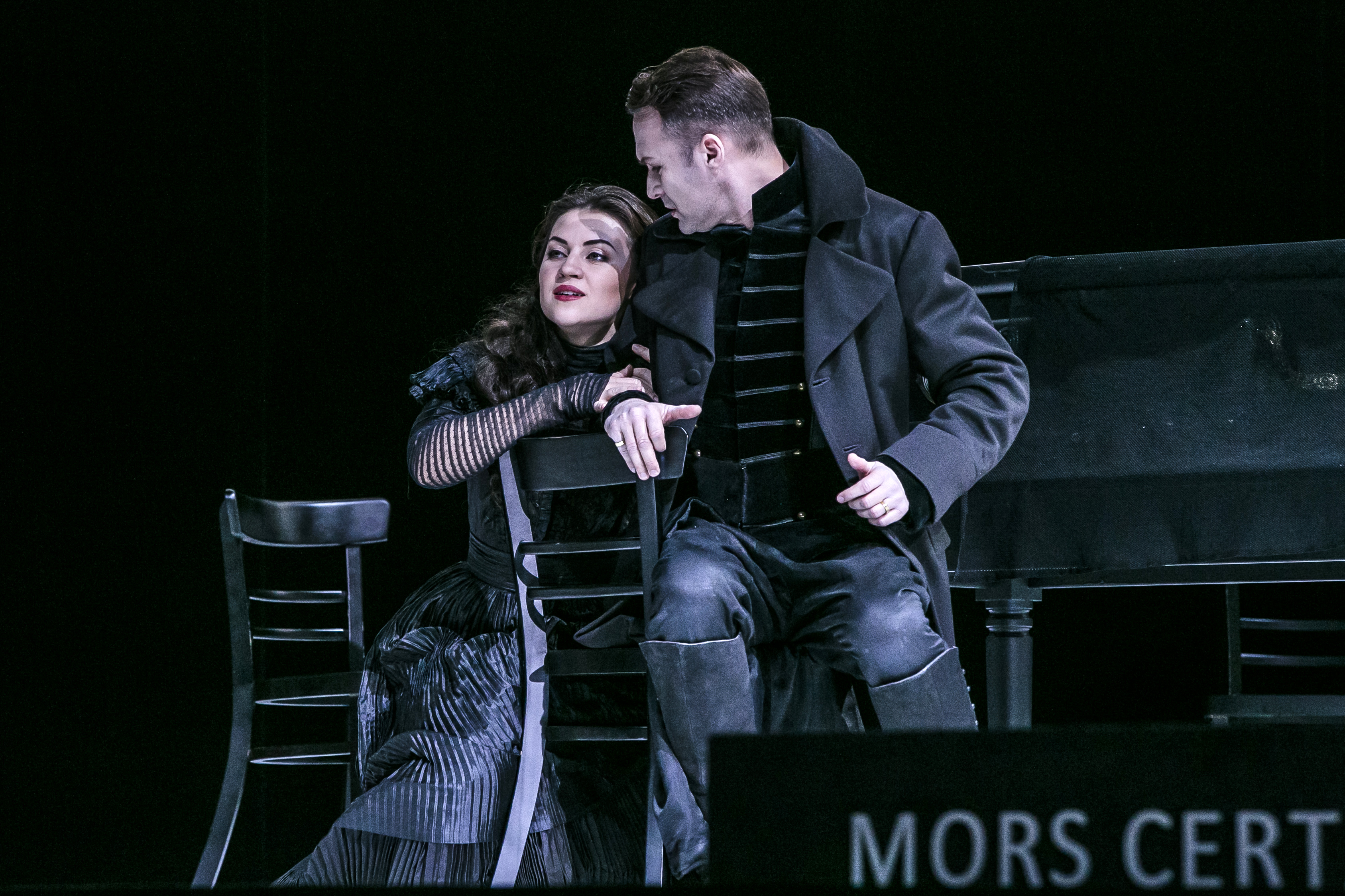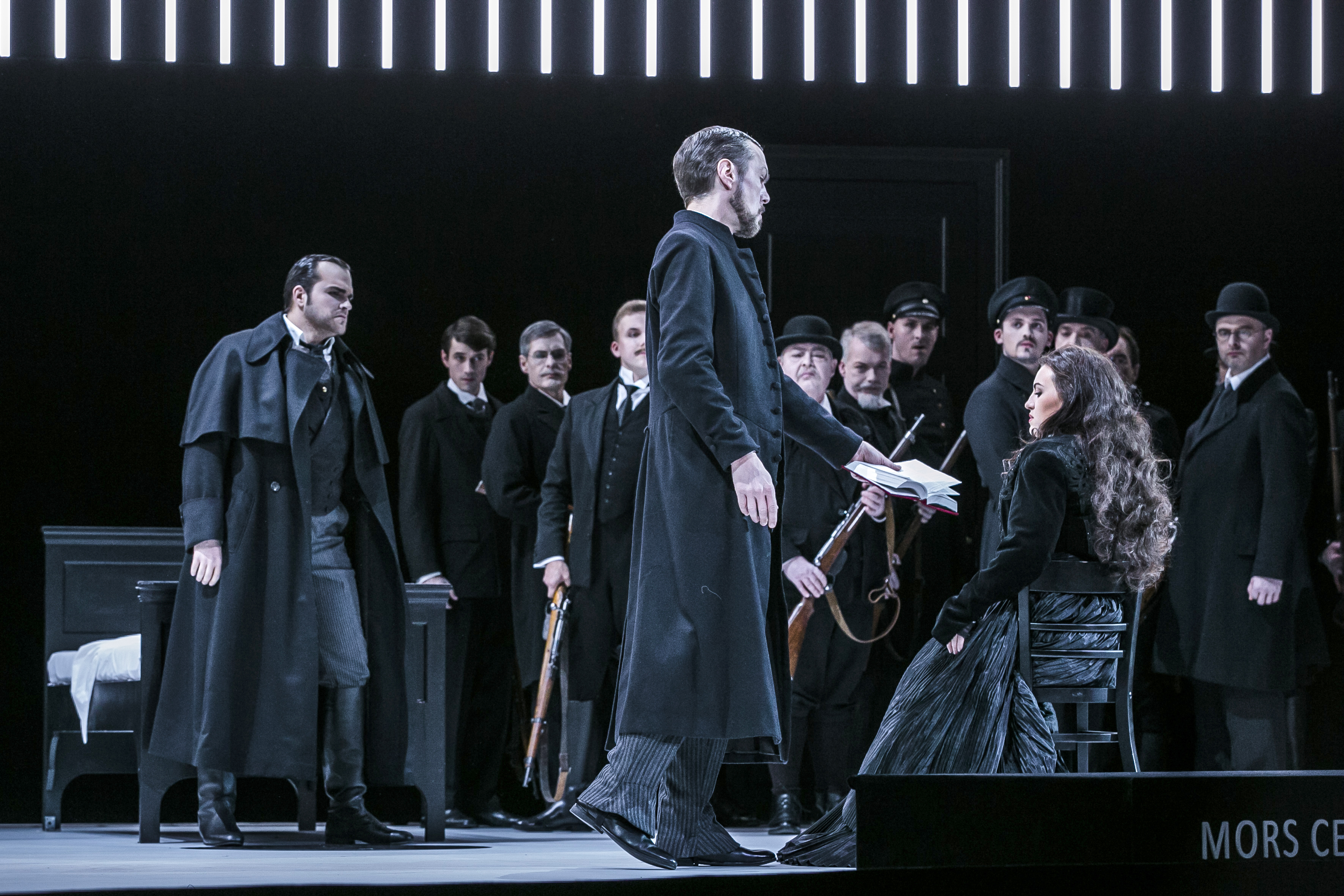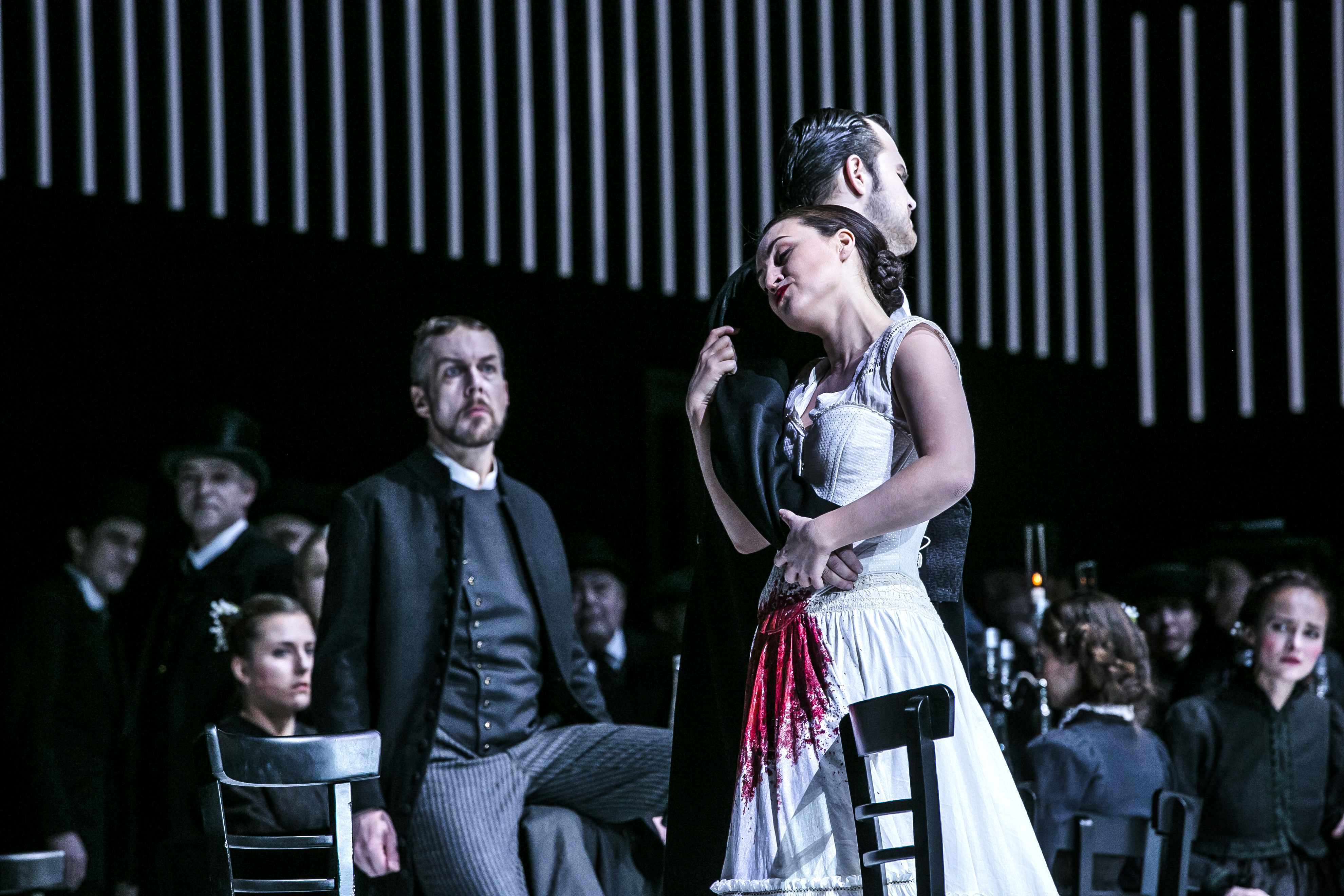 Hilsdorf is a name new to me although he is one of Germany’s more active stage directors since his operatic debut in Gelsenkirchen back in 1981. This was his Dresden debut. His staging is built on simple visuals. An open set, chairs arranged around the back, a long dining table along the side and rows of fluorescent strip lights along the back of the stage. The almost exclusively black stage furniture and black costumes give the visuals an elegance and clean simplicity that I found had the potential to work well, in that it gave the opportunity for the singers to guide the action. And yet it felt that characters were under-directed, usually staring into the middle distance, barely engaging with each other and the chorus was marched on, parked and then marched off again. Although I must say the man vomiting at the side of the stage after the mad scene did offer some visual interest. The constant presence of a bed at the centre of the stage held some symbolic value and provided the opportunity of a big reveal of Arturo’s body during the mad scene. The rows of lights at the back were migraine-inducing in their brightness and surely a warning should have been given to epileptics due to the way that they flashed as if replicating lightning in the Wolf’s Crag scene. The appearance of a ghostly figure as Lucia sang ‘regnava del silenzio’, brought back some traumatic memories of Katie Mitchell’s London Royal Opera staging – although the ghost was seen once and never returned thereafter. This was a society where nobody had privacy and it was impossible to be left alone. Certainly, at least until the final scene, where Edgardo is alone on stage, the chorus singing from the pit. It made for a strong finish and undoubtedly the strength of Hilsdorf’s approach is in the clarity of the visuals – even if what happens within those seems underdeveloped.
