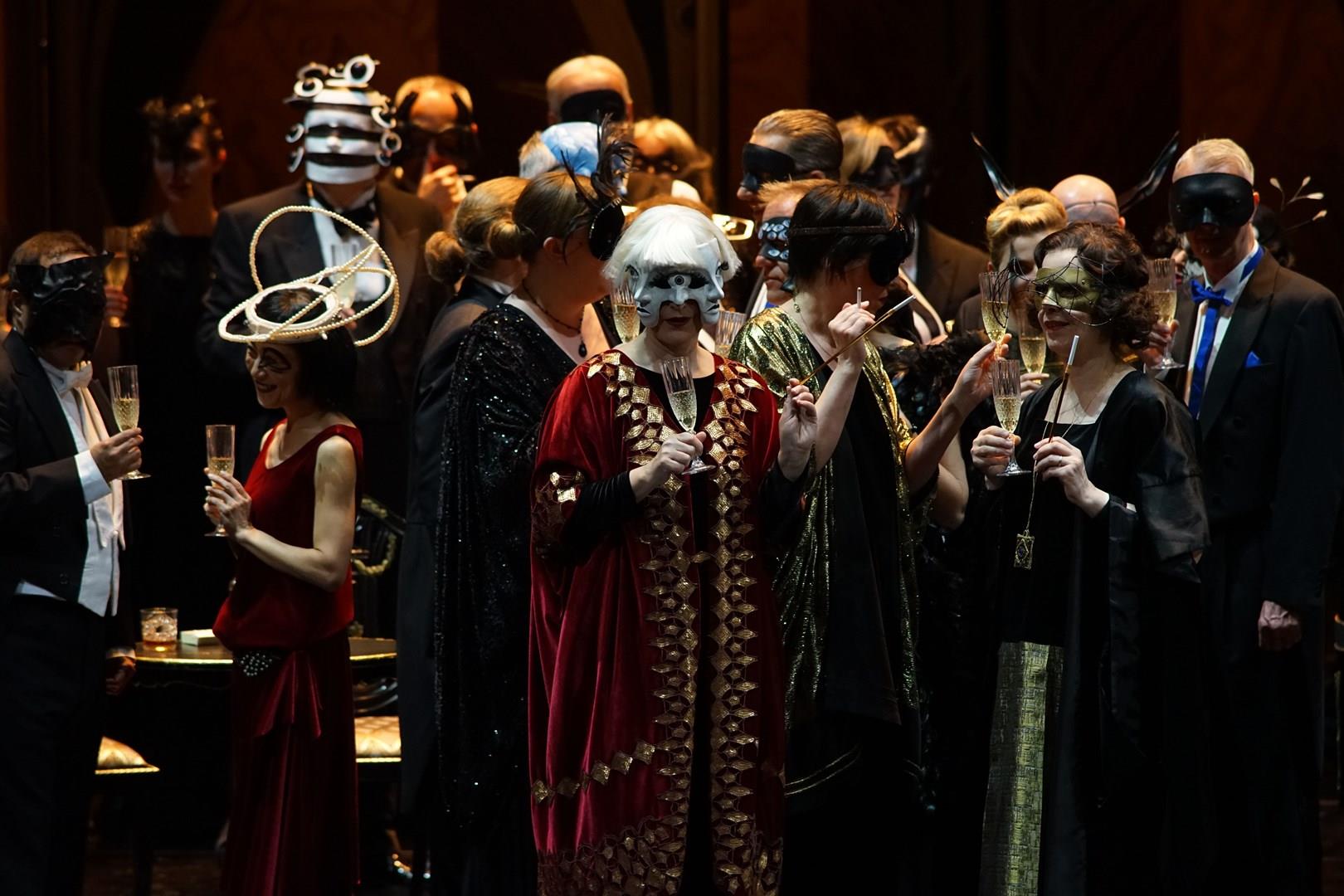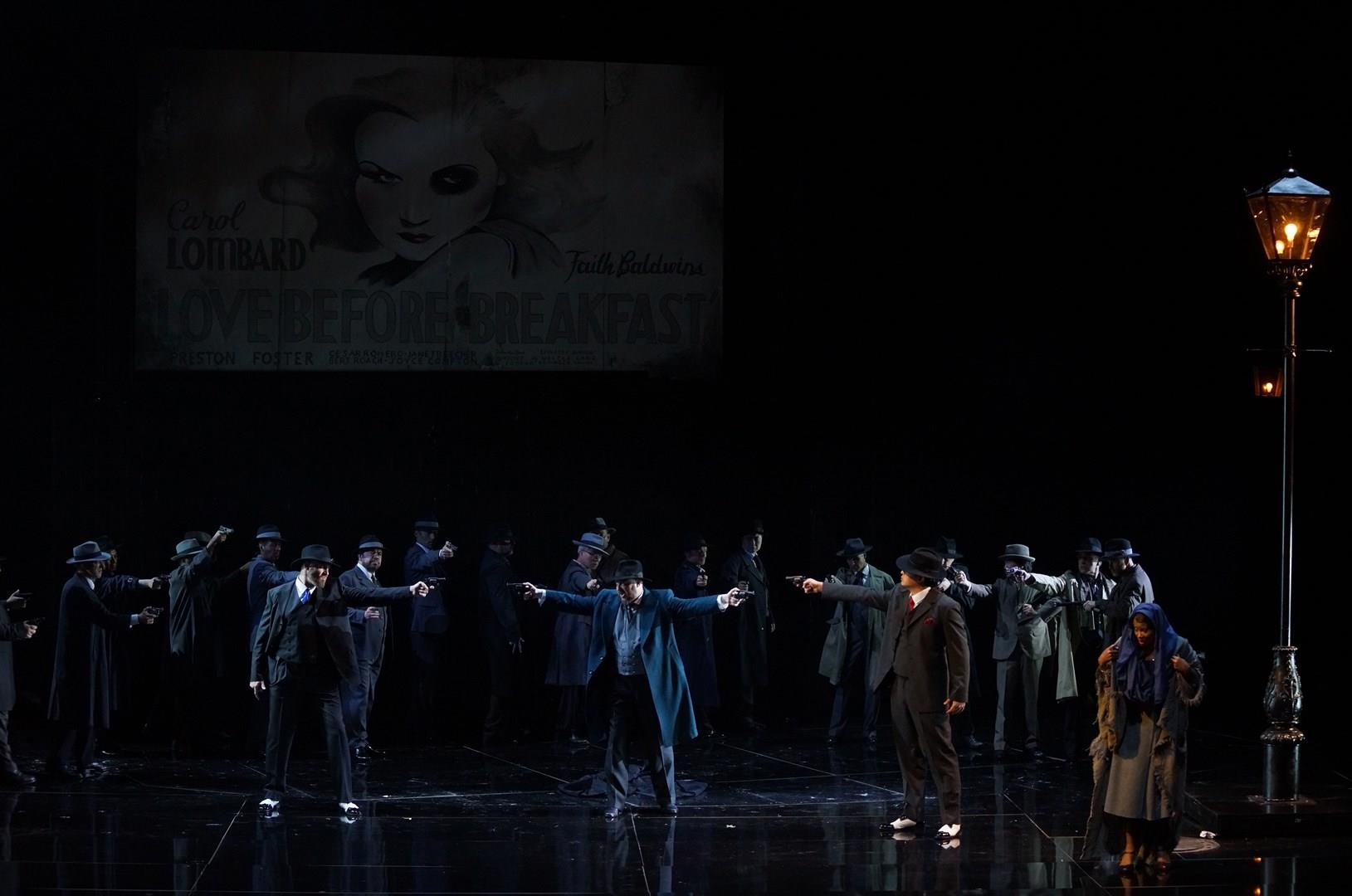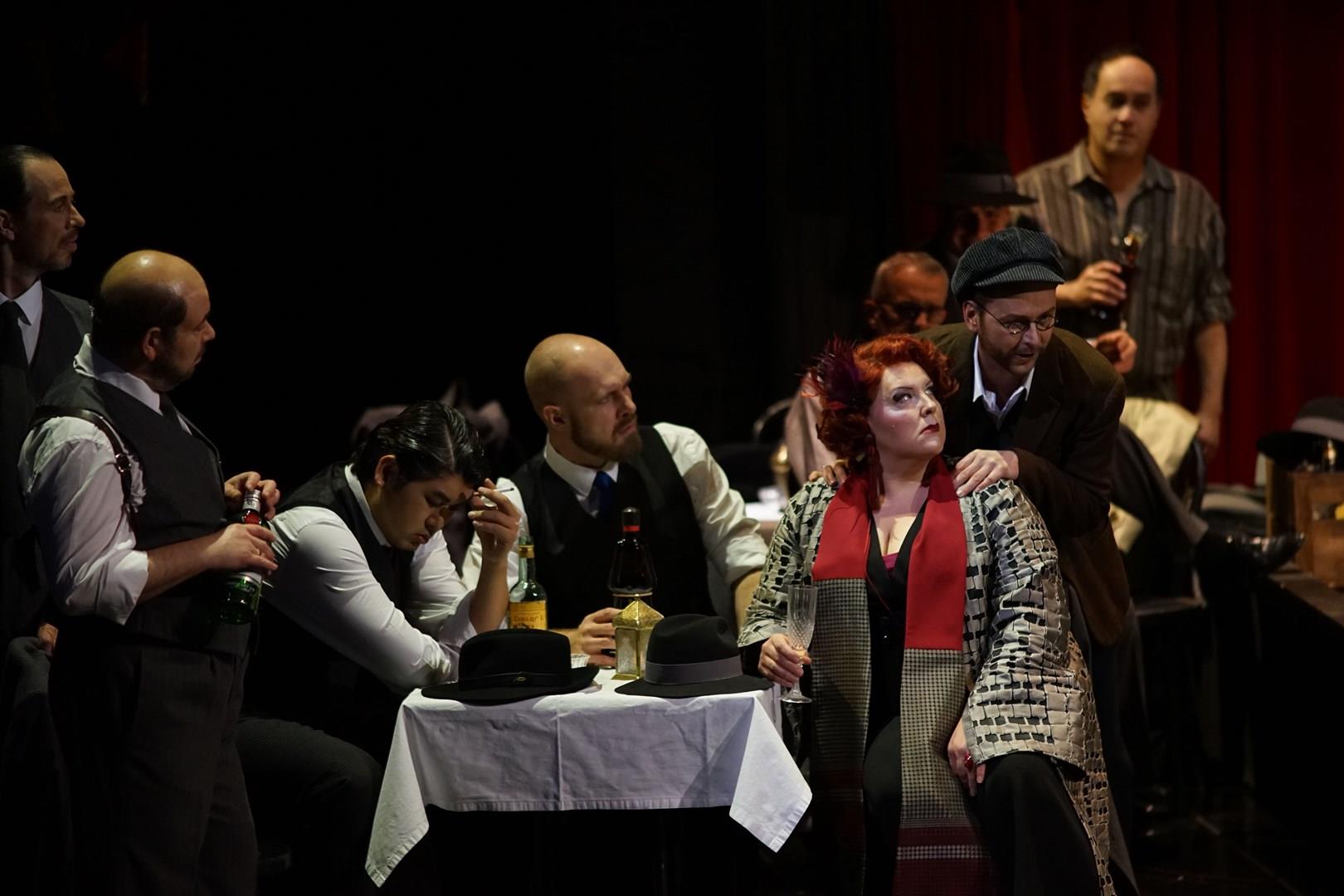 Savić sets the action in prohibition-era Boston. A shadowy place, where characters in hats and trench coats are ever-present, conspiring. Ulrica is a lounge singer with a side-career in fortune telling and illegal alcohol trading, as we see her both deliver her ‘re dell’abisso’ into a microphone and later dispose of the clandestine alcohol into a bucket. Riccardo and Renato could well be mob allies, initially in a turf war with others, before finally turning on themselves. The ball itself is held within an attractive art deco setting.