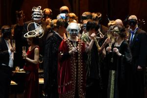 The remaining roles were well taken, with an especially honourable mention for Benjamin Russell’s handsomely-voiced Silvano. Albert Horne’s chorus was on good form with solid blend and a warmth of sound. The orchestra seems to have improved further since my last visit. Other than some sour tuning in the violins occasionally, the quality of the playing was more than satisfactory. The solo cellist played with heartfelt beauty as she duetted with Aaron’s Amelia in ‘morrò, ma prima in grazia’. Patrick Lange’s reading felt somewhat heavy. The string sound was quite full, whereas I felt that it ideally needed a lightness of touch and sharpness of attack. Tempi also felt a notch or two slower than ideal. Still, he marshalled his forces well and kept tight coordination between the off-stage banda and the orchestra in the pit.
