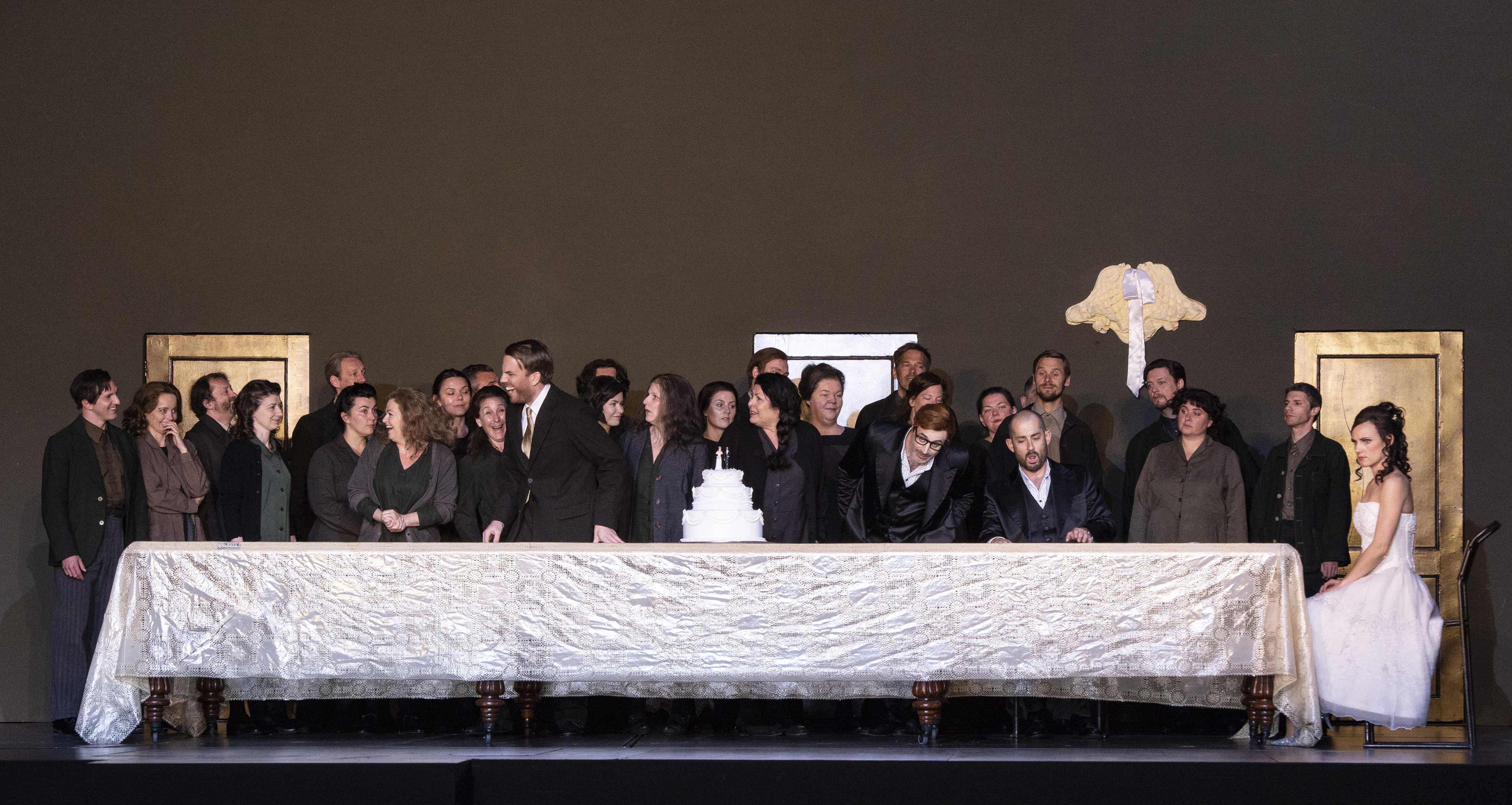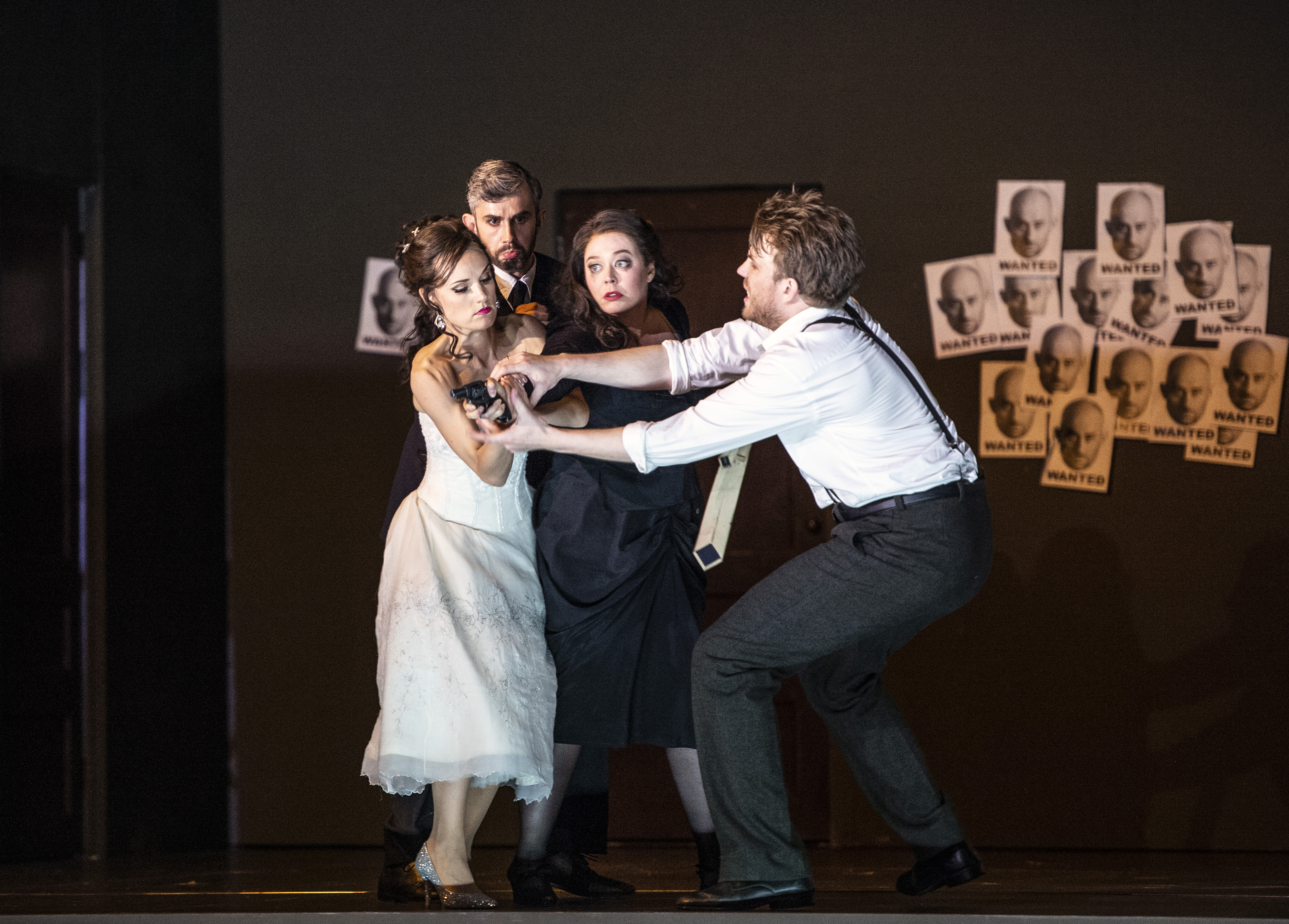 Richard Jones approaches the work as a parable of obsession. He isn’t the first to take a similar approach, and it draws parallels with Warlikowski’s even more radical Brussels staging in 2014. As the curtain rises, the audience is confronted with a proscenium-high image of Johannes Weisser’s Giovanni with a single word, ‘wanted’, underneath. But wanted how? That’s the question and the strength of Jones’ staging is that he turns that idea of wanting on its head. Rather than wanted as a criminal, Giovanni is in fact wanted as an object of desire, a canvas upon which each of the characters paints her or his own individual obsession. During the overture, we see a steady parade of ladies (and a gentleman) enter Giovanni’s room, emerging afterwards in an almost business-like fashion. In this 1950s setting, sex is transactional and kept hidden behind doors. The set is made of multiple doors, each potentially hiding a variety of sexual proclivities or Giovanni’s volumes of registers of his conquests. There is little tenderness between the characters – individuals seem to barely engage with each other. Anna has a fantasy of being taken by force and uses an encounter with Giovanni as a way of living this out. This fantasy, instead of a rape, becomes the catalyst for the drama. The Commendatore, himself enjoying an assignation in the next room, hears his daughter, rushes to her aid and is instead accidentally murdered. The murder triggers a series of events that exposes the hidden sexualities beneath the surface. Whether they be Elvira’s desperate search for a monogamous husband or Masetto’s need to satisfy his violent urges. That propensity to violence brings a sinister edge to ‘batti, batti’ for a Zerlina who is clearly working through her own issues.