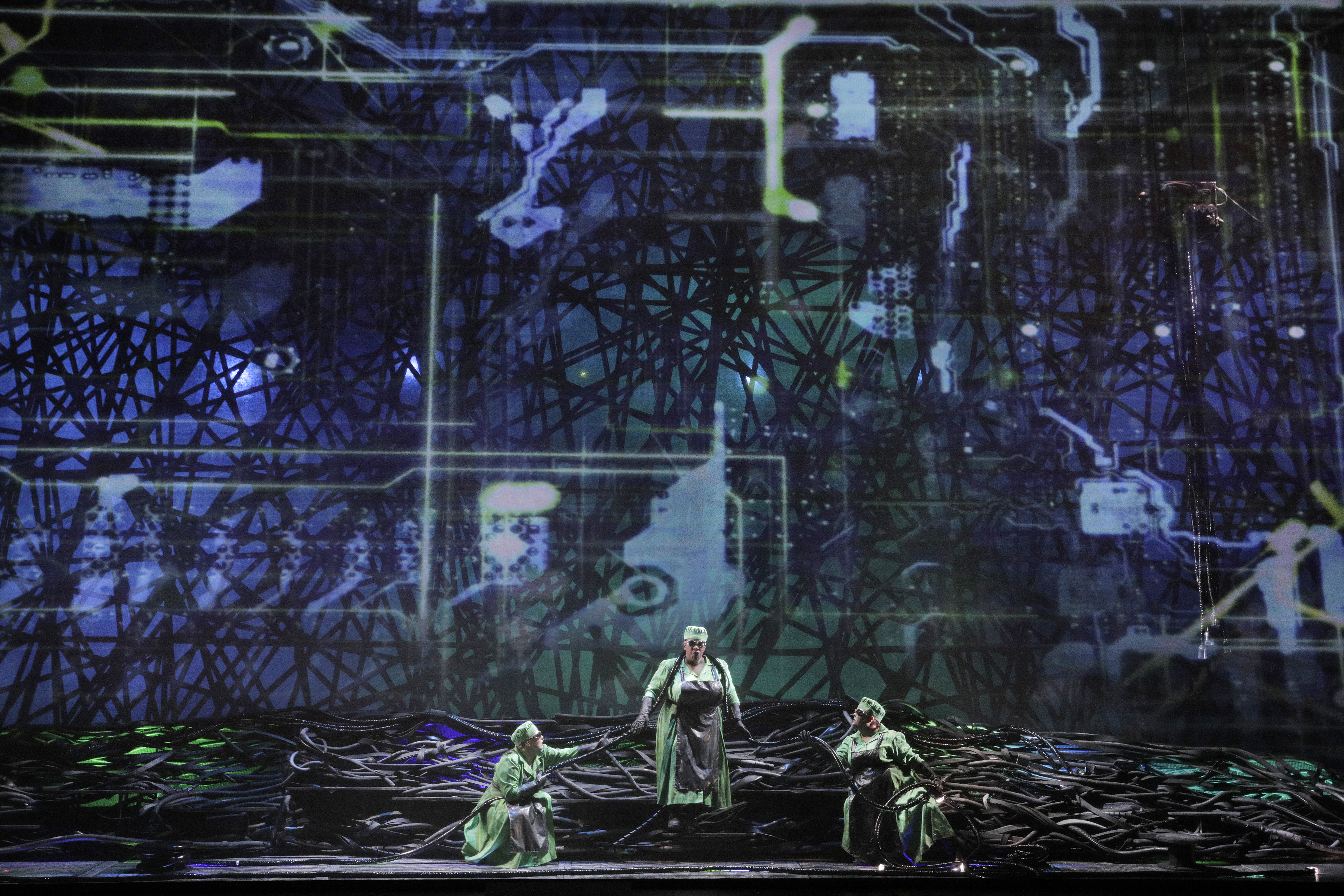 There were frustrations – and we should get these out of the way first. The chief frustration, as was the case throughout the week, was Francesca Zambello’s staging. This isn’t to say that it was without merits. As I have repeatedly written, it is undeniably visually impressive. Zambello not only has the imagination to come up with audacious stage pictures, she also has the ability to transform these pictures from imagination into reality. That is no small feat. The sight of the Norns spinning what appear to be computer cables or the imposing Gibichung Hall, all steel and glass, were both most memorable. More impressive still was the use of video projections to create an air of mystery in the Hagen/Alberich scene. The projections framed the action on screen as if looking at a badly-tuned television screen. It was visually fascinating. Yet, the ability to create these fascinating visuals can only be half the story and where Zambello’s staging has felt consistently disappointing is her seeming unwillingness to develop a cogent theatrical narrative. For instance, images of pollution in the video projections during the interludes or the Rhinemaidens living in a riverbed polluted by plastic bottles, suggest that she views the Ring as an allegory of the exploitation of nature. This feels tagged on as an afterthought rather than a consistent thread throughout the work. Similarly, in a post-#MeToo era, the treatment of women in Götterdämmerung is something that could form the basis of a very interesting staging. There is the kernel of an idea here. The women appear to be mistreated by Hagen’s vassals, Hagen himself seems to be mistreating Gutrune, feeling her up just before Alberich appears, and of course there is the forced marriage of Brünnhilde to Gunther. In the closing tableau we see the chorus ladies and the Rhinemaidens depose of the arms used by the Vassals into Brünnhilde’s pyre. There is a point here – women making a world abused by men better. The problem is that, as with so many of Zambello’s interesting ideas, this is just briefly exposed and felt tagged on rather than developed coherently throughout the evening. The comparison between Bieito’s Stuttgart Parsifal, a staging that takes a similar line, is telling. There it felt that ideas were developed into a convincing theatrical argument. Here, it felt like an afterthought.