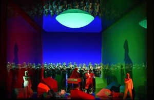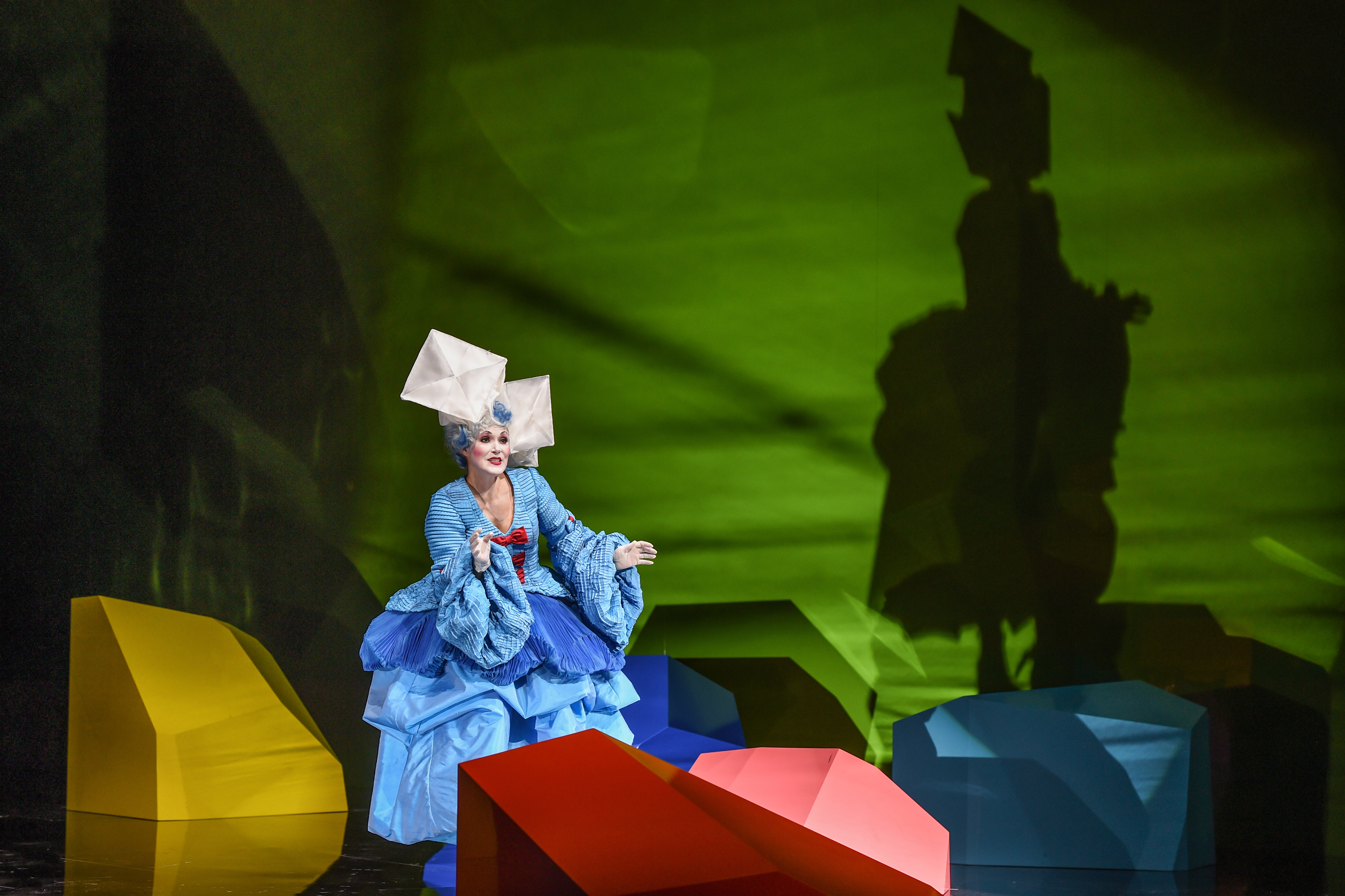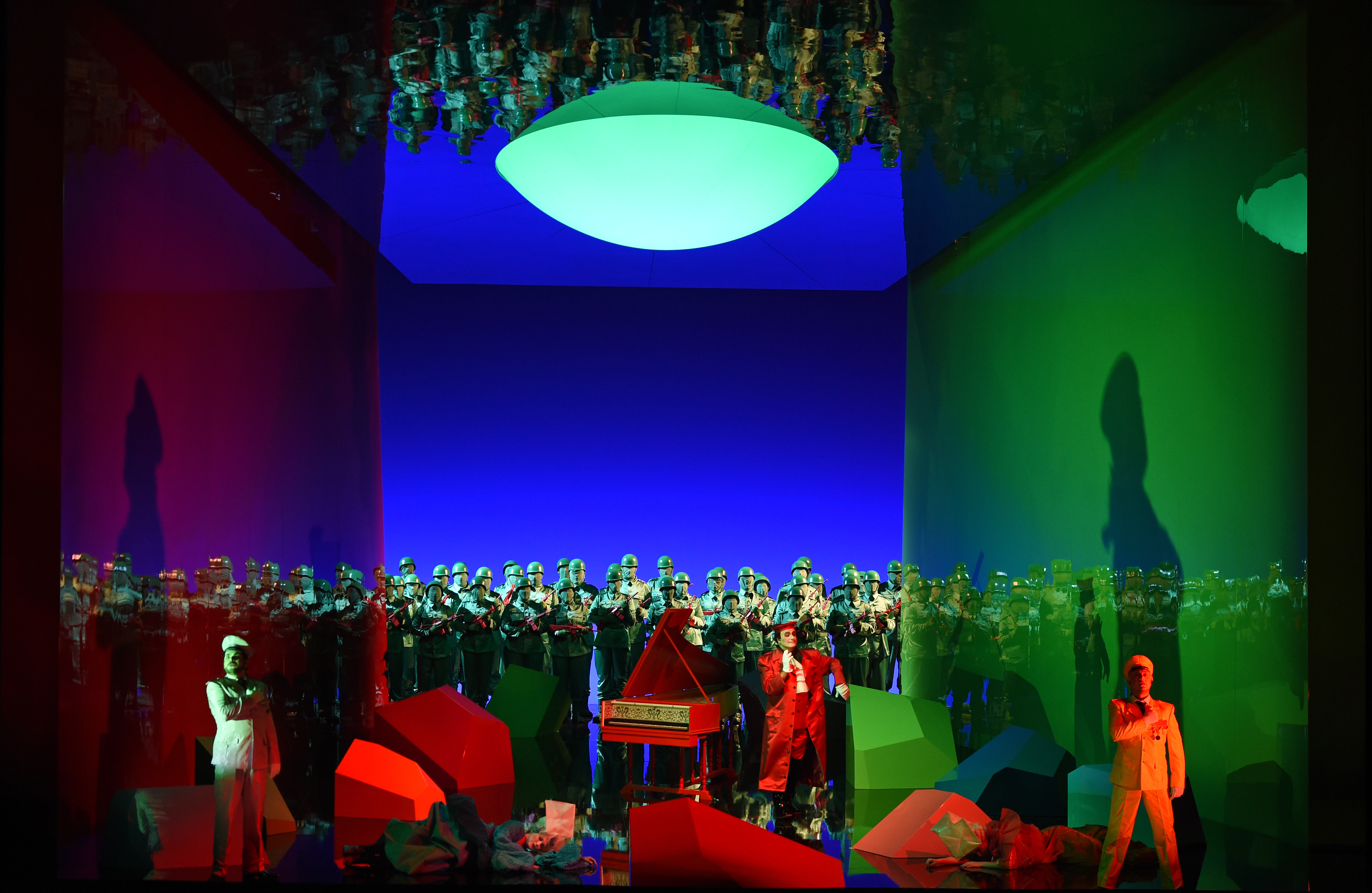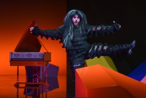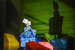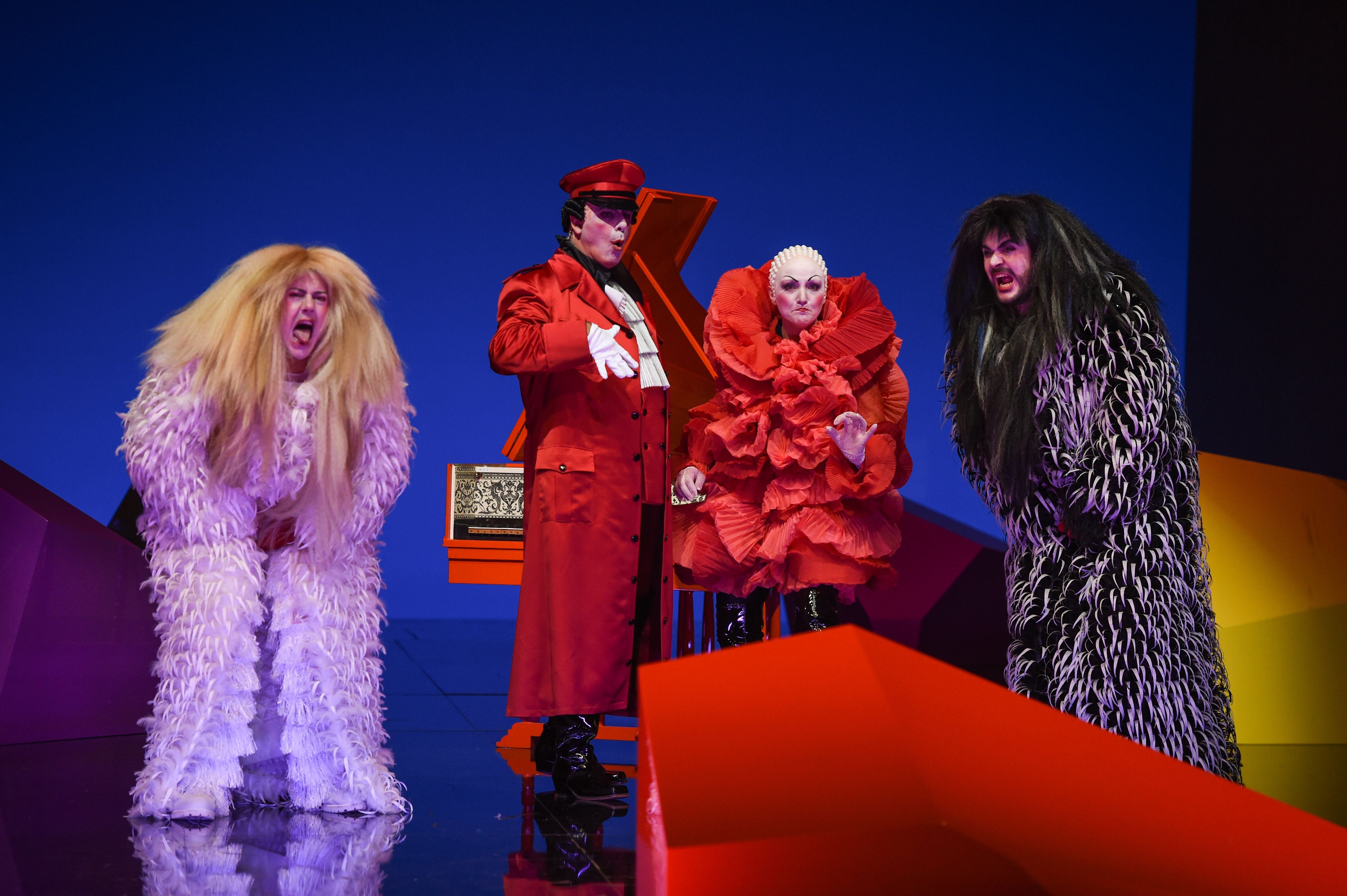 Surprisingly, it felt that Fritsch’s reading was not one that delved deeper into the text – that questioned the characters’ motivations and highlighted those feelings so vividly illustrated in the score. Instead, Fritsch gave us a commedia dell’arte interpretation, with the cast dressed in bright colourful costumes (Victoria Behr), the ladies wearing frilly dresses, while the ‘Albanians’ were dressed up as a cross between extras from Game of Thrones and a 1980s heavy metal band. The result is a vision of the work, which for this spectator at least, remains skin-deep. The commedia dell’arte setting means that Don Alfonso becomes an Arlecchino figure. Fritsch plays the work for laughs and in so doing succeeded in winning over the audience, who rewarded him with an enormous ovation at the curtain calls. His direction of the singers is extremely precise – the constant moving around the stage is executed with remarkable accuracy. Particularly so when, before the curtain rose, we were informed that Ida Aldrian’s Dorabella was a very late replacement for the originally-cast Stephanie Lauricella. Aldrian had managed to learn this complex staging in three days, compared to the seven weeks her colleagues had had. The set (also Fritsch) was centred around a single harpsichord, in turn surrounded by blocks of various colours. Interestingly, the harpsichord seemed to be manipulated remotely by Don Alfonso and at times, the recitatives were accompanied by the remotely-controlled harpsichord, at others by the fortepiano from the pit. It struck me initially that this was meant to represent Alfonso’s invisible influence on events, the proverbial elephant in the room, but its use seemed to be more random than logical.