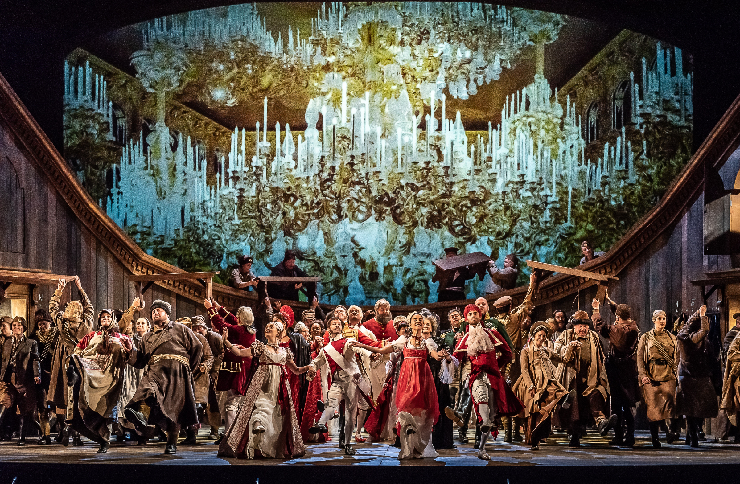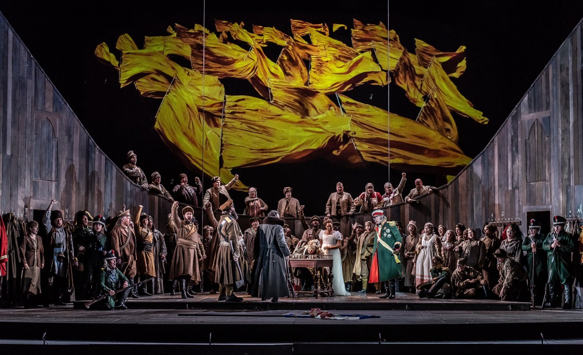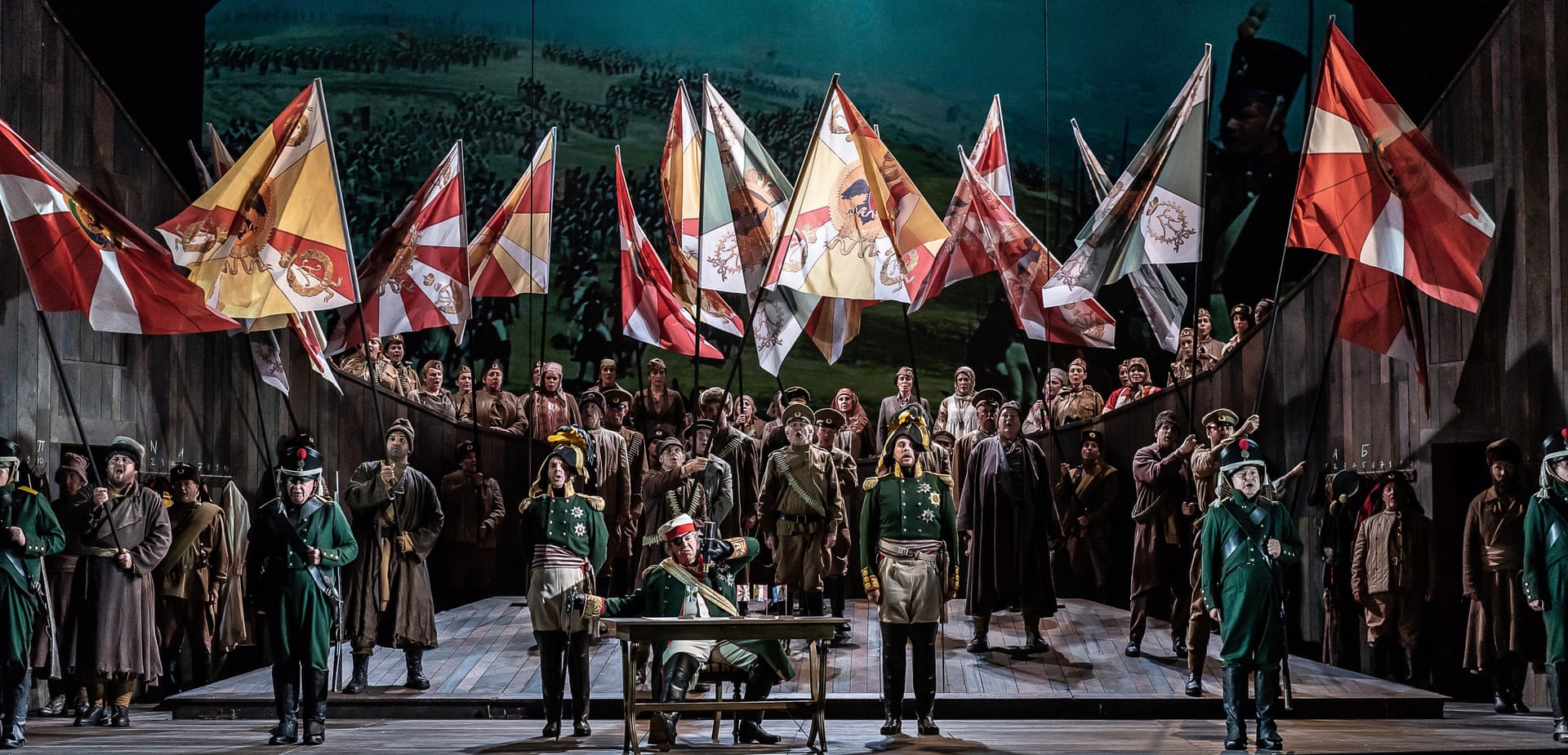 The opening scene of David Pountney’s new production of War and Peace for Welsh National Opera at the Wales Millennium Centre certainly made an impact. As the audience took their seats, the chorus could be seen milling around on stage. Suddenly, as if from nowhere, the house lights went out and the massively committed WNO Chorus pretty much blasted everyone out of their seats with a paean to Russian fortitude in the time of war. It certainly made for an arresting start to the evening. It took a little while for the ear to acclimatize to which language they were actually singing in. For this production Pountney, also WNO’s Artistic Director, chose the new critical edition of the original version by Katya Ermolaeva and Rita McAllister, in an English translation by McAllister.