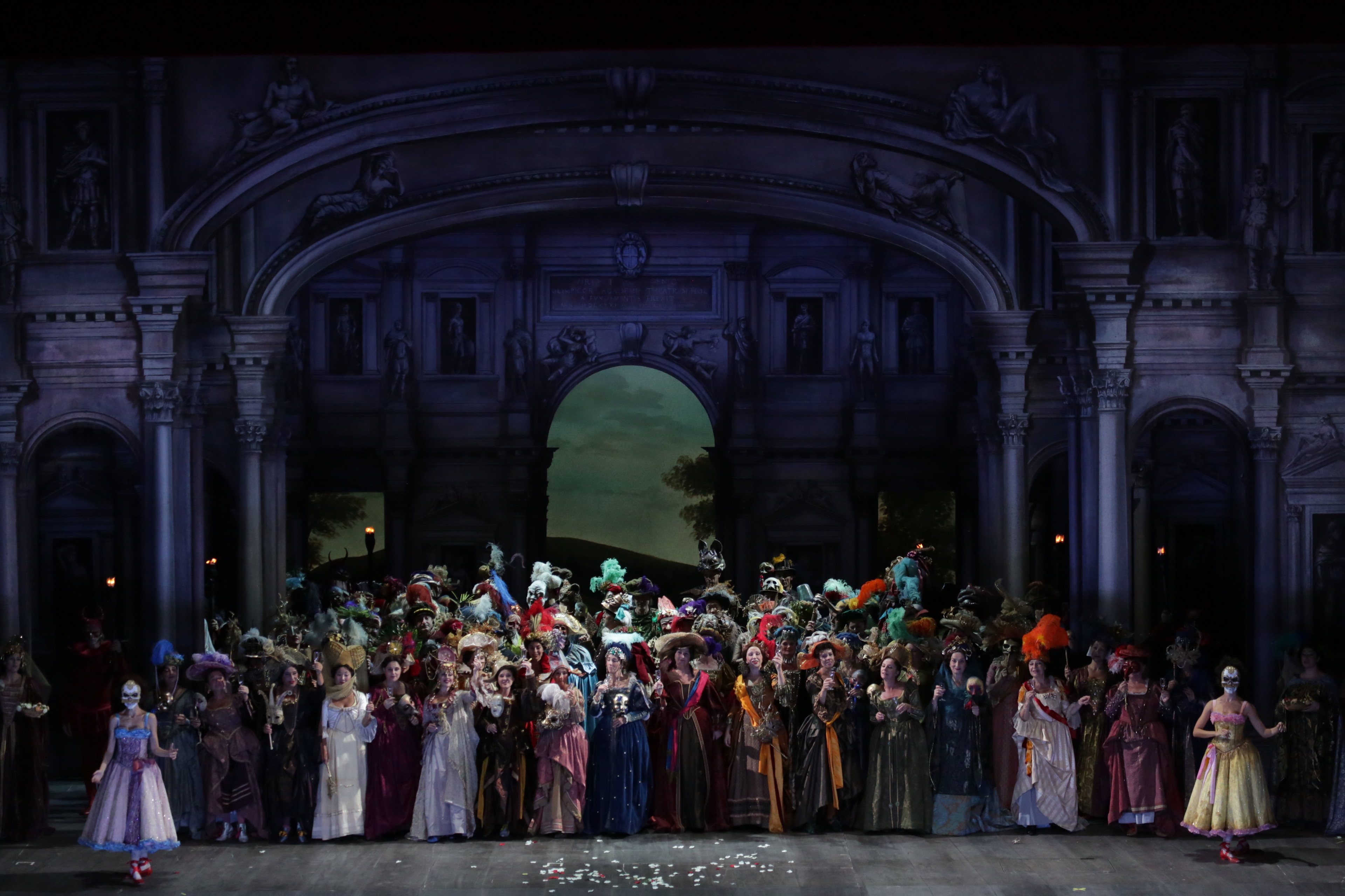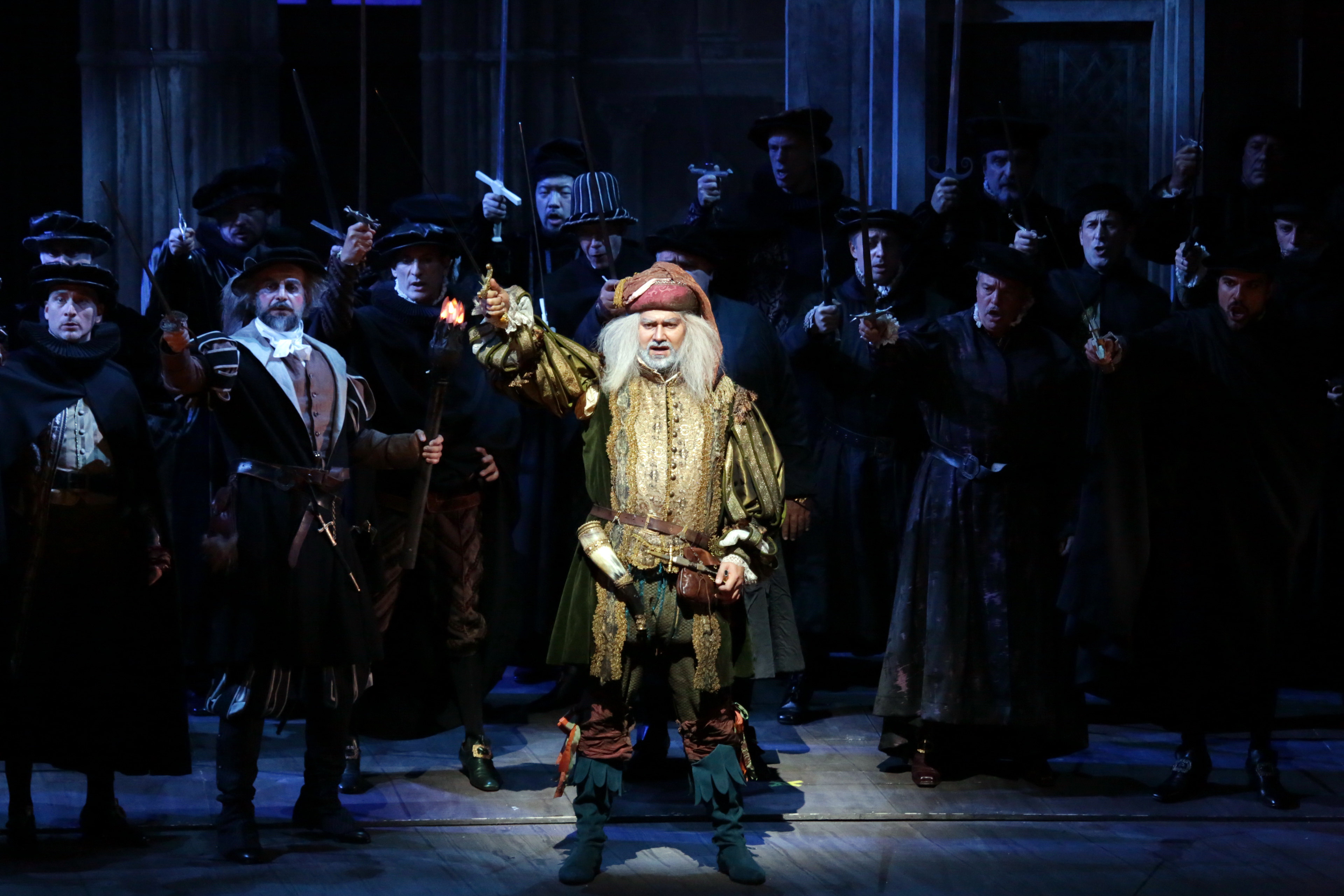 Bechtolf’s staging harkens back to an earlier era – one where the prima donna walks around as if in a trance, arms outstretched, and artfully falls to the floor when required. It’s hard to know if Bechtolf is being ironic or whether he’s, in fact, absolutely serious. I’m still asking myself what the pair of lady dancers were doing, as they gyrated in front of the chorus whenever they were parked on stage. Was it in fact some kind of post-modern interpretation of what Bechtolf believes the Milanese audience might be looking for? The principals were similarly parked on stage, delivering their numbers to the front. Costumes (Kevin Pollard) were very traditional, with long, frilly dresses for the ladies, accessorized with some monumental headdresses. Indeed, Elvira’s wedding outfit was so magnificently decadent that I have no doubt it would be coveted by the entire line-up of RuPaul’s Drag Race. The sets (Julian Crouch) were either cardboard or fabric, dropping from the files when required, and blowing excitingly in the wind whenever large groups of people were moved off the stage quickly.